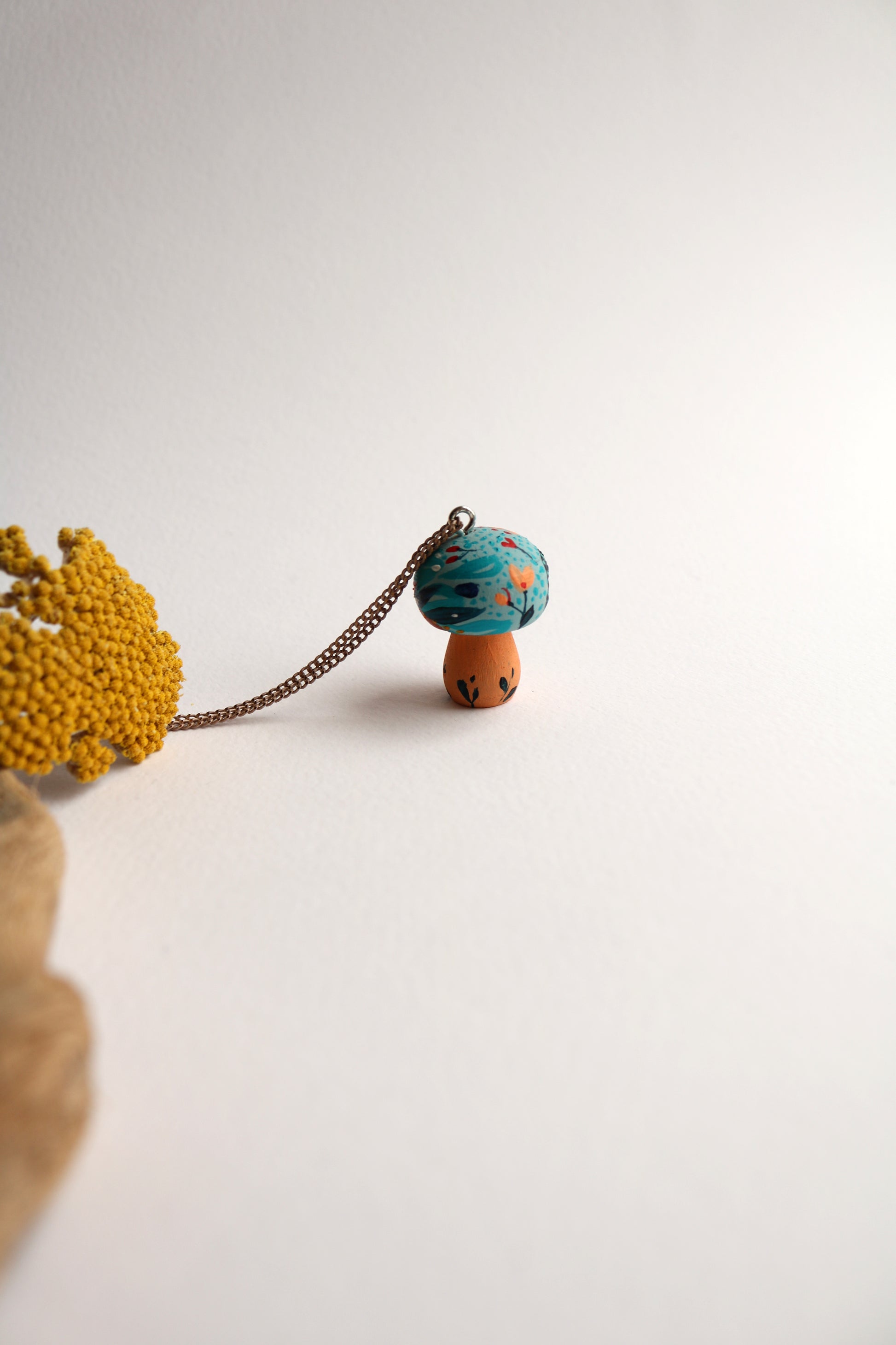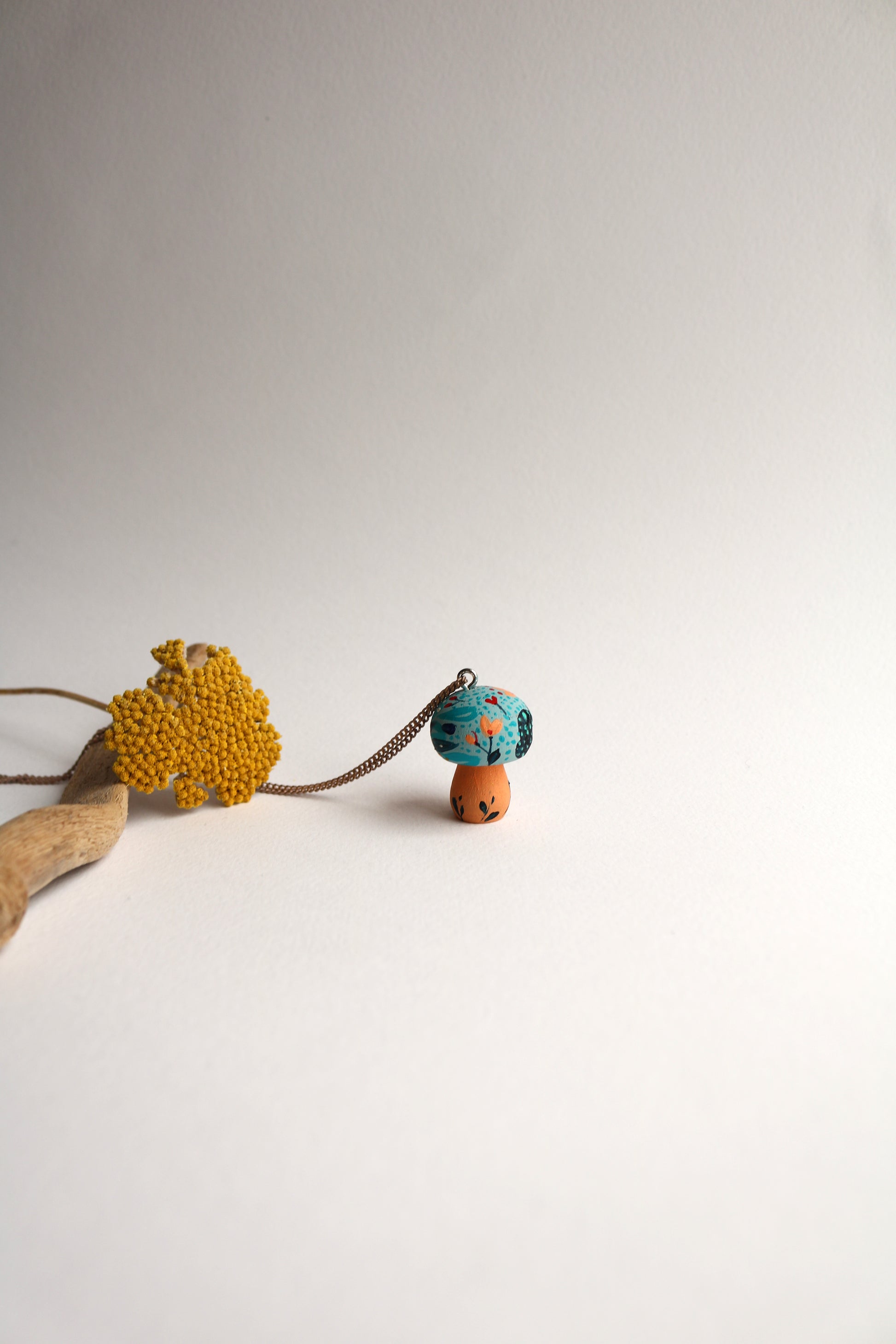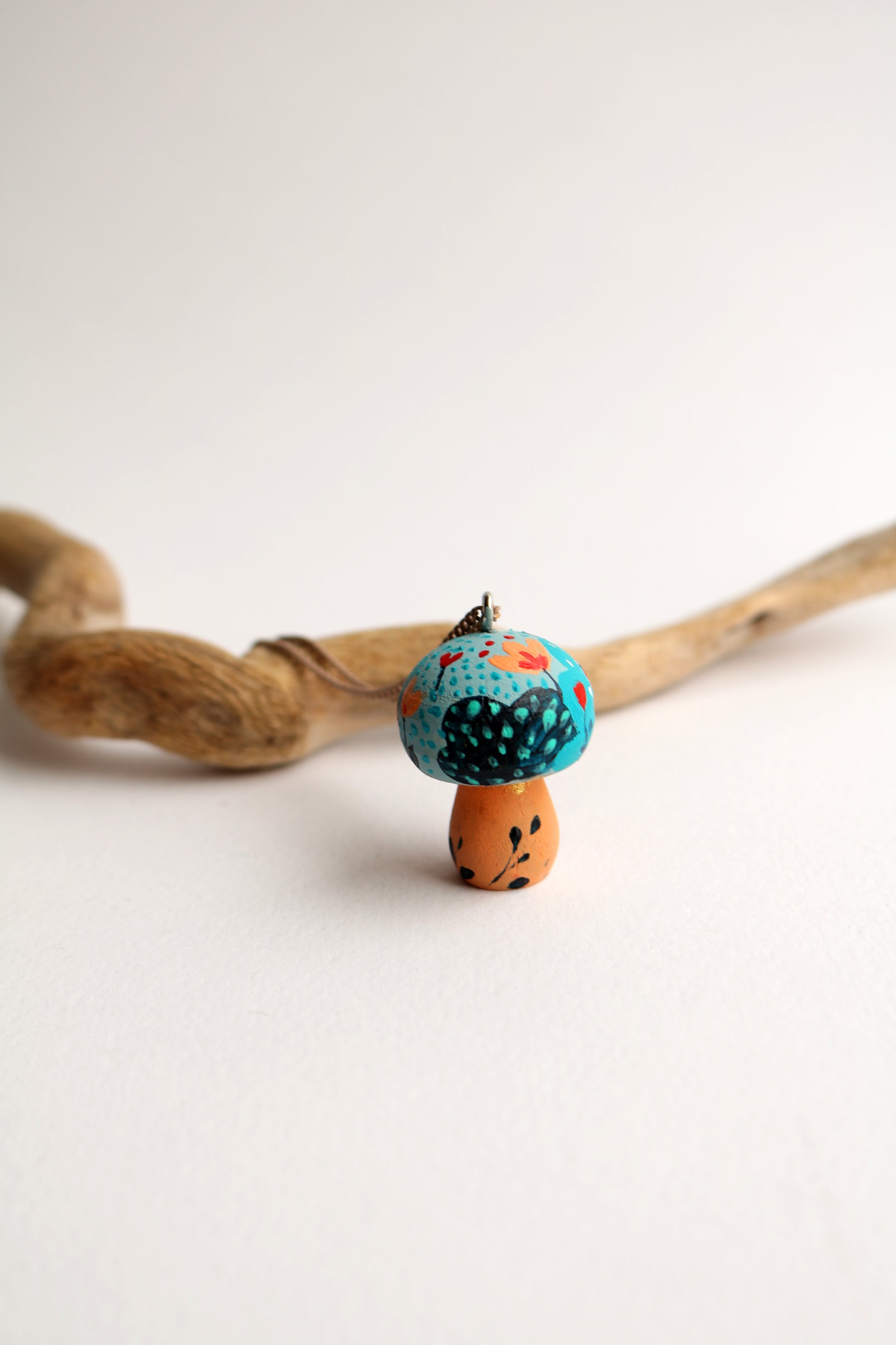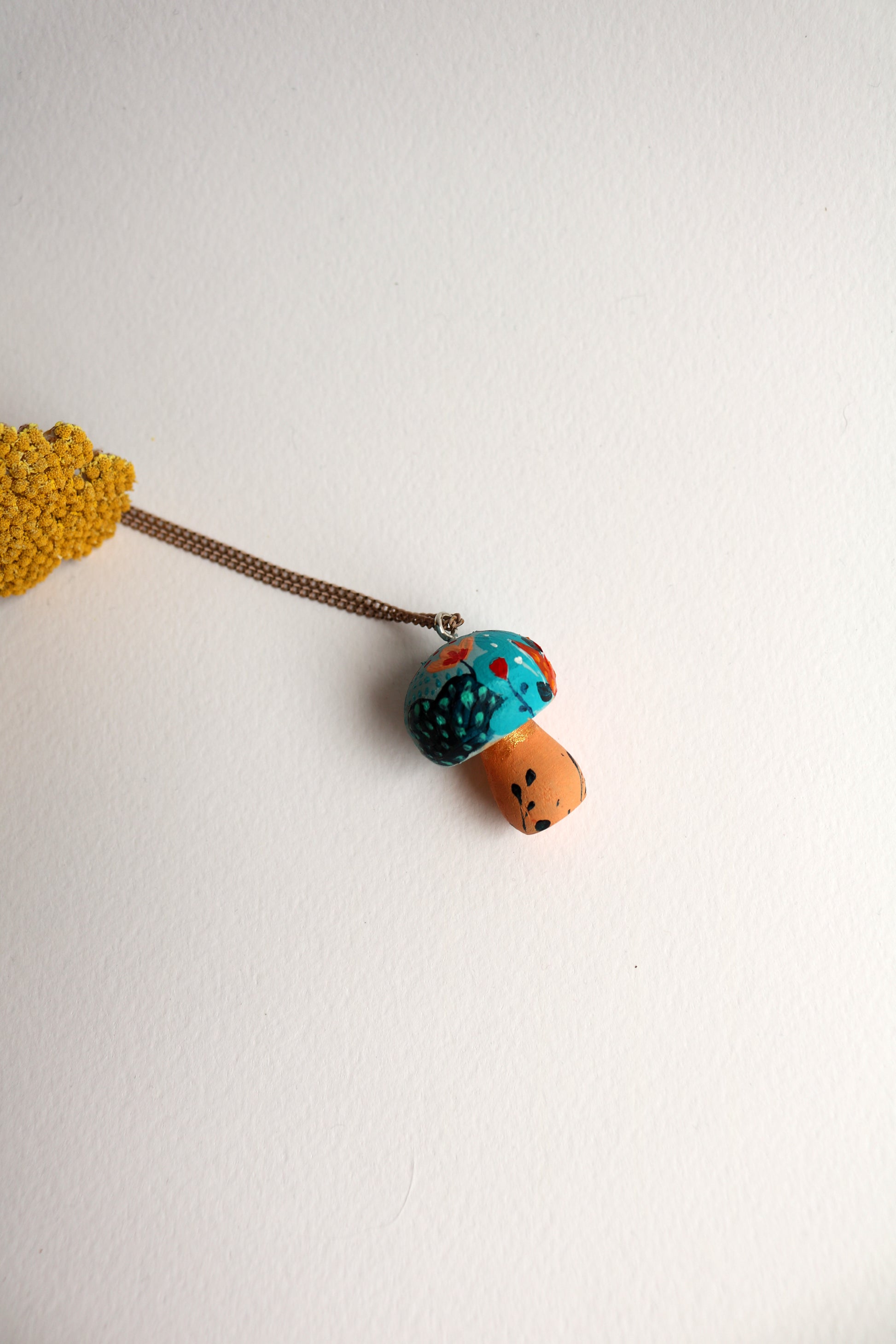 Всяка гъбка е превърната в малко произведение на изкуството – рисувана от художничката Милена Неделчева с нежни флорални мотиви в ярки, контрастни цветове.Верижката е метална, в бледорозов цвят. Този гердан е чудесен подарък за любители на природата, изкуството и ръчното творчество.