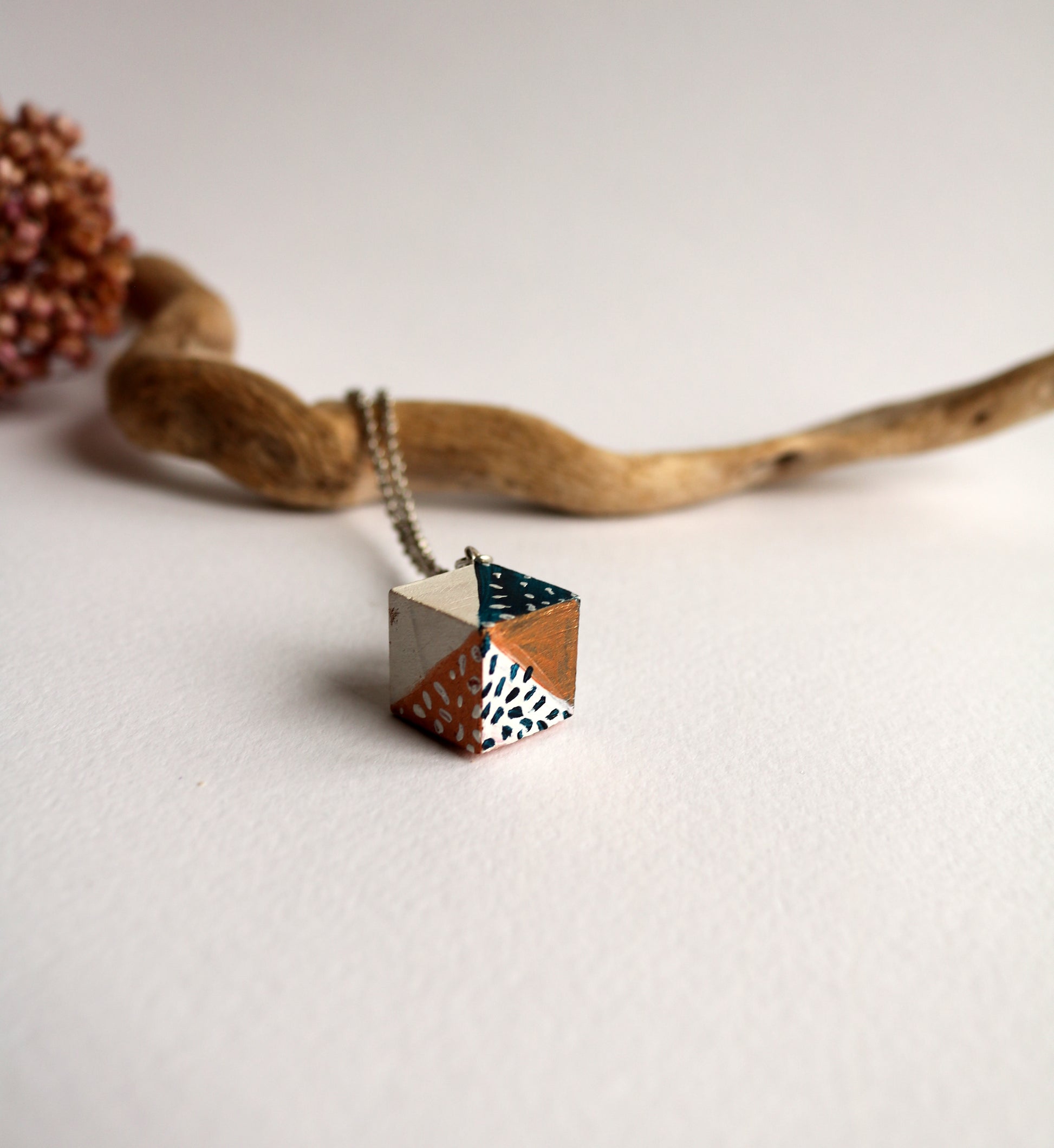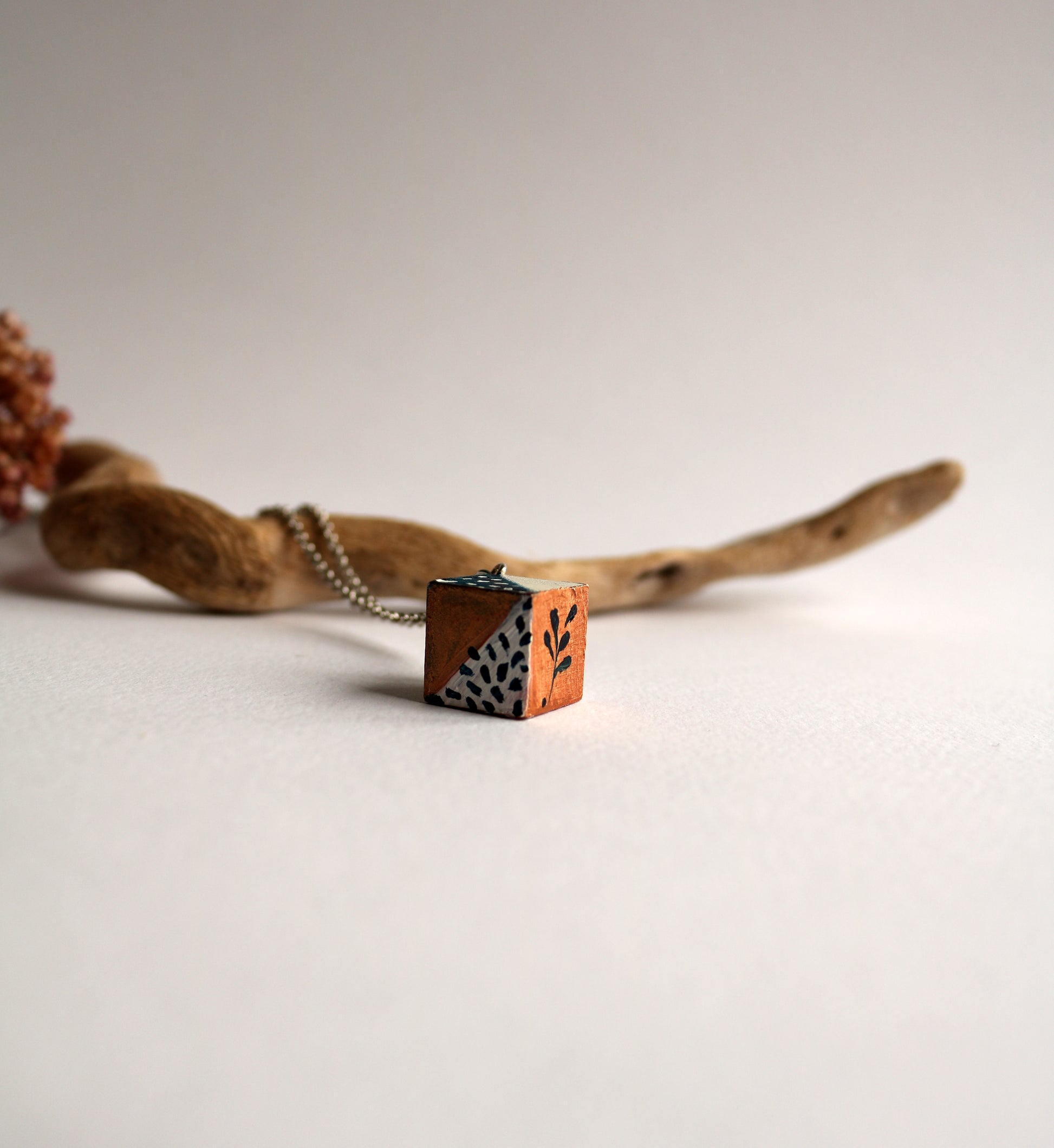 Нежен гердан във формата на куб. Различен, красив и много вълшебен. Ръчно изрисуван от прекрасната Милена Неделчева. Комбинация от цветя, точки и сърце. Може да носите това цветно вълшебство навсякъде с вас.