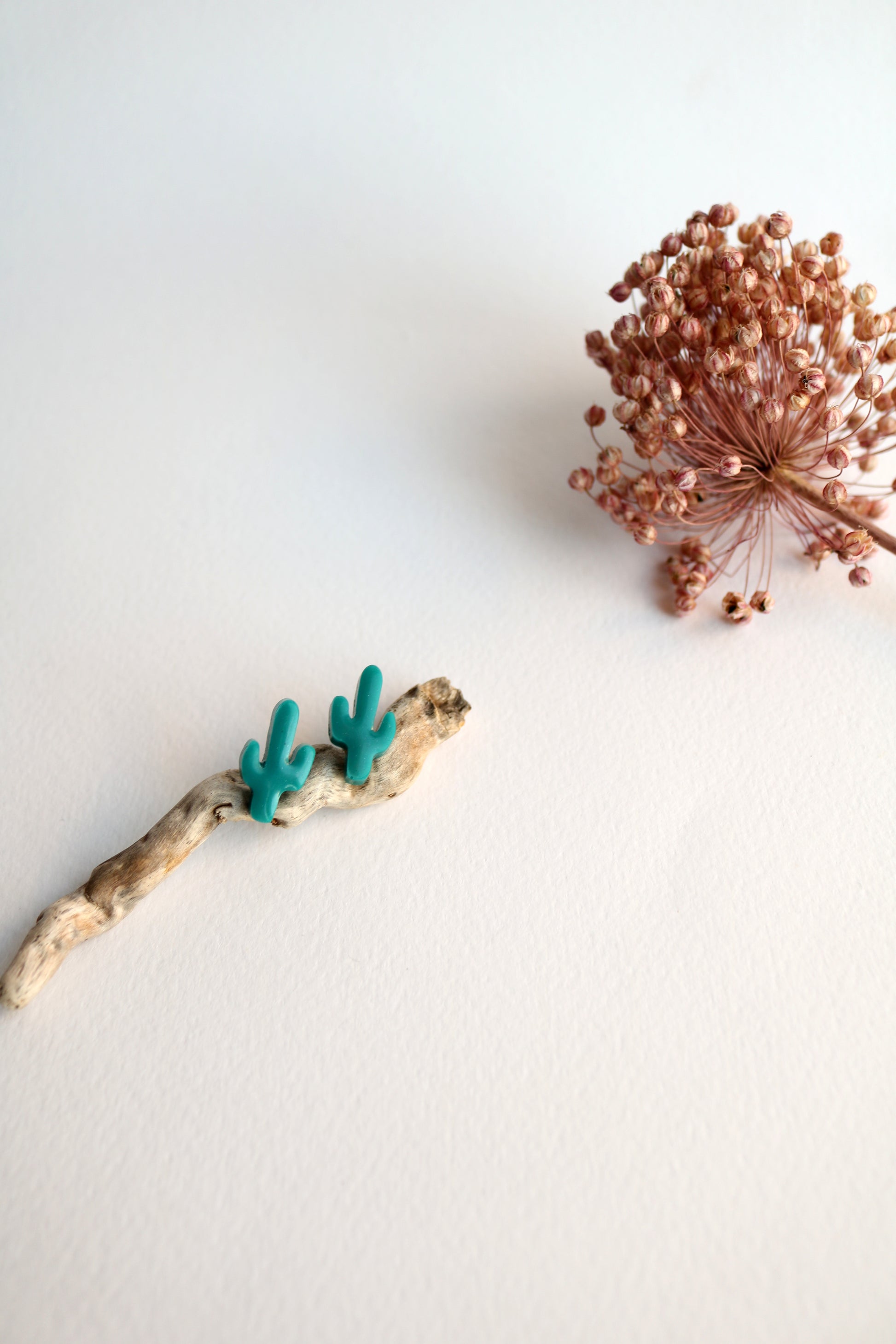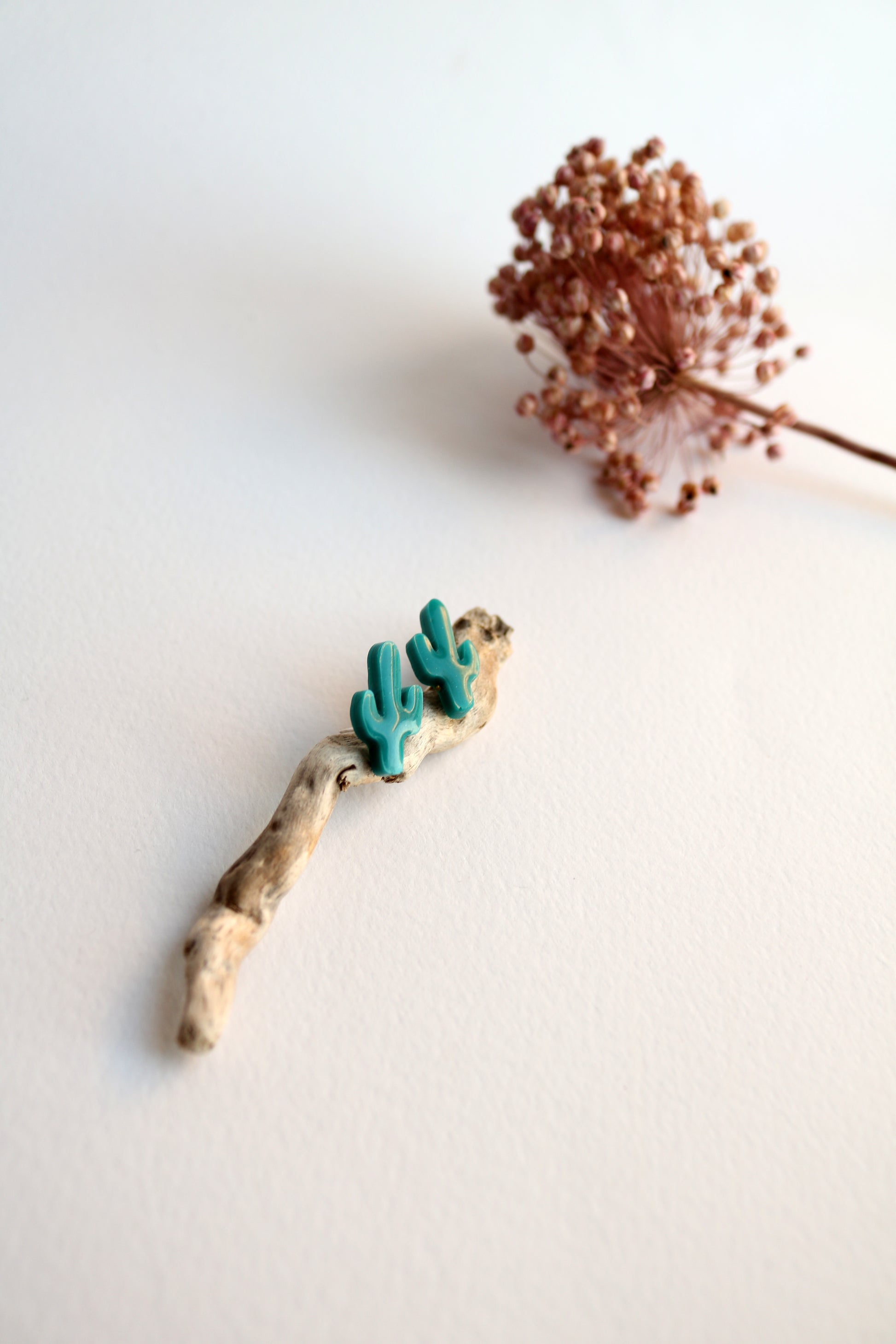 Нежни обеци във формата на кактуси. Изработени от епоксидна смола. Щифтове от неръждаема стомана. Допълват всяко облекло.
