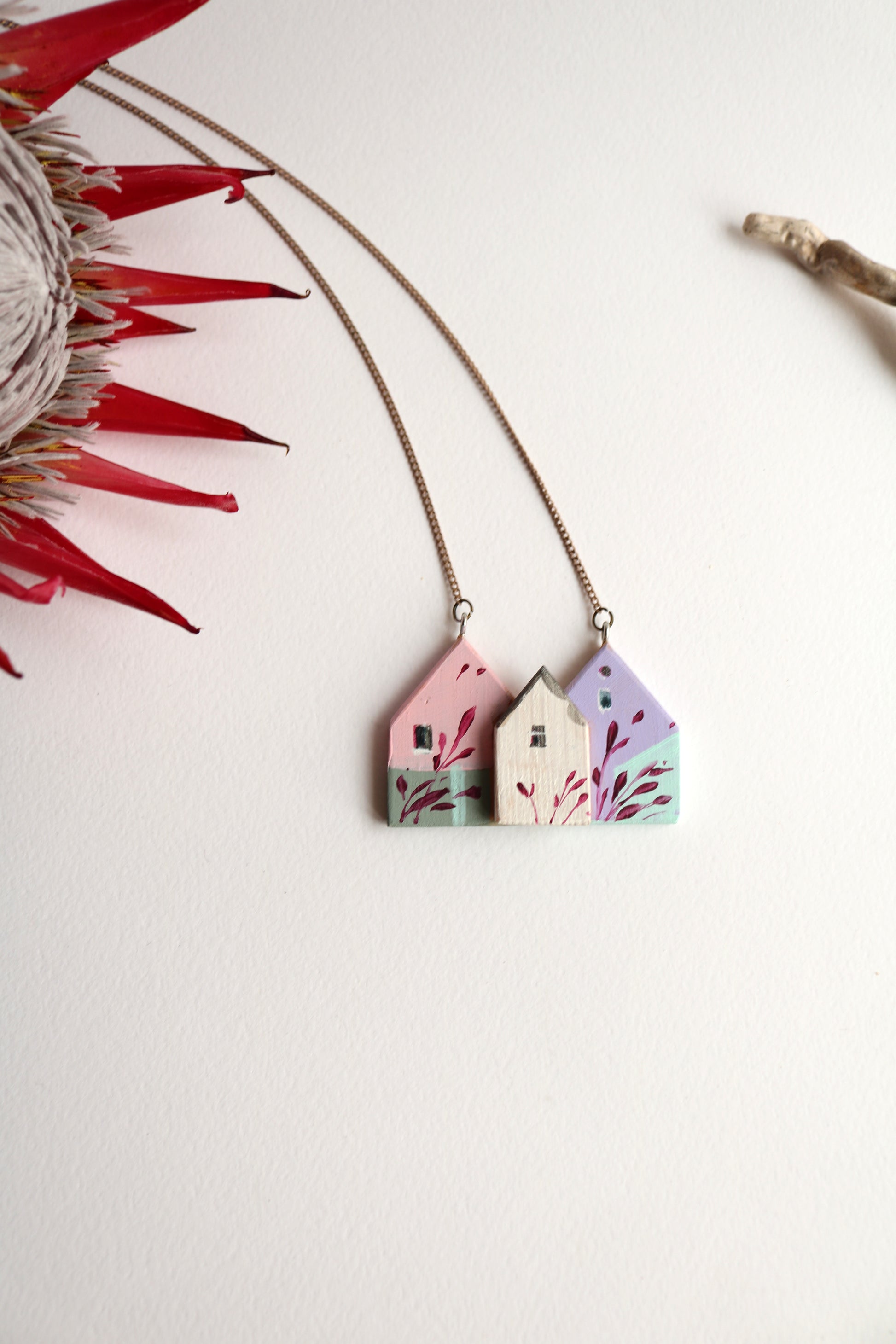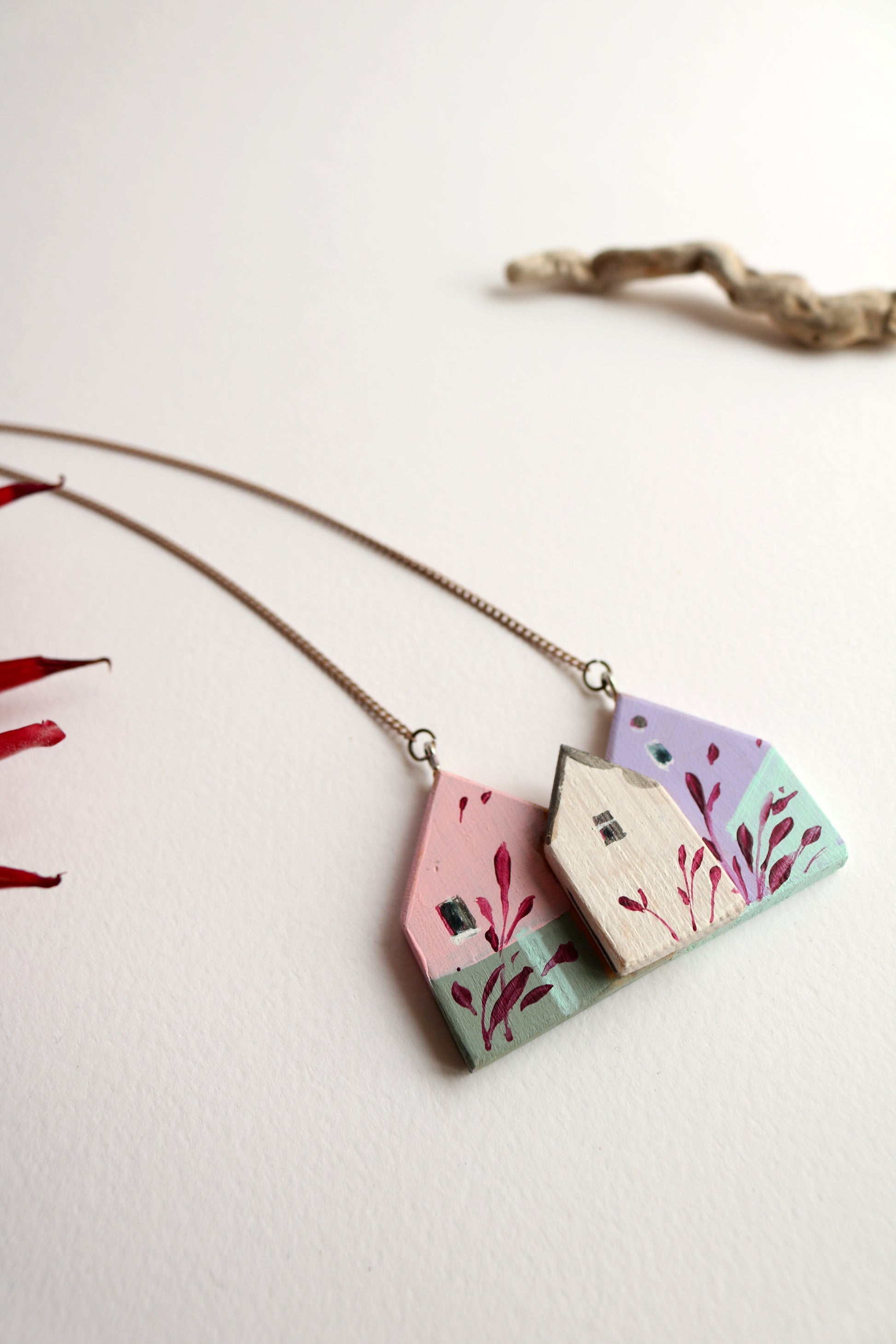 Прекрасен гердан изрисуван от Милена Неделчева. Този квартал е цветен, зареден с усмивки и готов за приключения. Изработени от дърво, оцветени в нежни цветове. Верижка от метал, с дължина около 40 см. Чудесен акцент към всяко облекло или прекрасен подарък за специален повод.