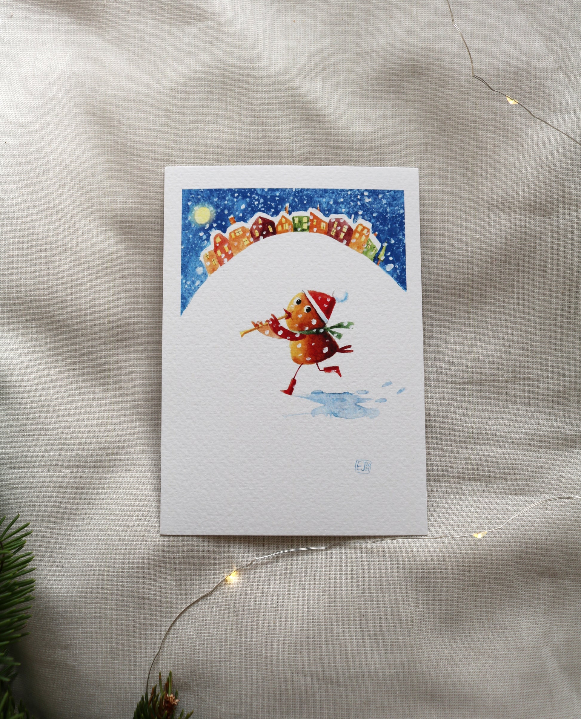 Тази коледна картичка, нарисувана от Елена Жаблянова, показва уютно зимно селце с малко пиле, което весело свири в снега. Илюстрацията излъчва празнична топлина, спокойствие и коледна магия, караща всеки да се усмихне.