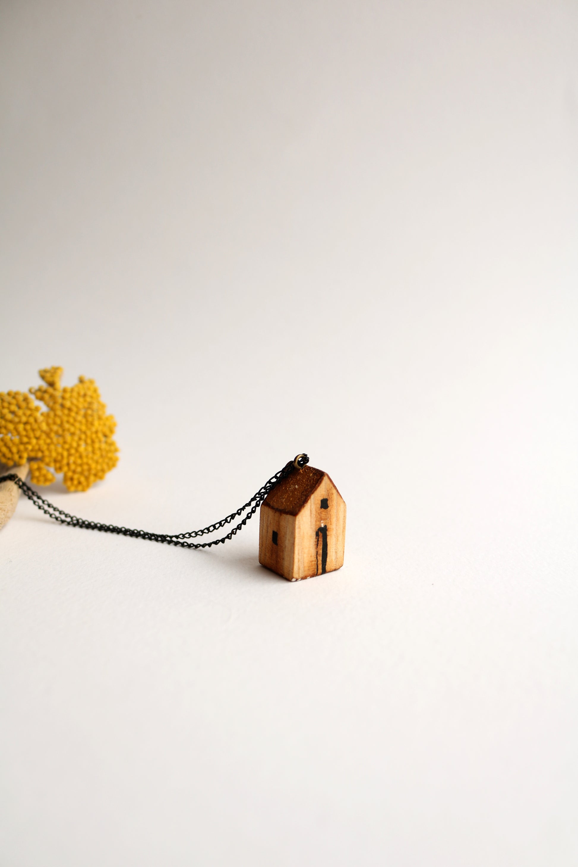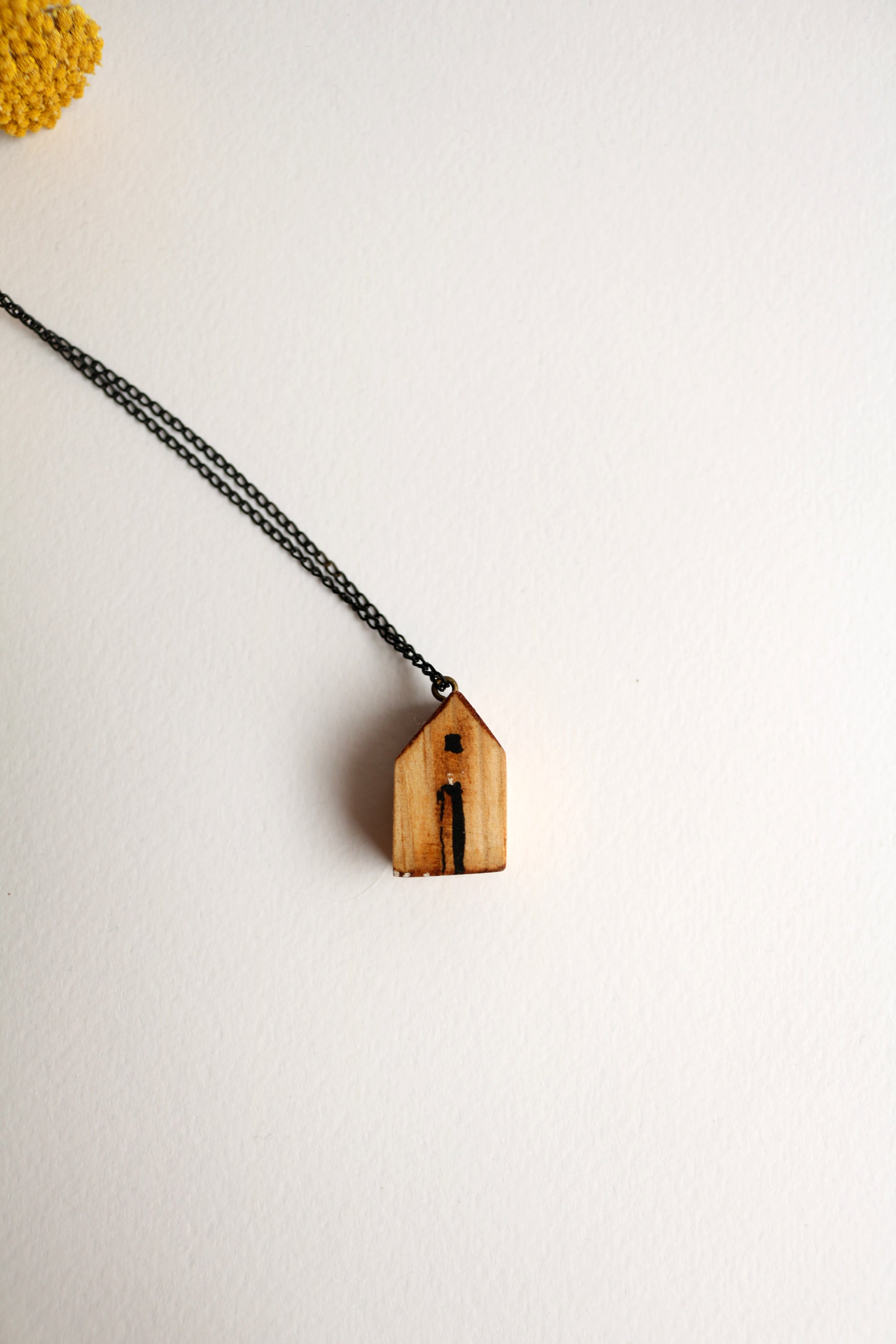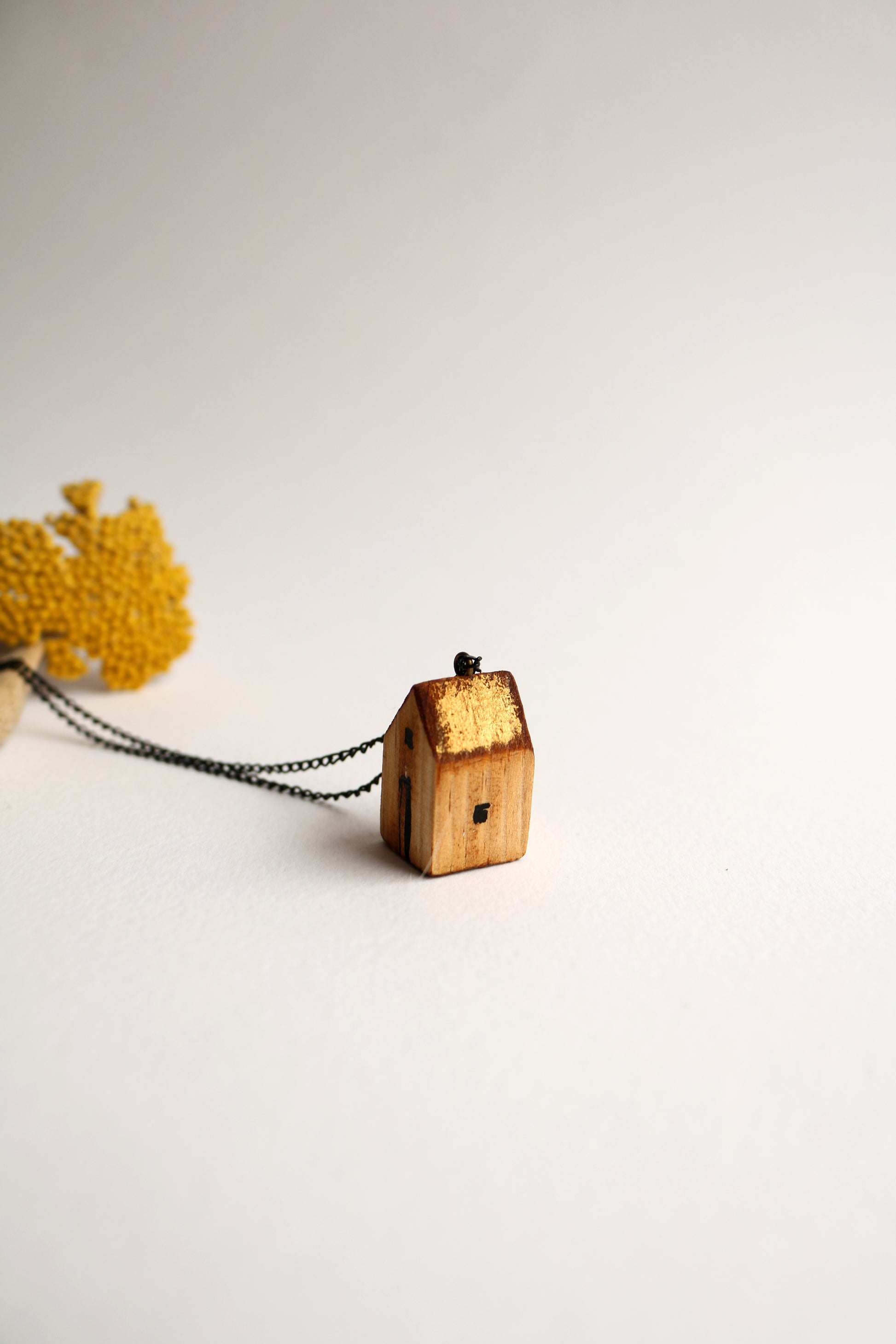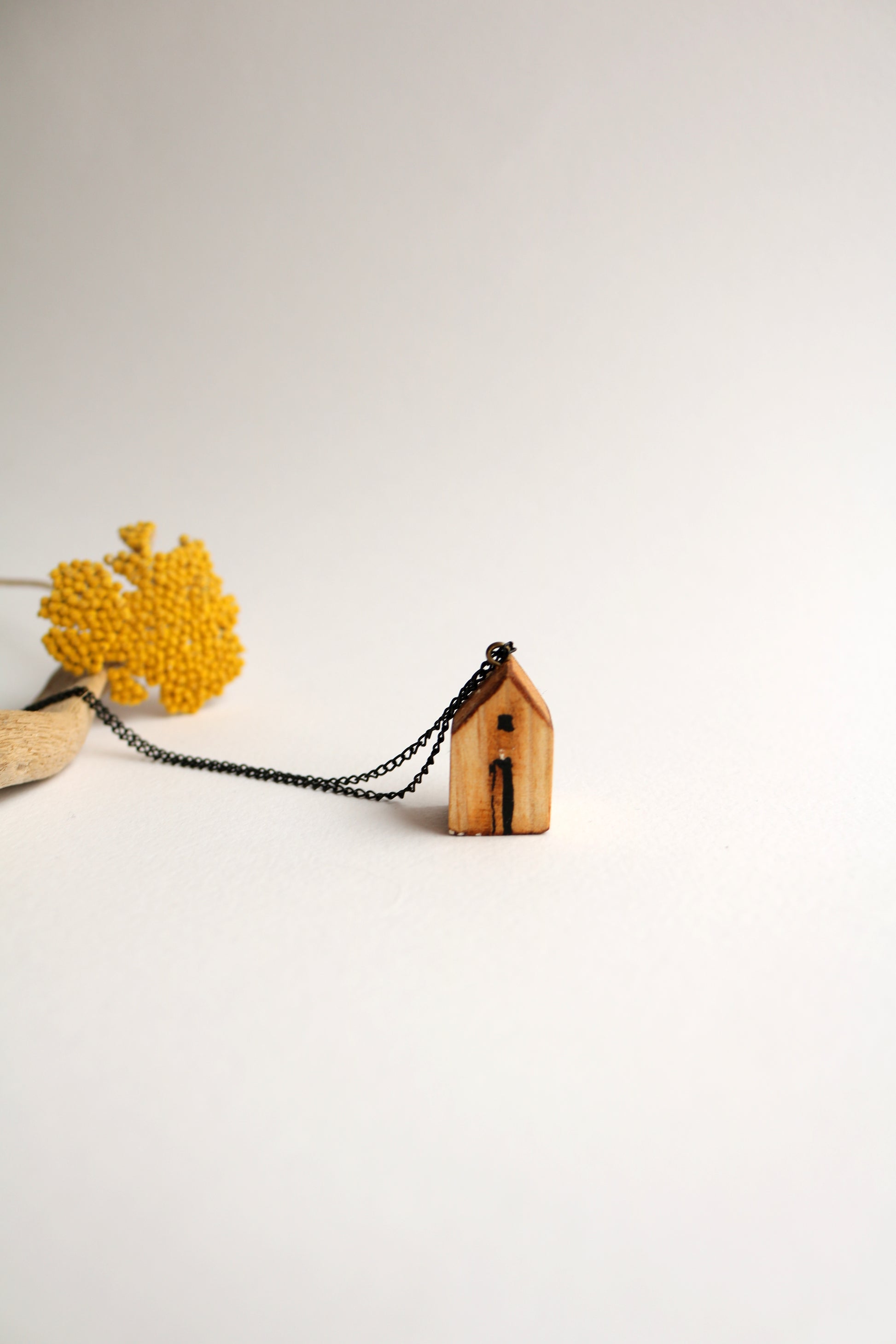 Ръчно изработен гердан от художничката Милена Неделчева. Съчетава естествената дървена къща и елегантната метална верижка. Дължината на верижката е около 40см.