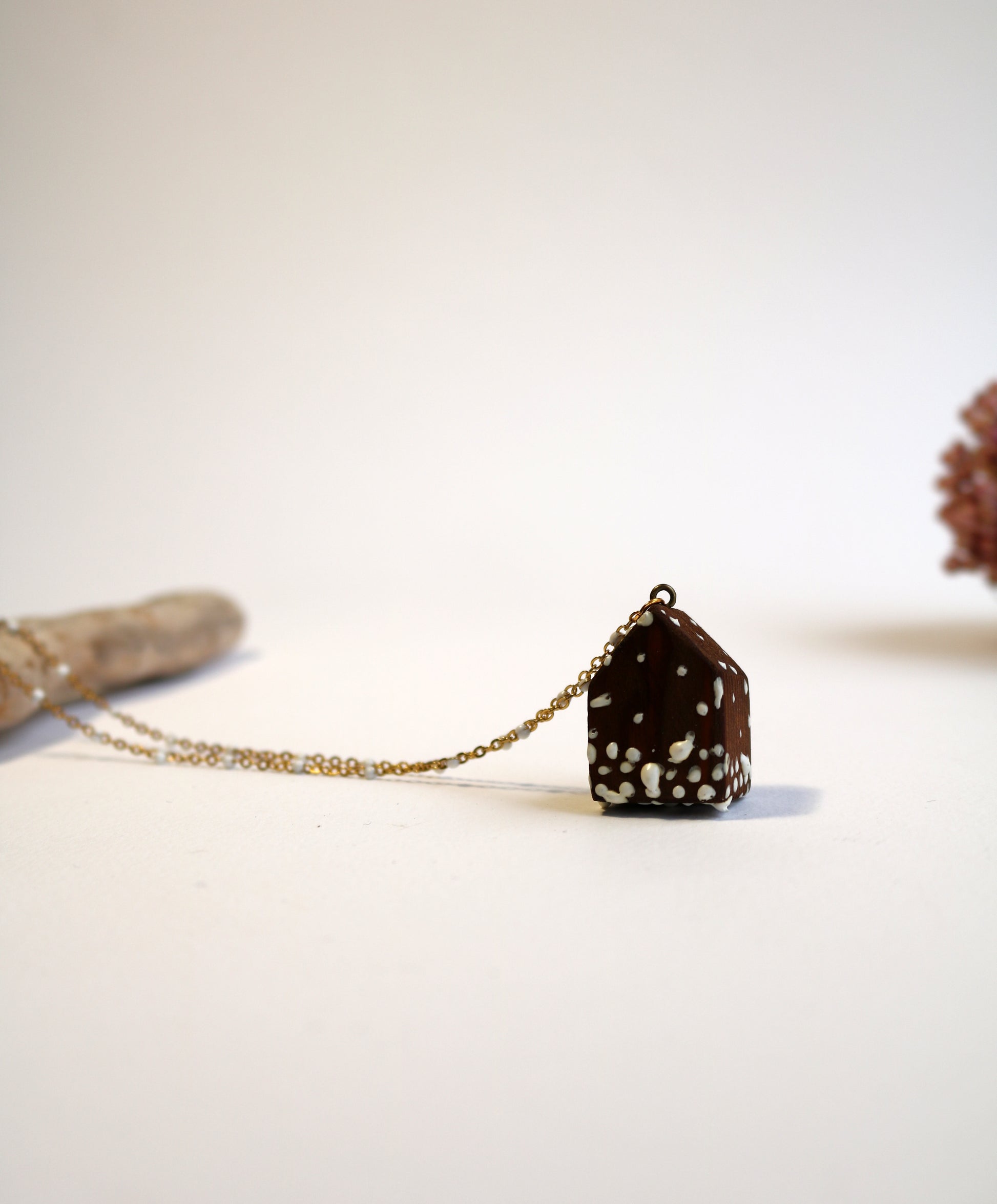 Ръчно изработен гердан с дървена къщичка, изрисувана на ръка с бели точки. Деликатно и стилно бижу, създадено от Милена Неделчева. Носи усещане за чистота, уют и топлина. Метална верижка – 45 см, къщичка – 3 см.