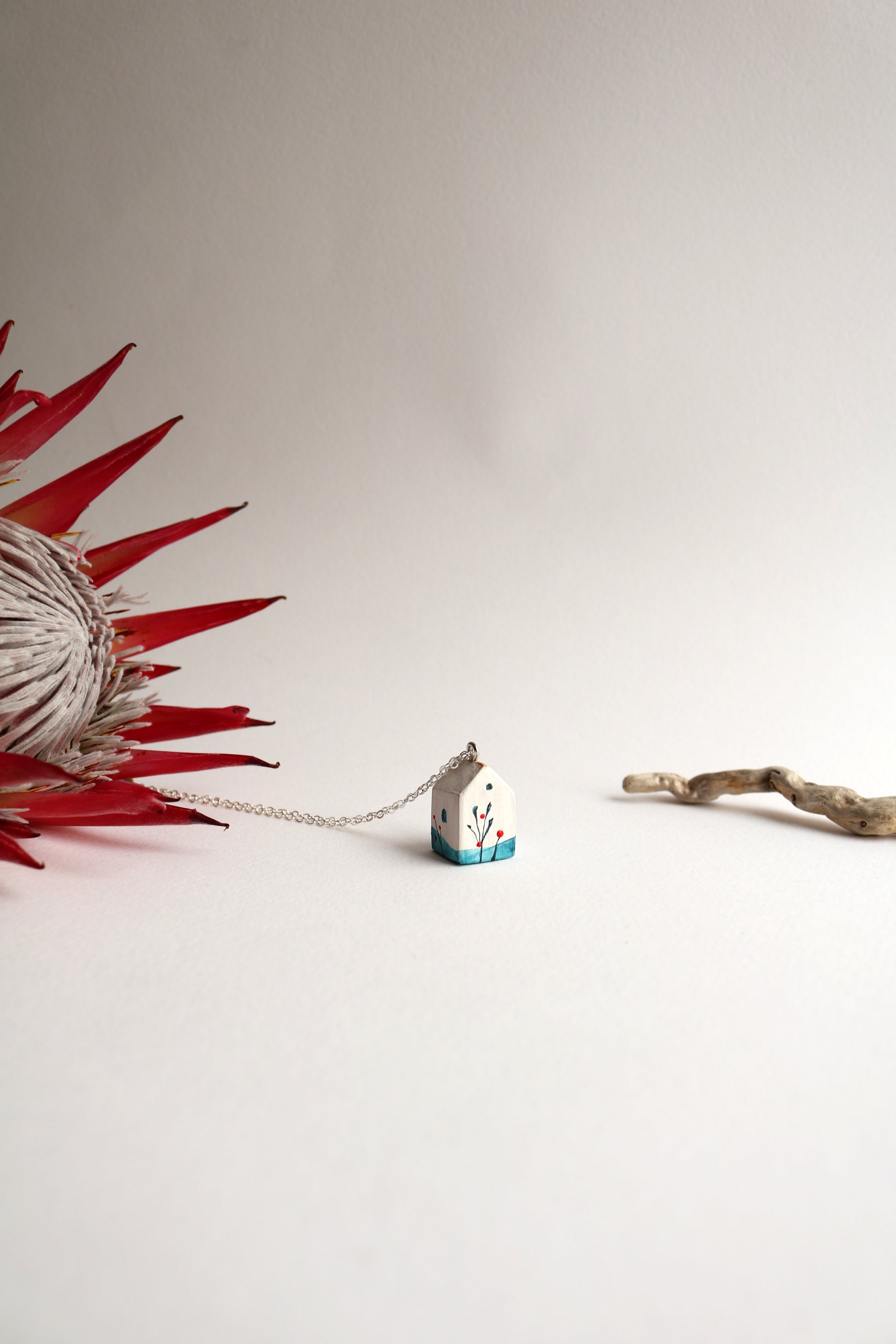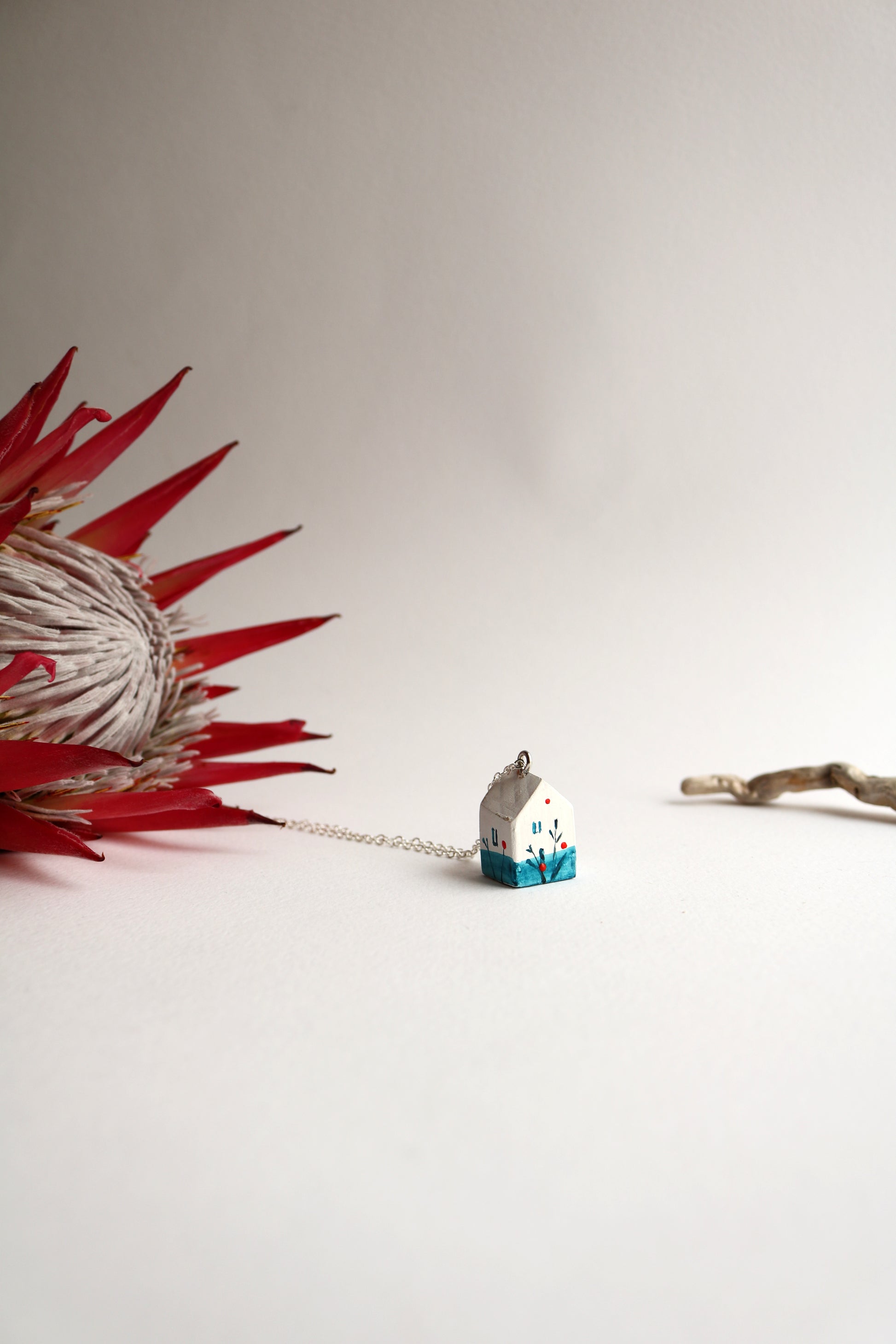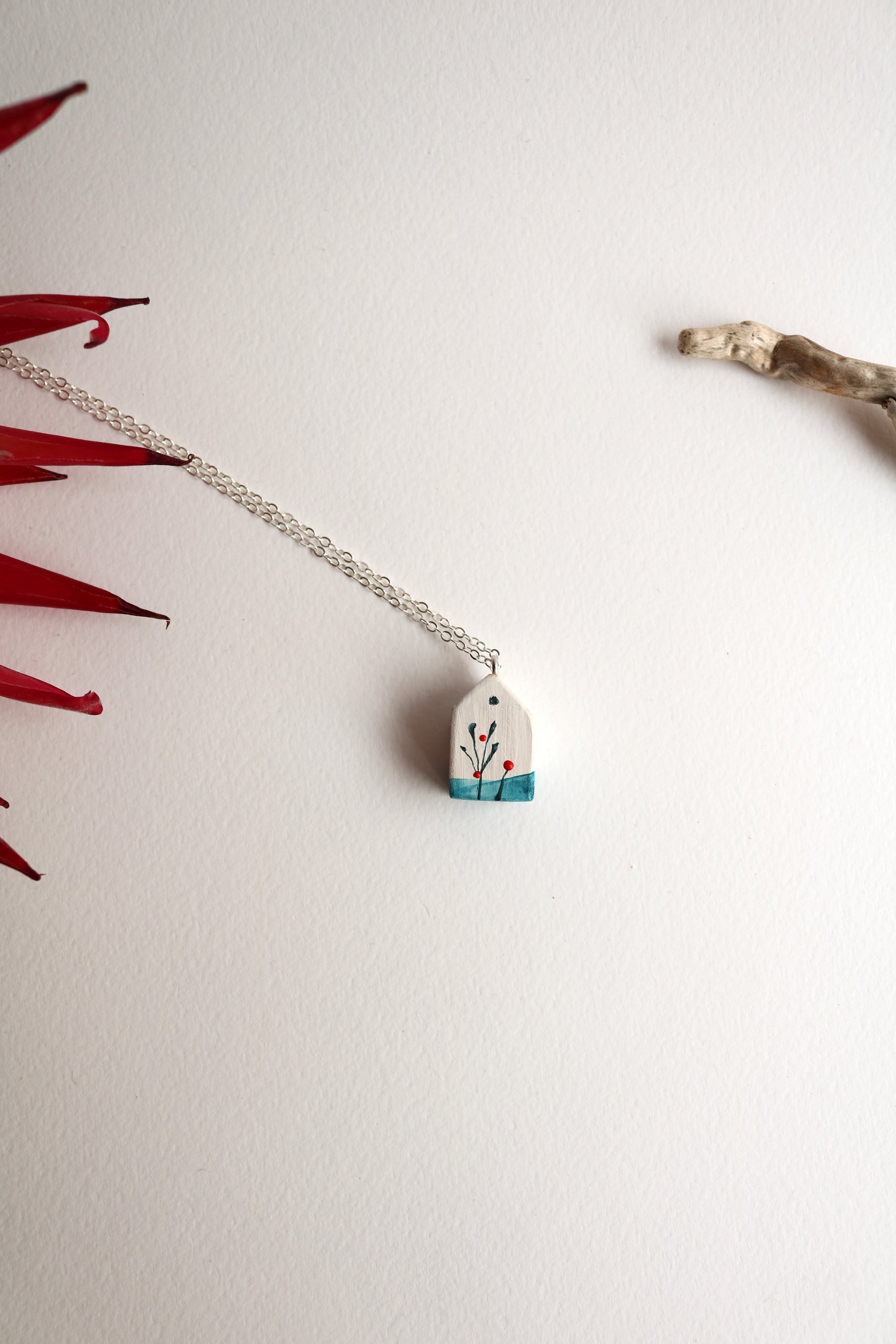 Ръчно изработен гердан от дърво, изрисуван с акварел от Милена Неделчева. Декориран с фини клонки за приказен ефект. Дължина на металната верижка около 40 см. Този гердан придава уникалност на всеки тоалет.