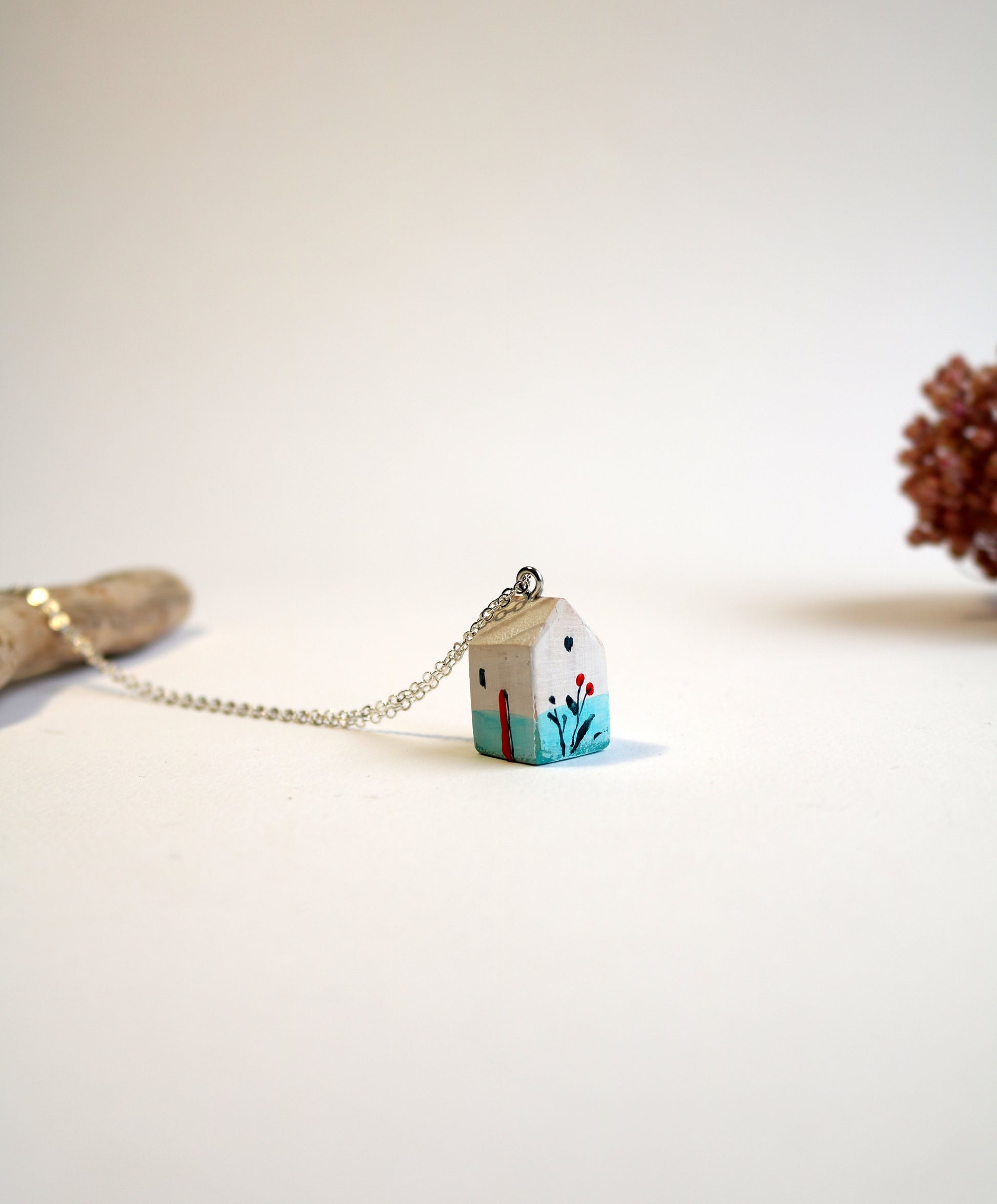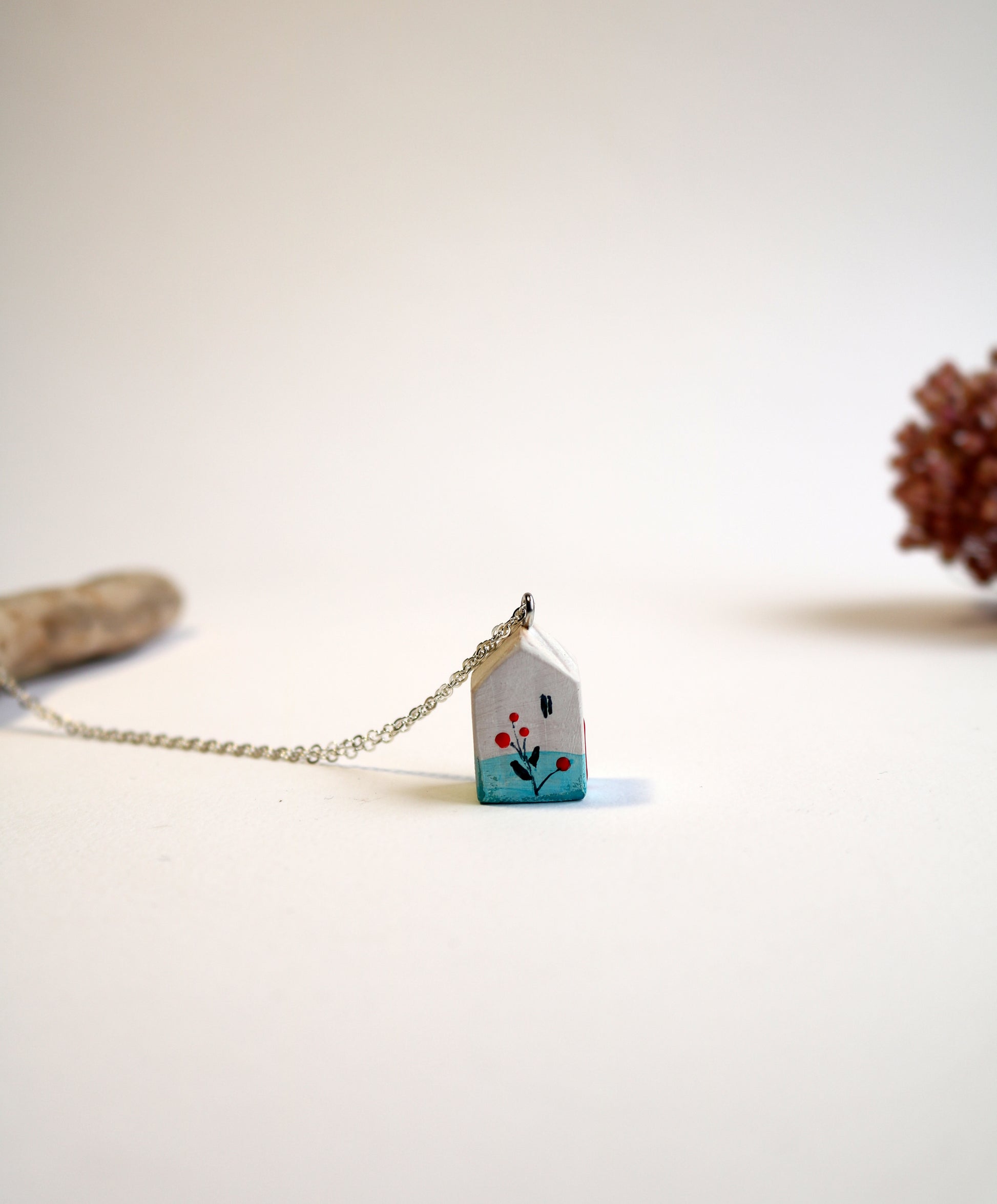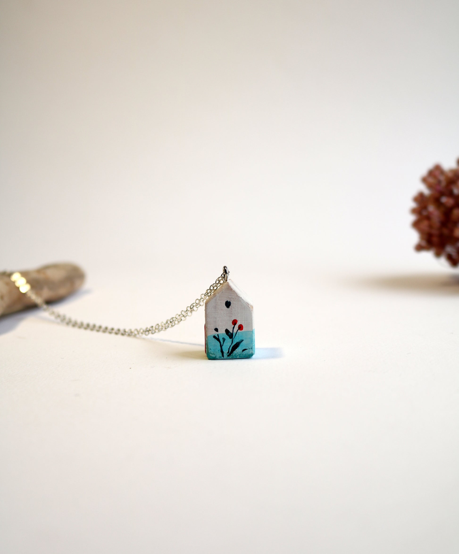 Приказен гердан с дървена къщичка – ръчно изработен и изрисуван от Милена Неделчева. Символ на уют и любов. Метална верижка 40 см, къщичка 3 см.