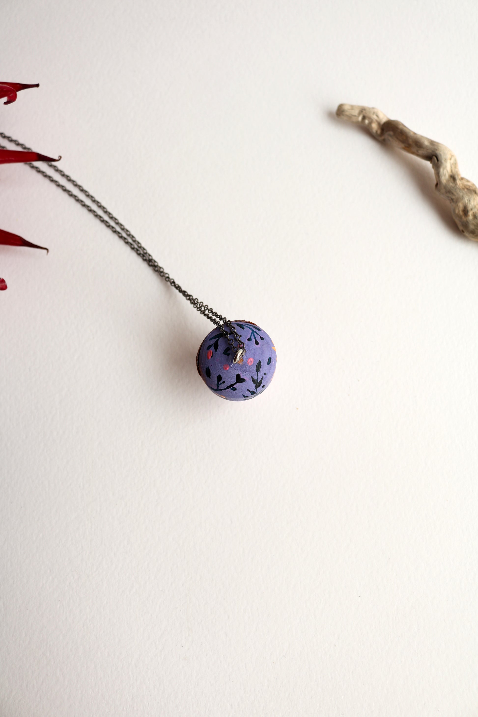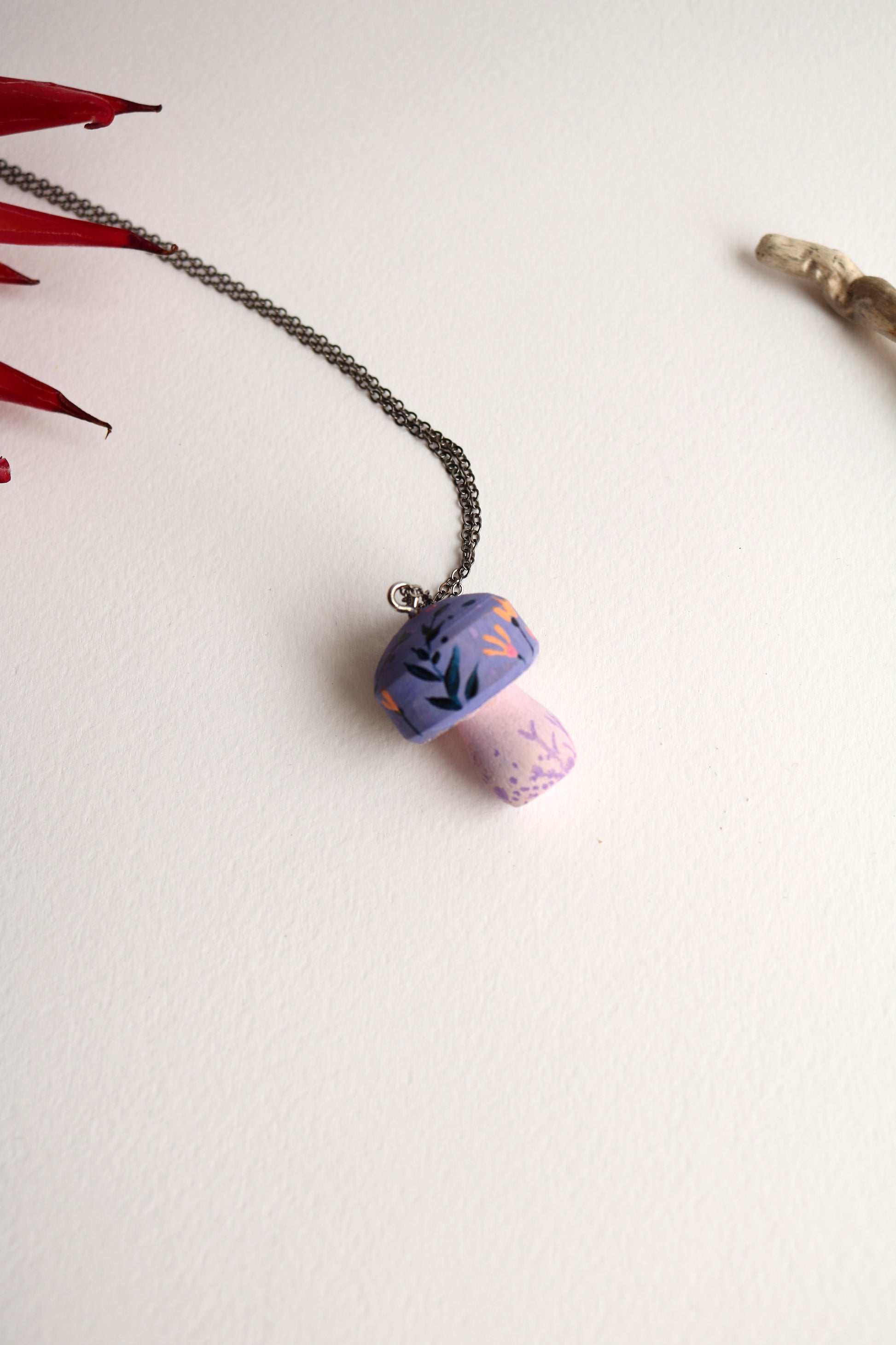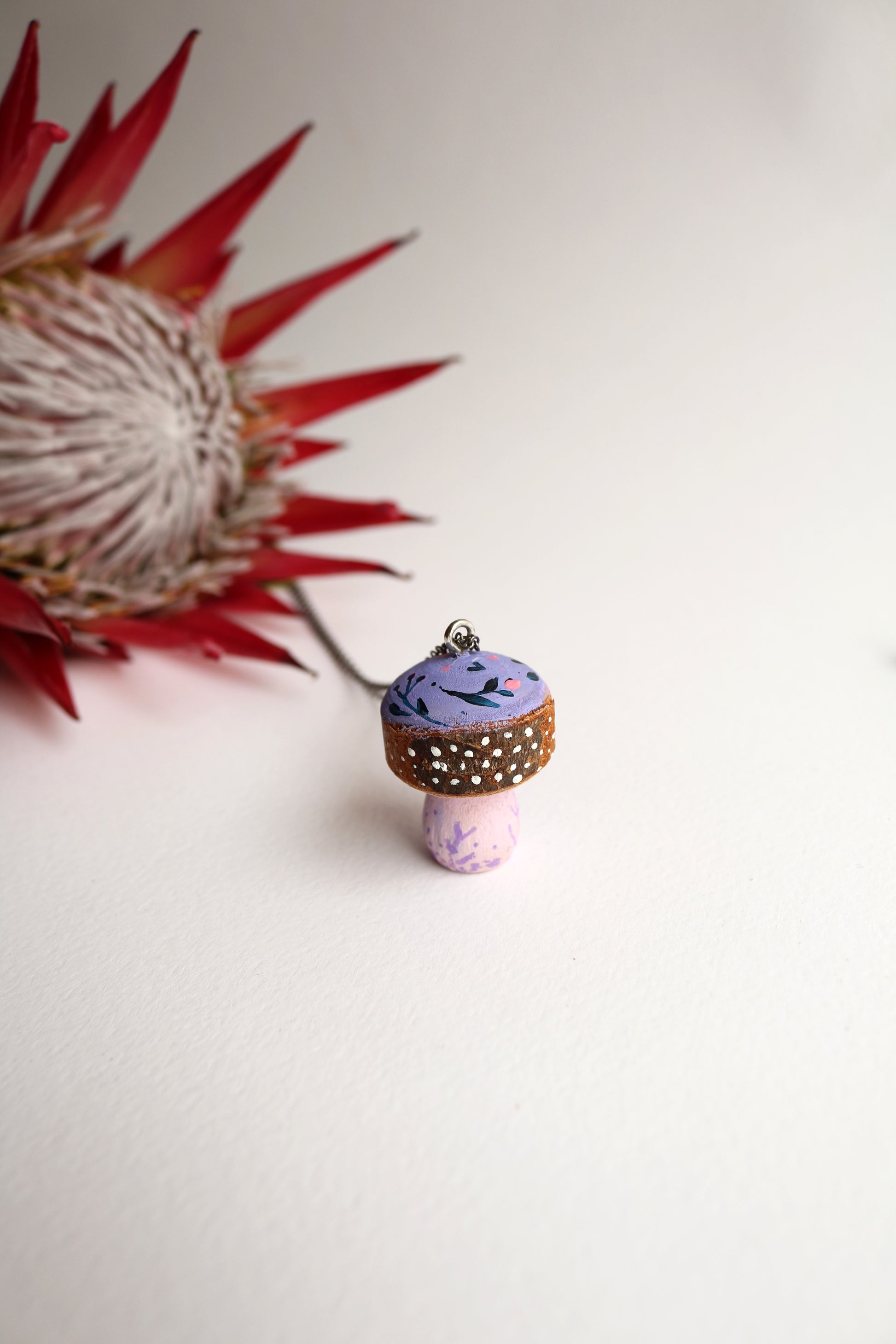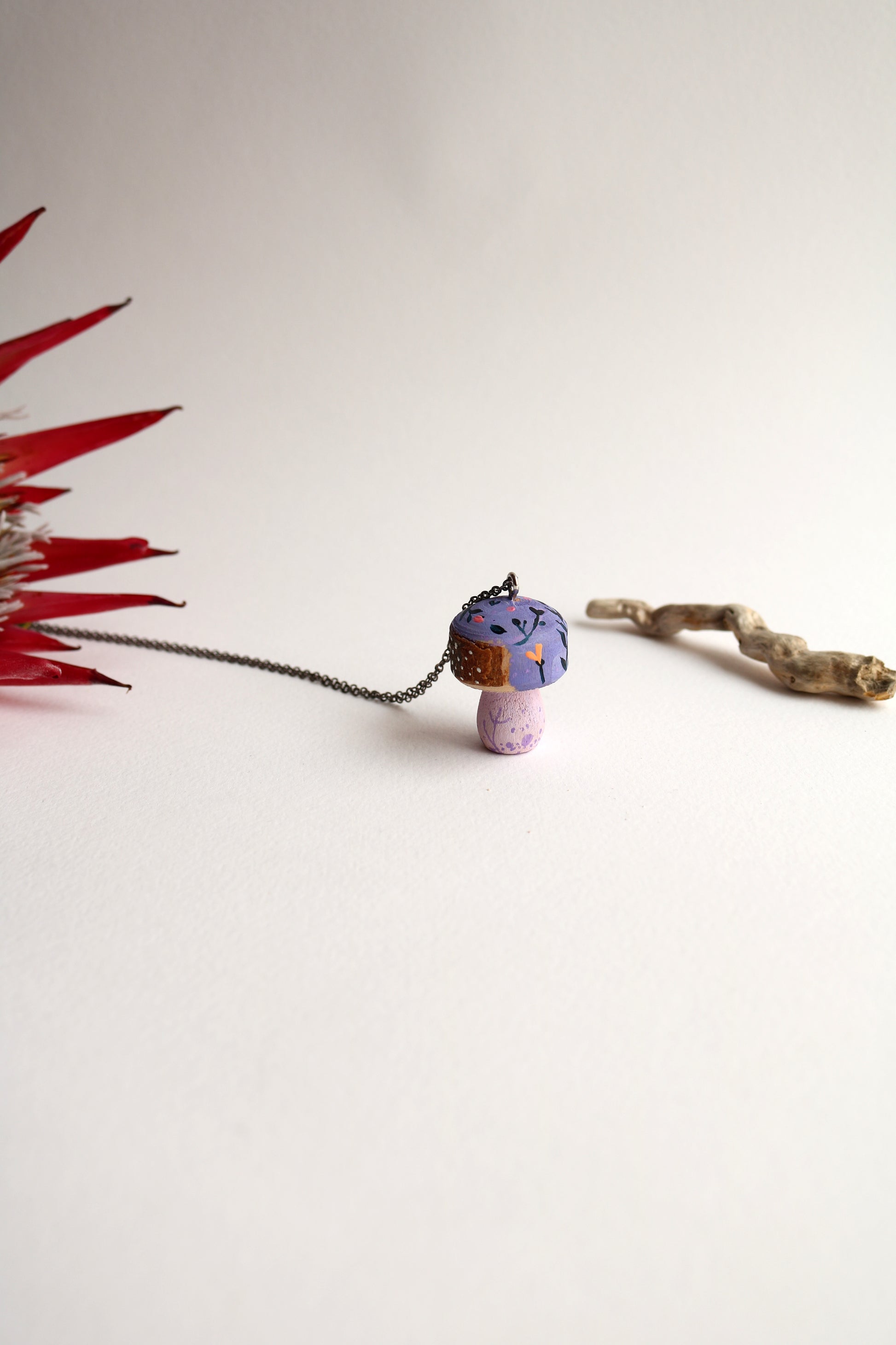 Малка лилава гъбка, изрисувана от Милена Неделчева. Нежно бижу, което разказва история. Метална верижка с дължина около 40см.