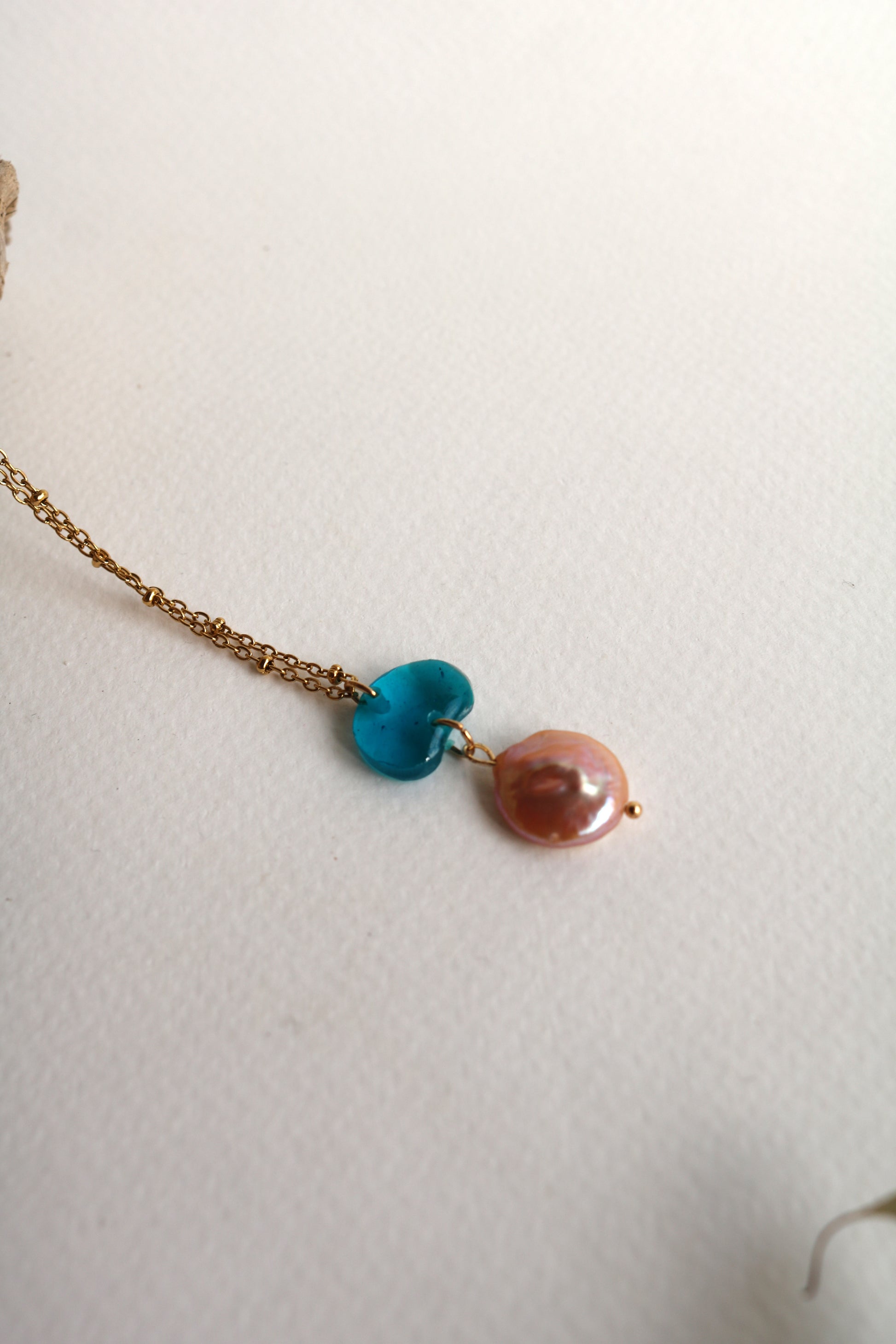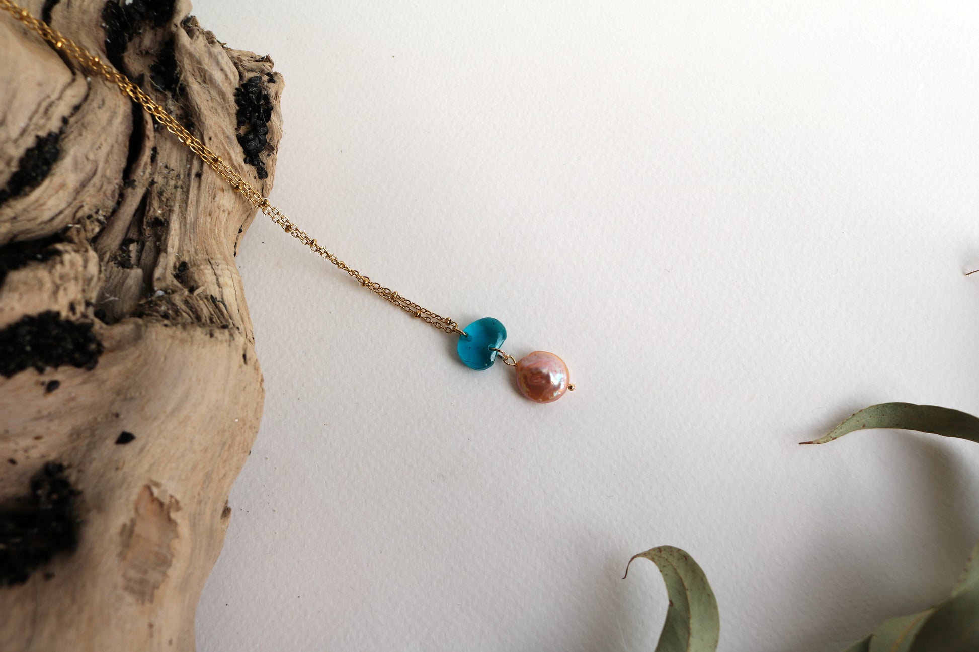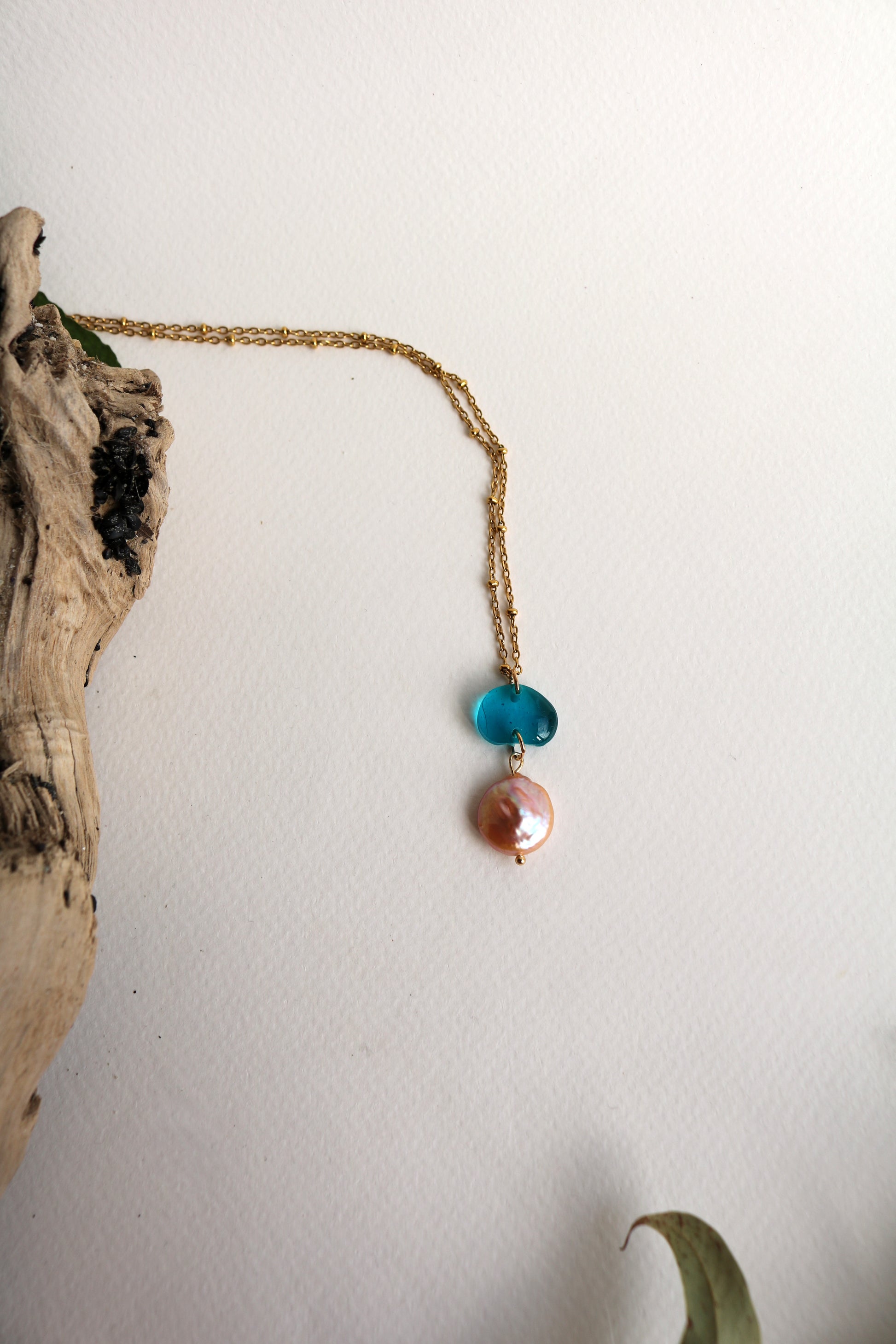 Ръчно изработен гердан със син цвят от смола и естествена розова перла.