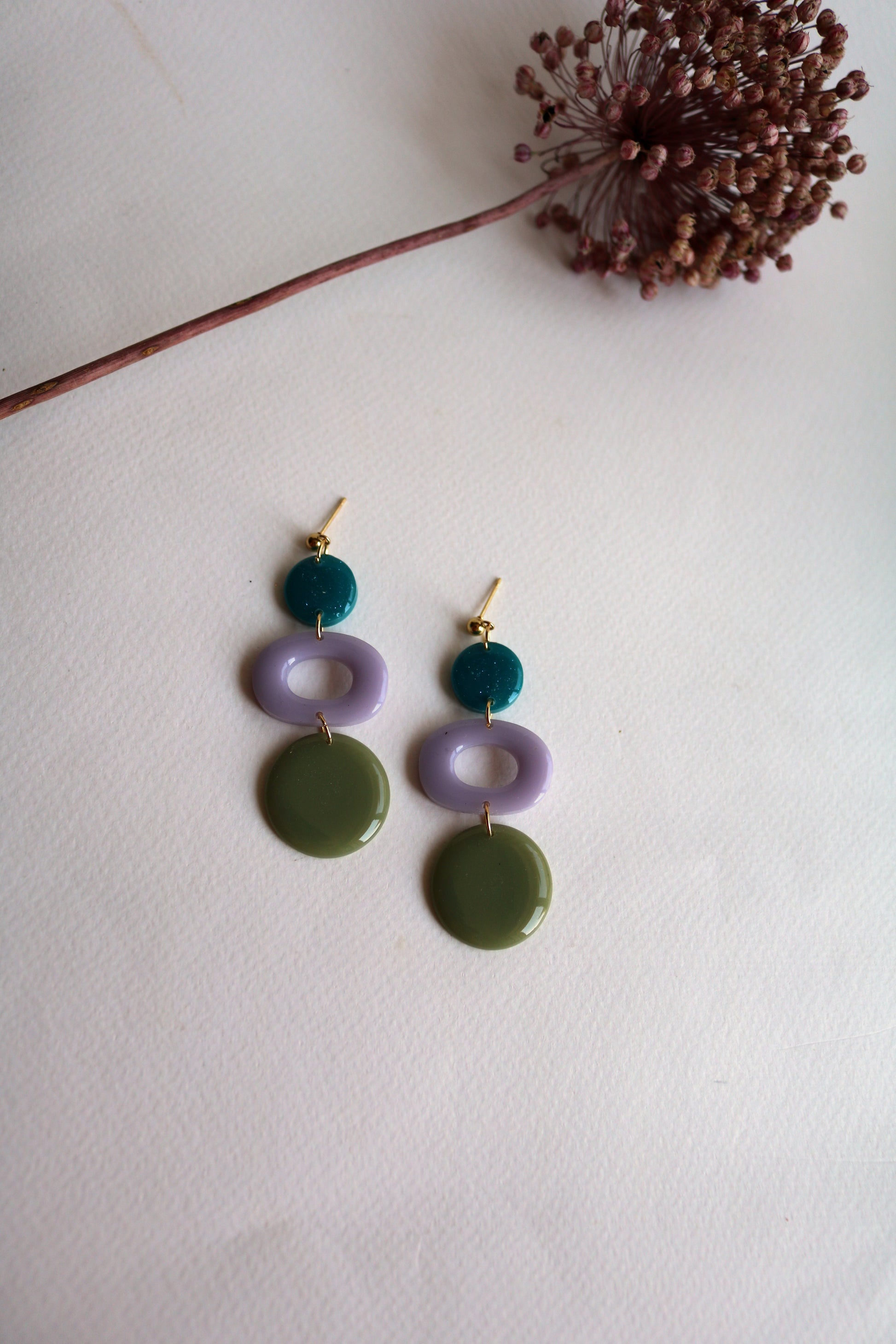 Геометрични обеци в тъмнозелено, лилаво и синьо – изчистени и смели. Ръчно изработени от смола