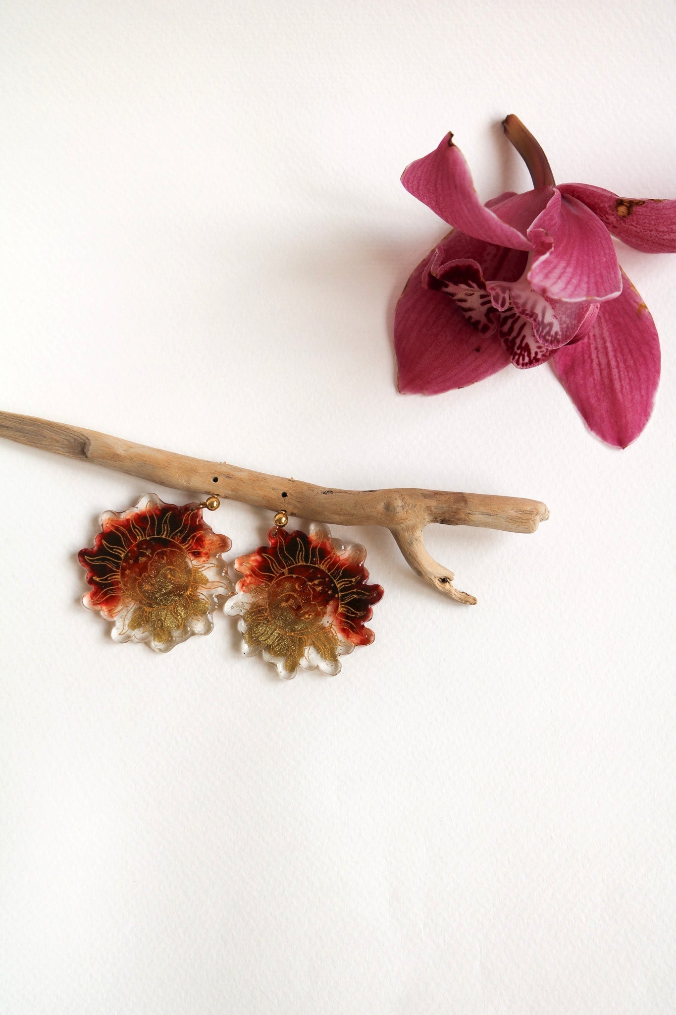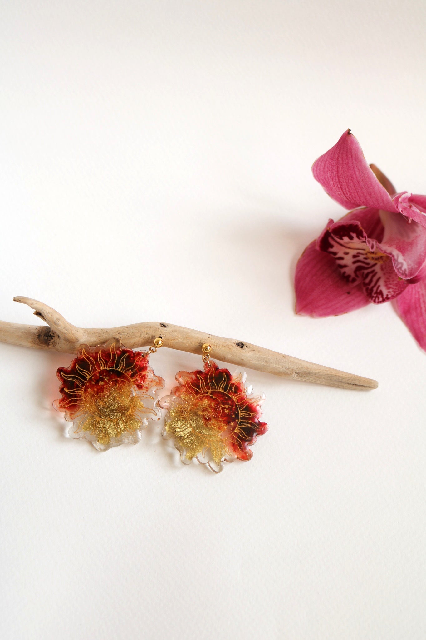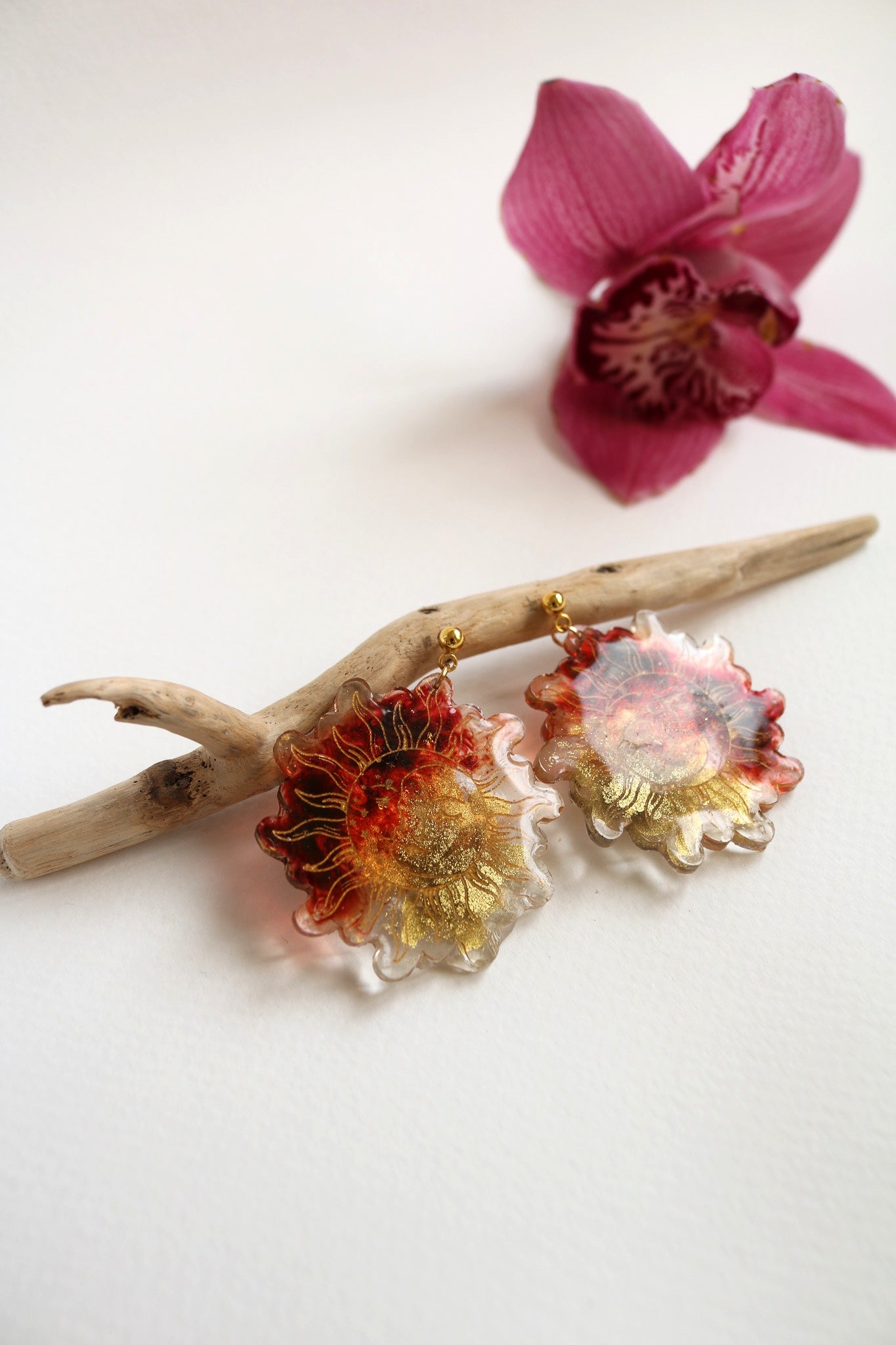 Обеци, изработени от епоксидна смола във формата на слънце.