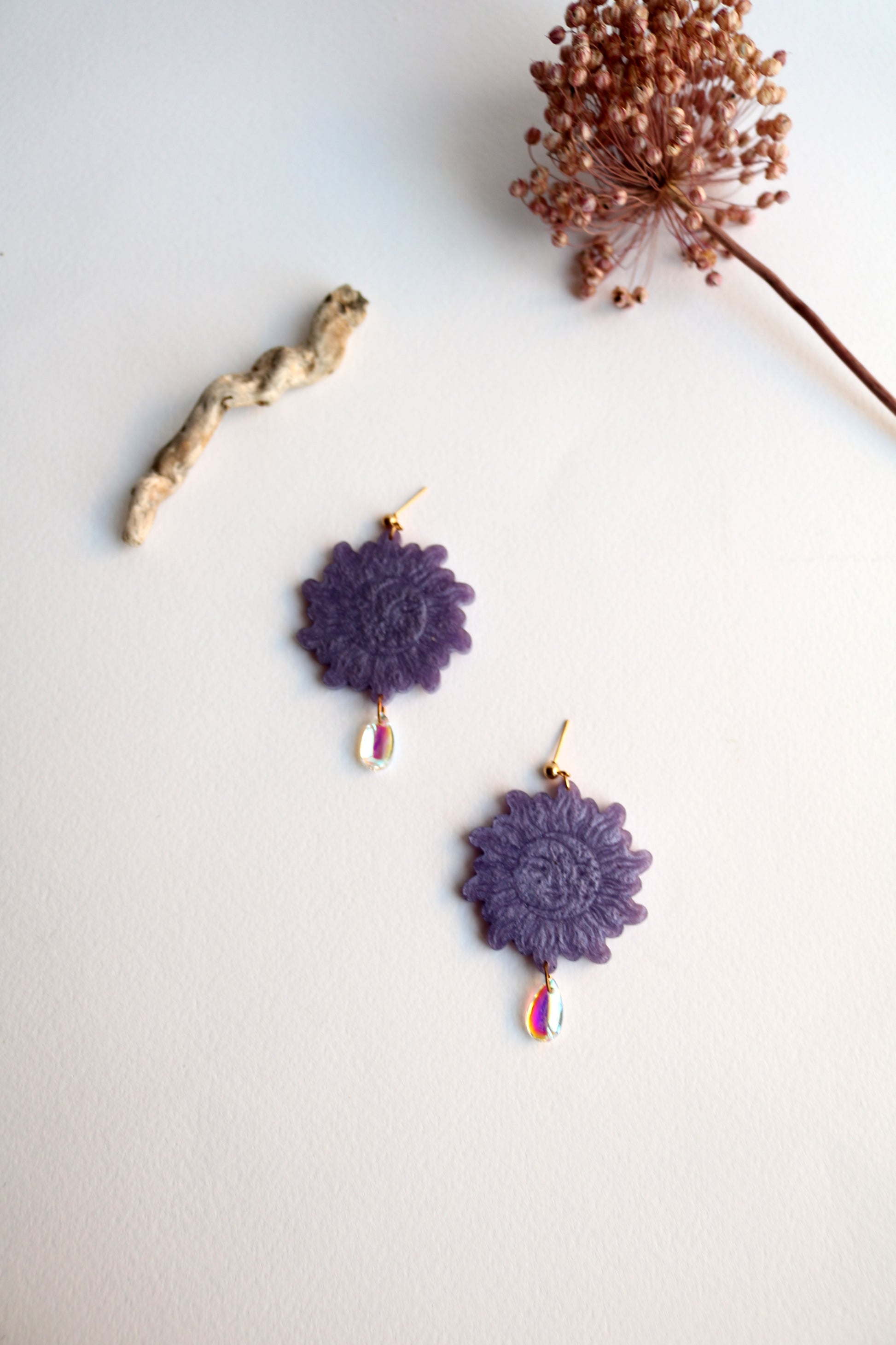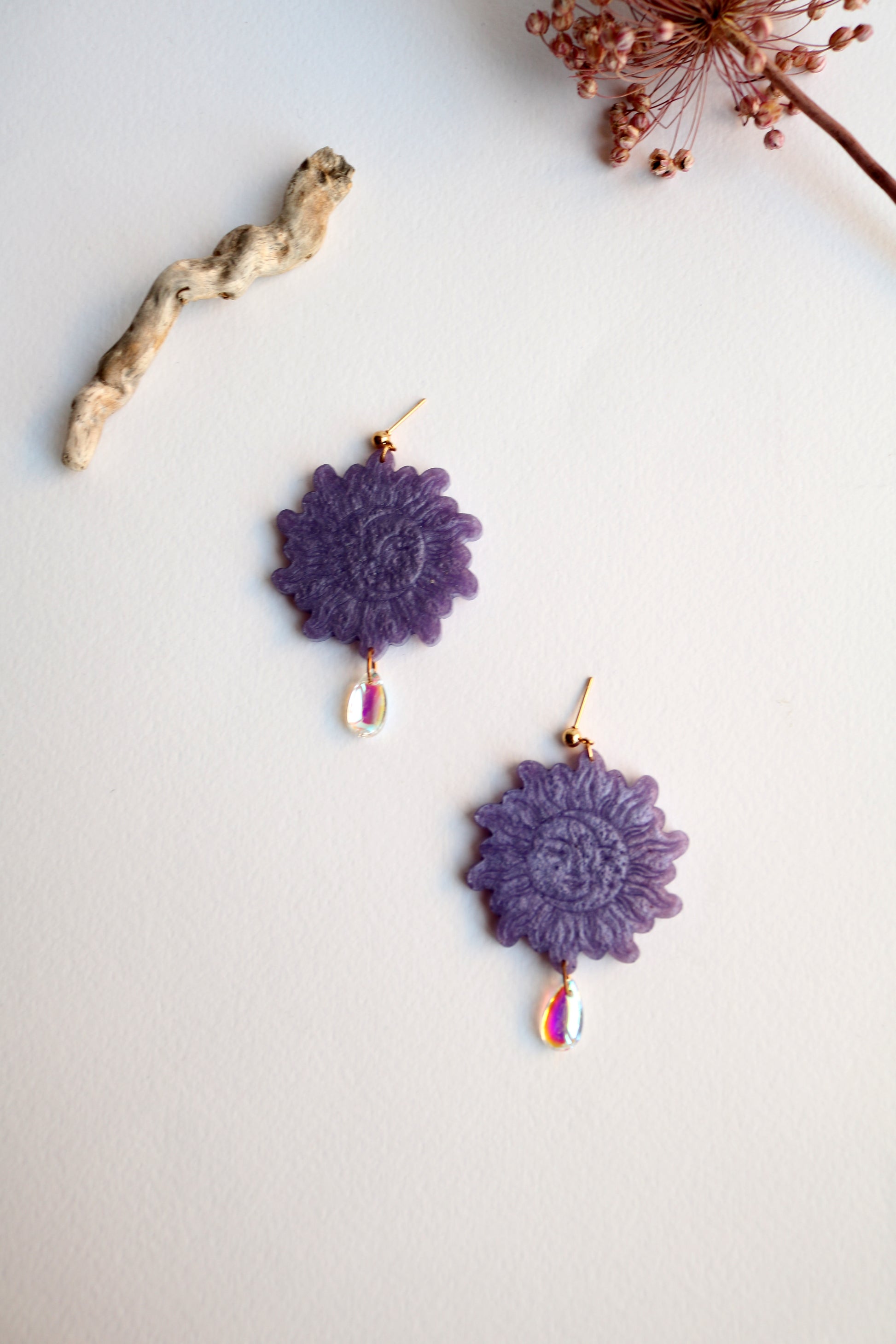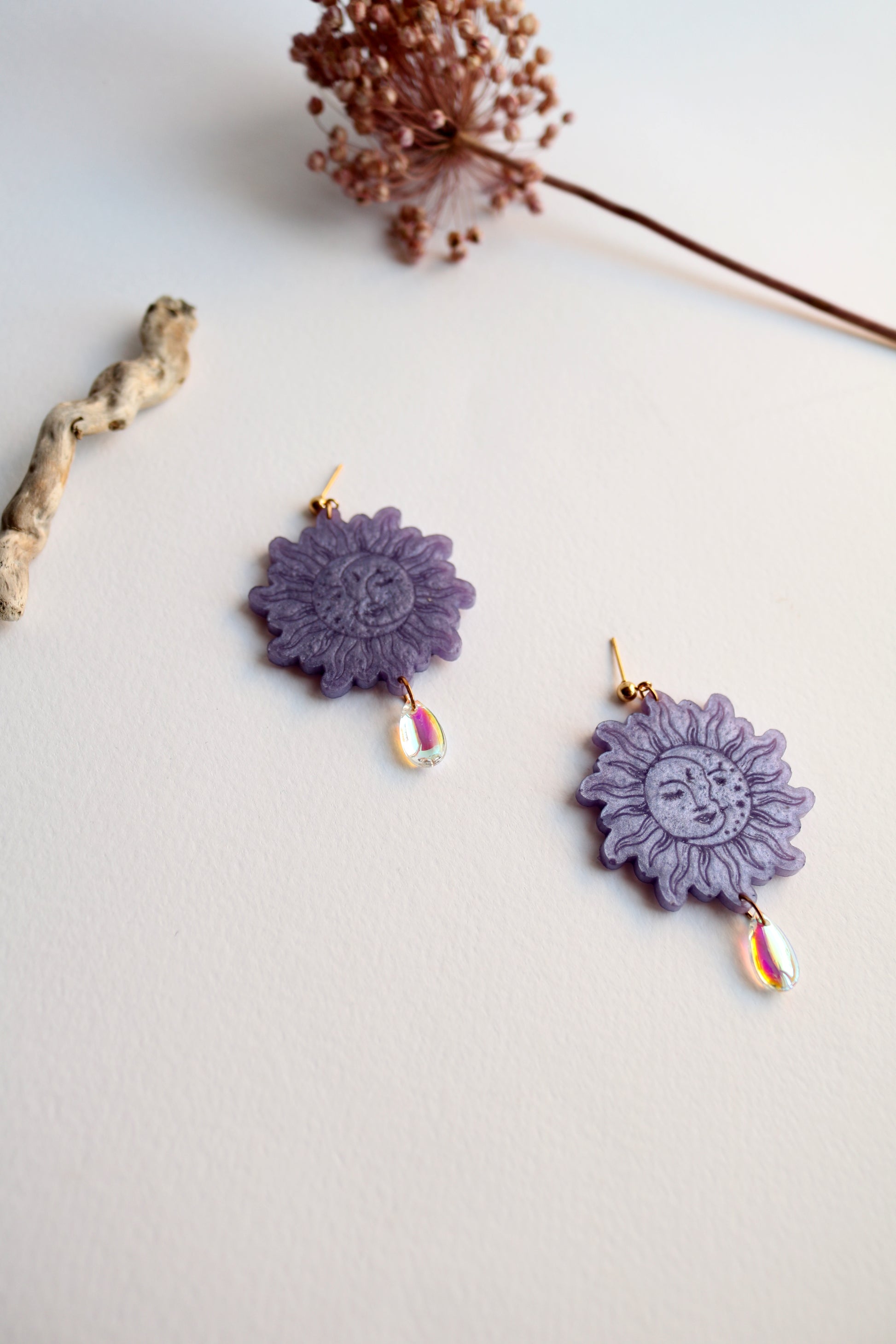 Обеци, изработени от епоксидна смола. Слънце, луна и една нежна капка от стъкло. Много леки, артистични и забележими. Подходящи са за всеки повод. Щифтове от неръждаема стомана.