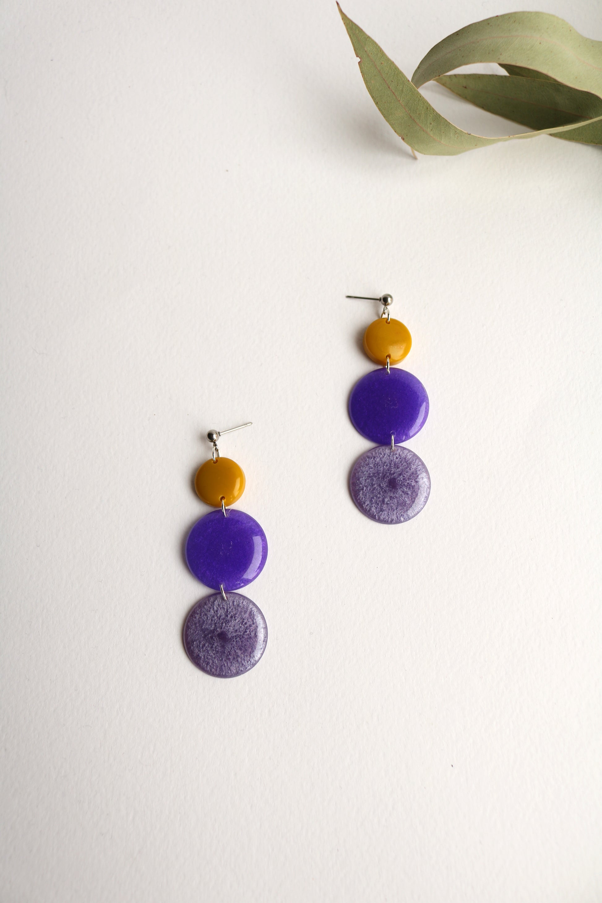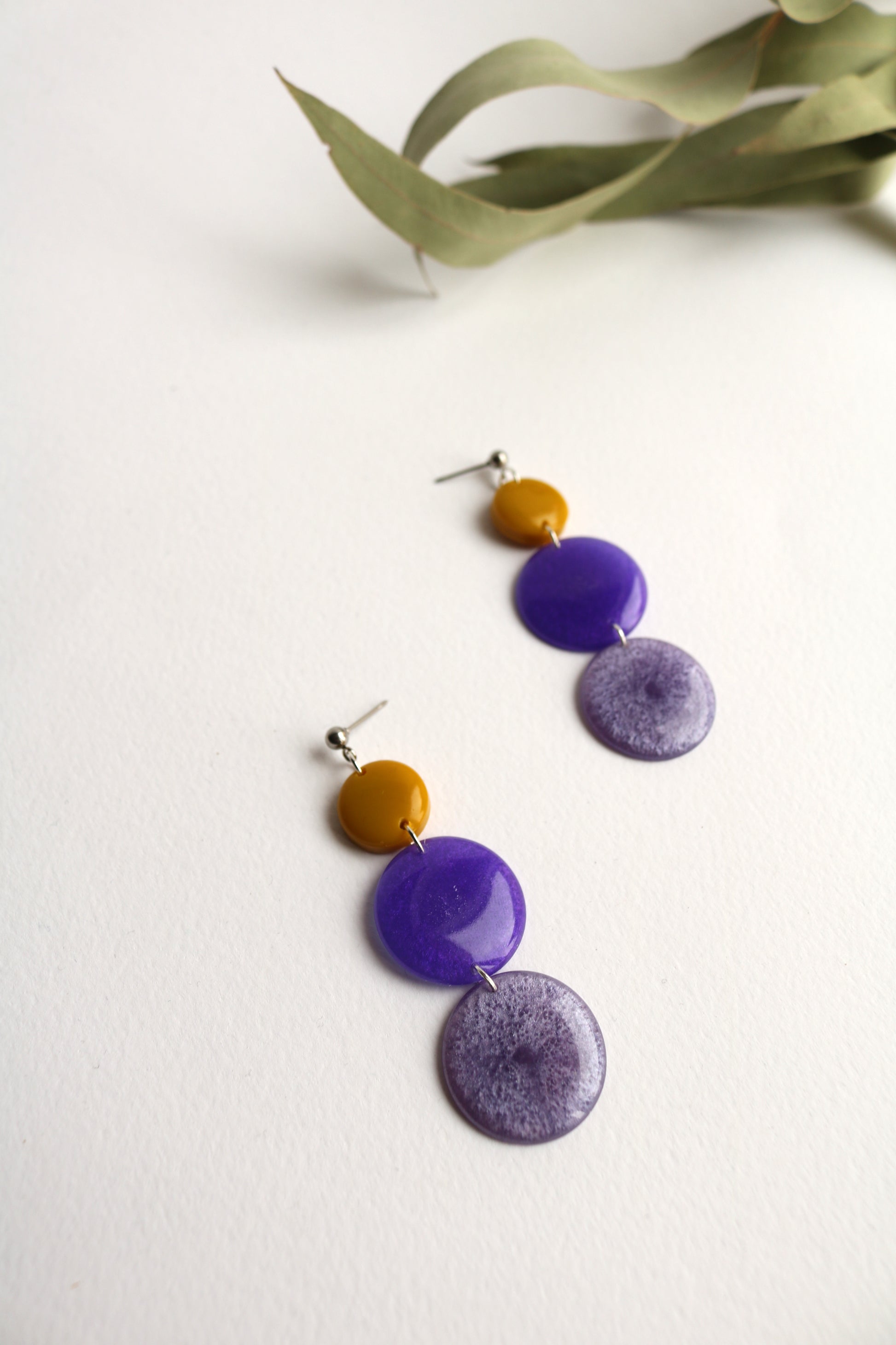 Ръчно изработени обеци от епоксидна смола в лилави и жълти тонове.