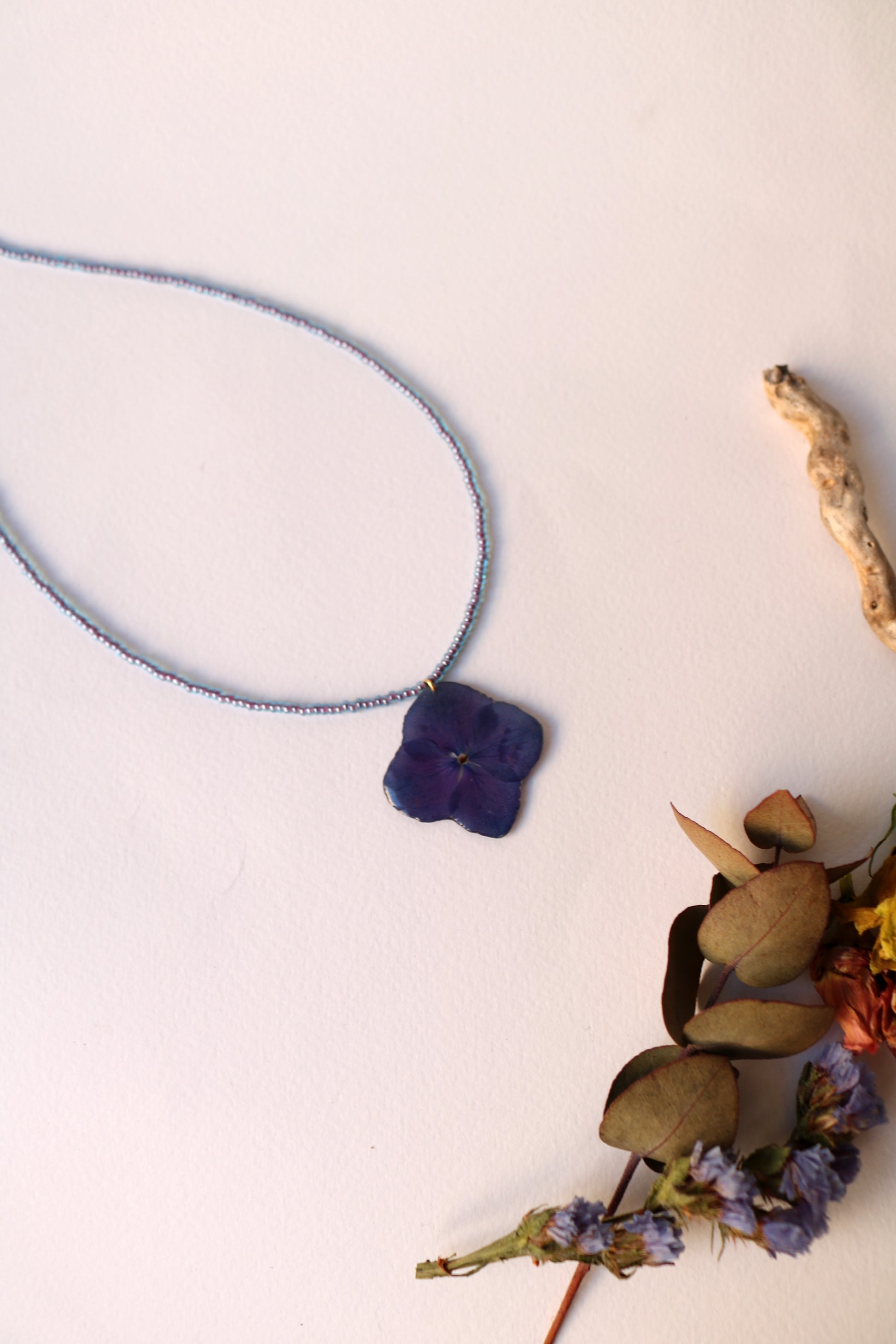 Ръчно изработен гердан с истински цвят от хортензия. Комбиниран със стъклени мъниста, той носи усещане за природна красота и малко вълшебство. Всеки гердан е уникален — цветчето е истинско, с неговите естествени линии и нюанси. Подходящ е както за ежедневие, така и за подарък, който носи символика, романтика и личен жест.