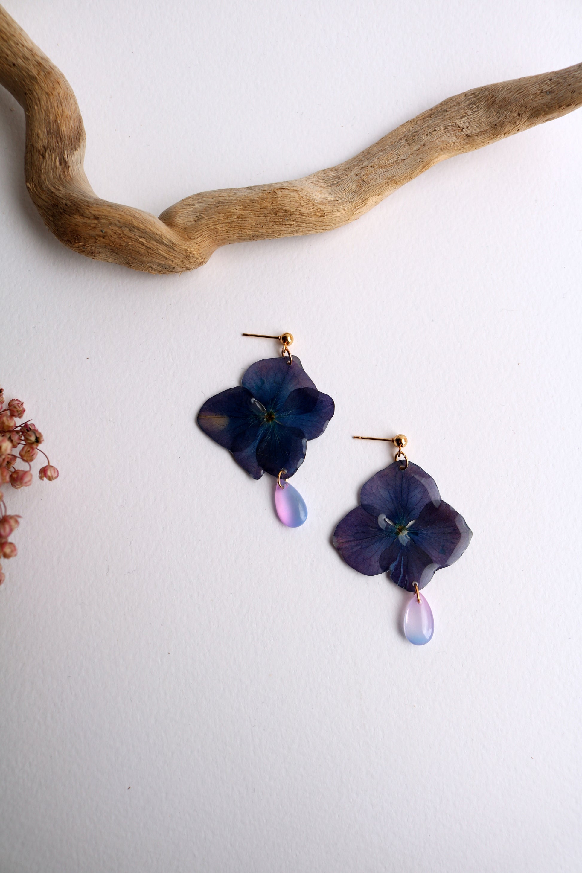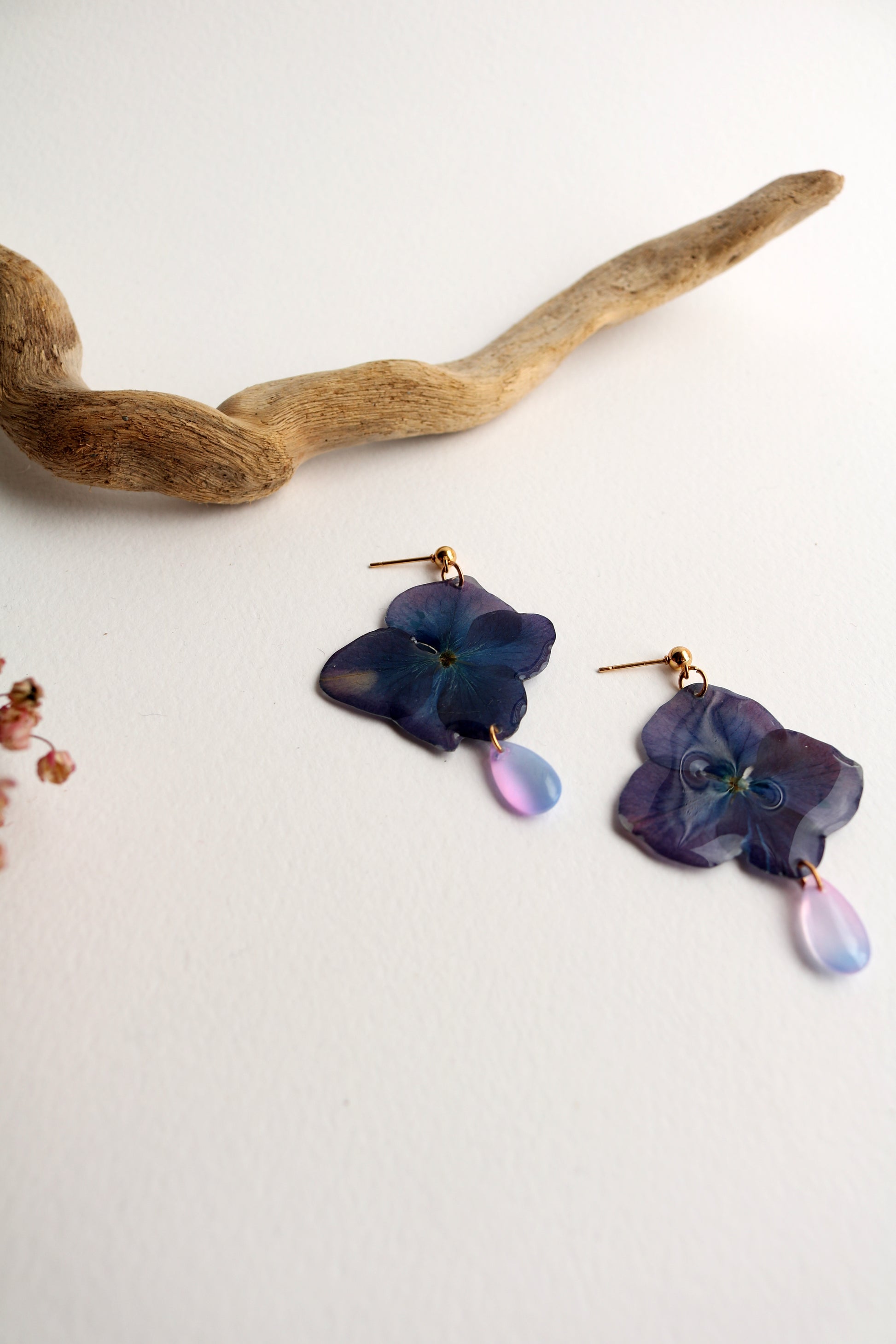 Ако и вие сте влюбени в пленителния цвят на хортензията, тези обеци са точно за вас. Изсушен цвят от хортензия, покрит с епоксидна смола. Нежна капка, която създава чудесен завършек. Много фини и леки. Щифтовете са изработени от неръждаема стомана.