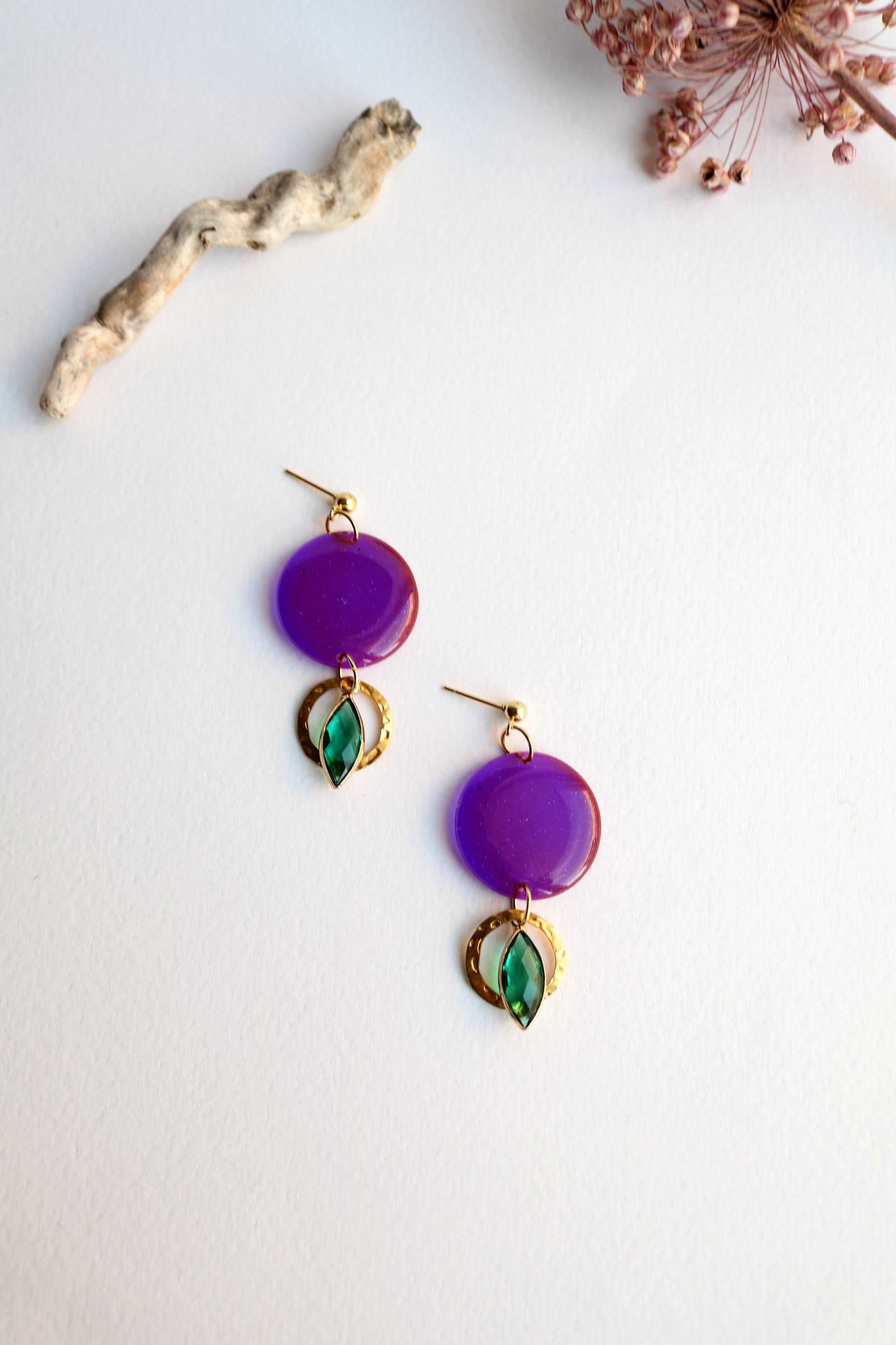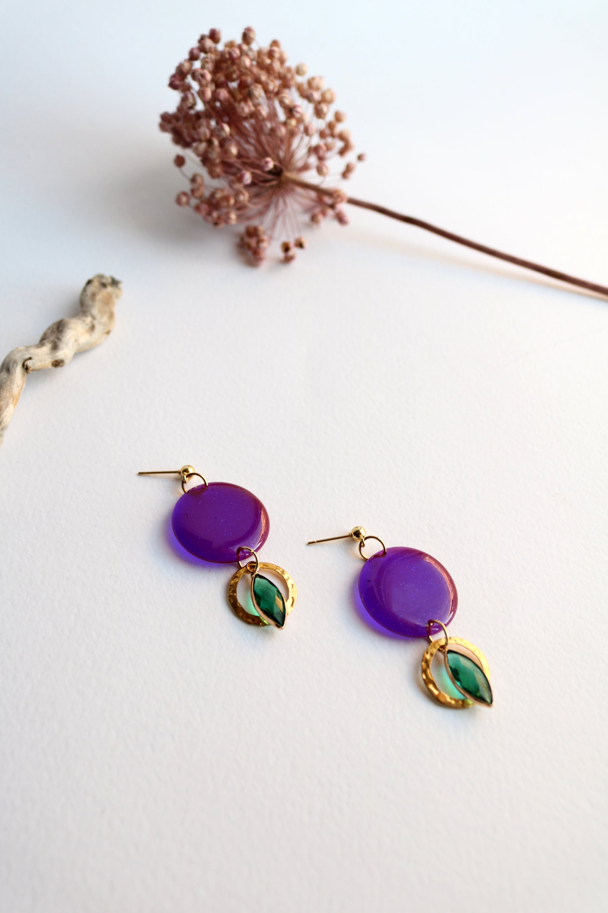 Ръчно изработени обеци с кръгъл елемент в дълбок виолетов цвят и малък детайл в тюркоазено-син нюанс. Златните метални части добавят топлина и лек блясък.