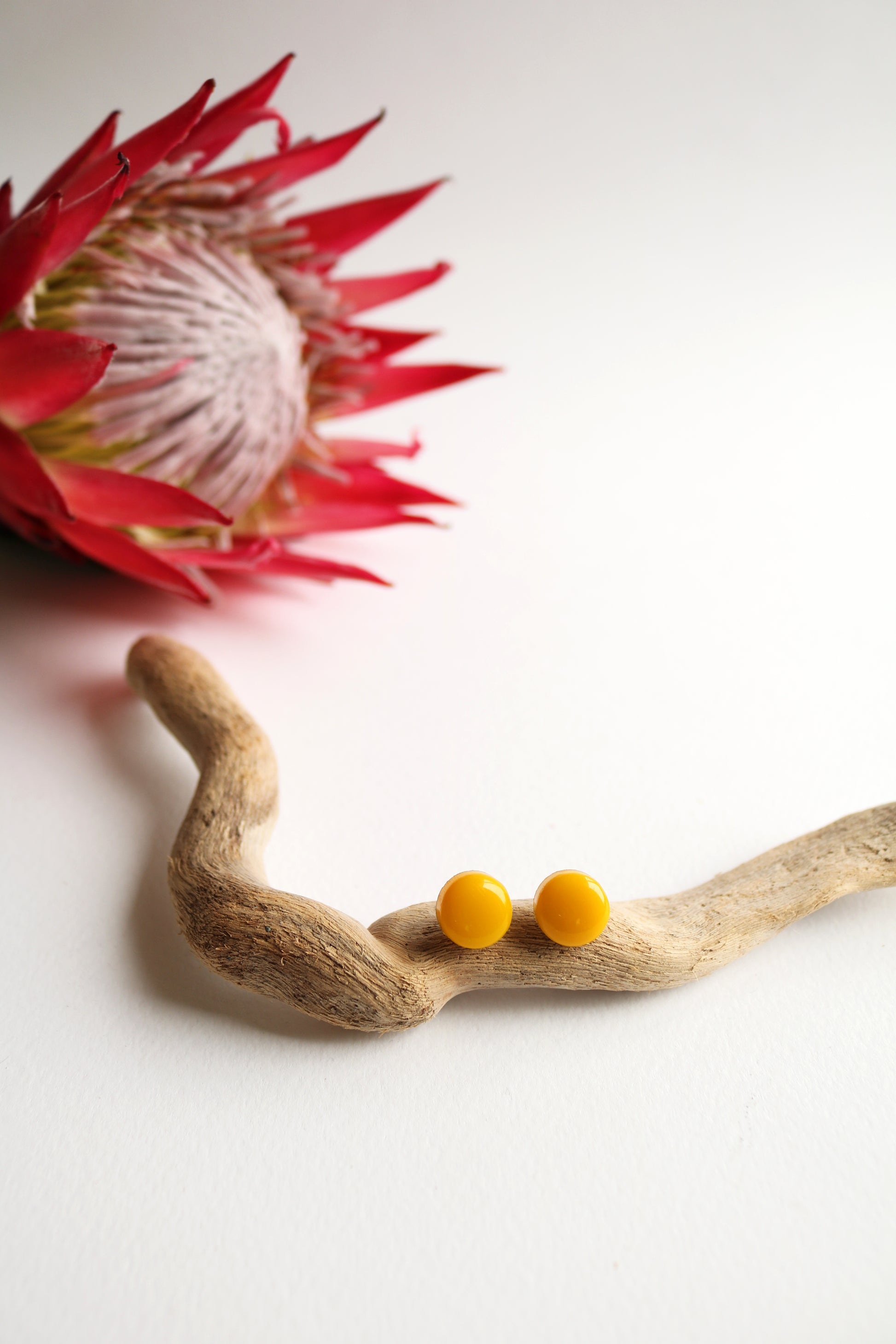 Обеци, изработени от епоксидна смола. Прекрасен жълт цвят, който напомня на банан. Нежно допълнение към всяко облекло и настроение. Щифтове от неръждаема стомана.