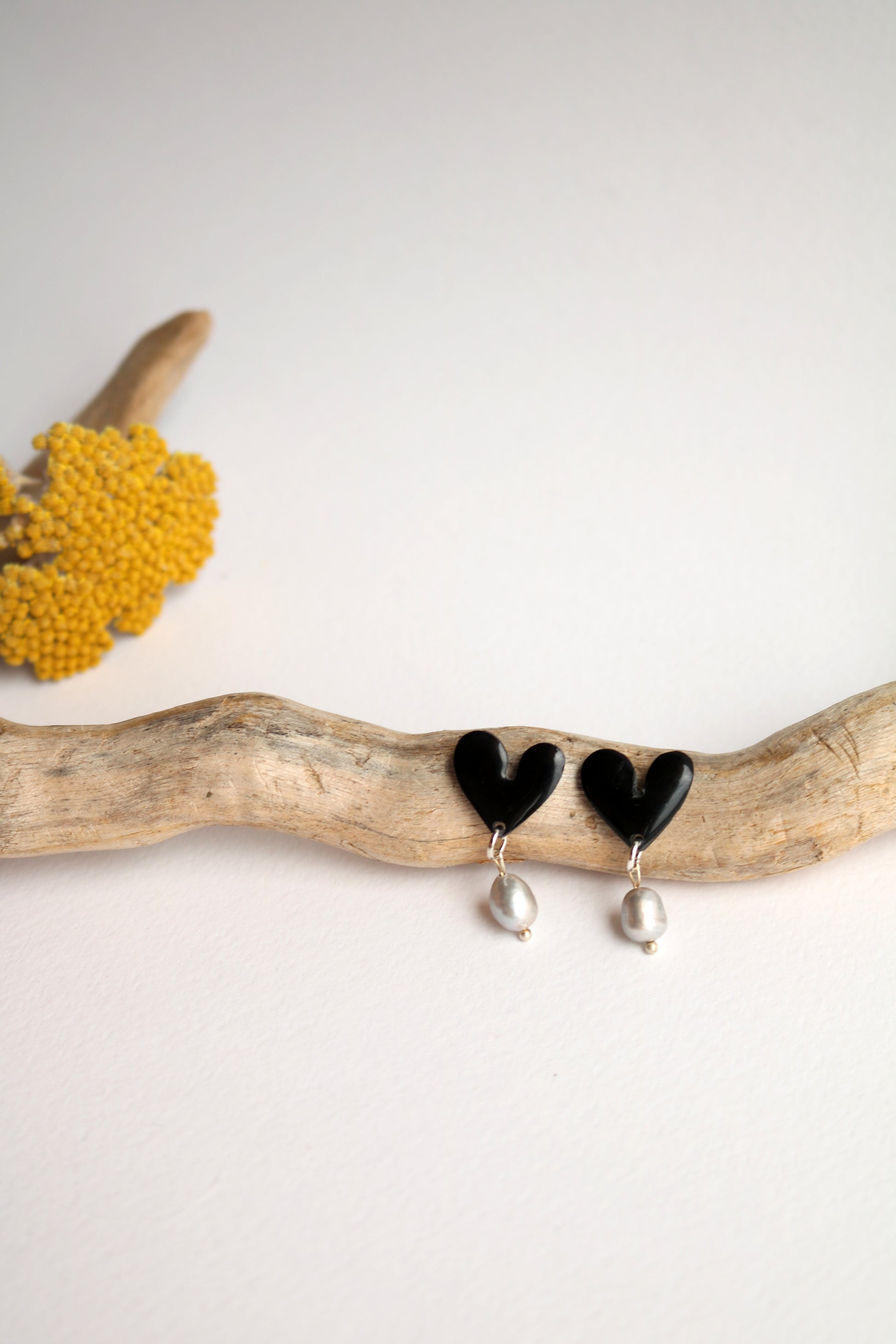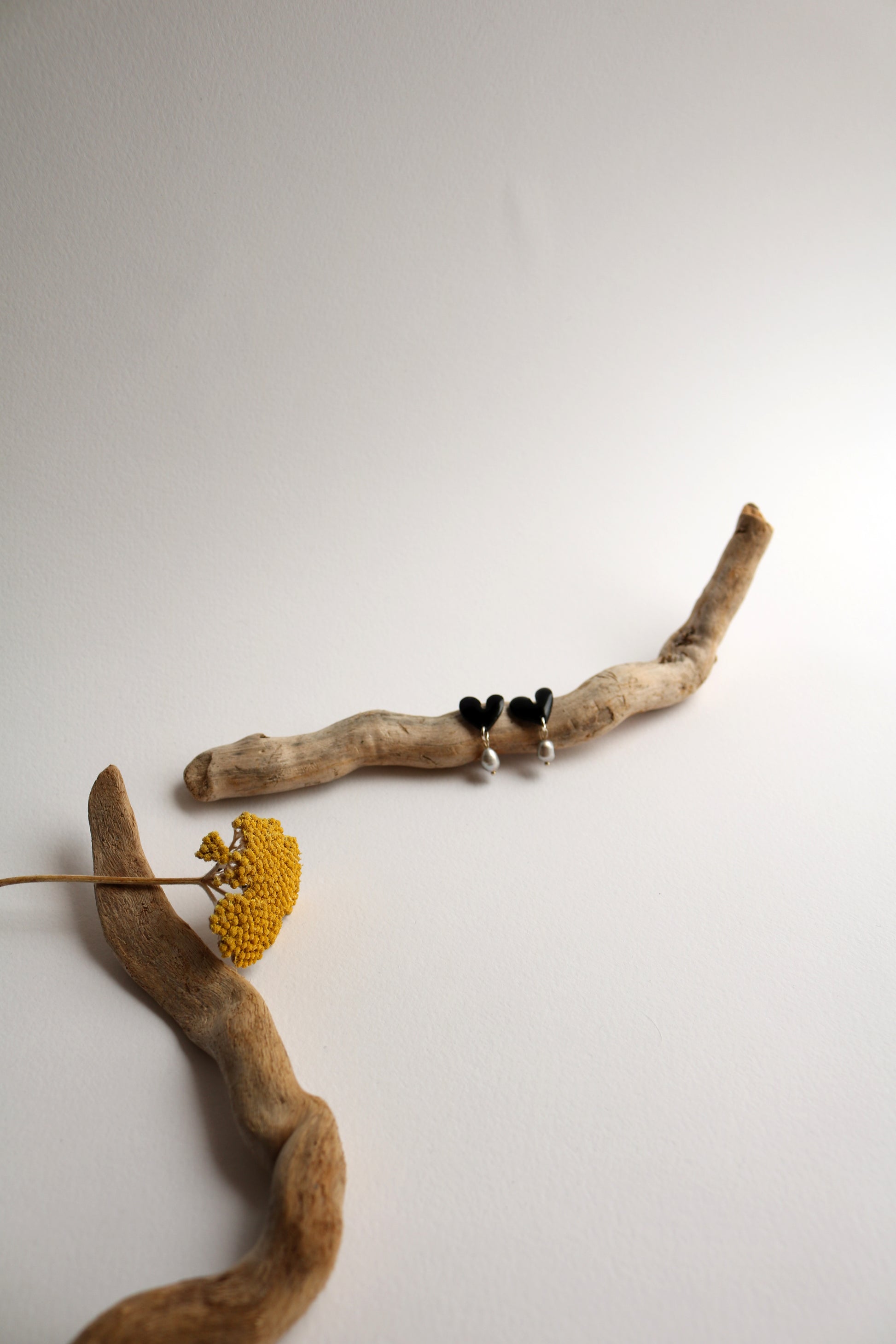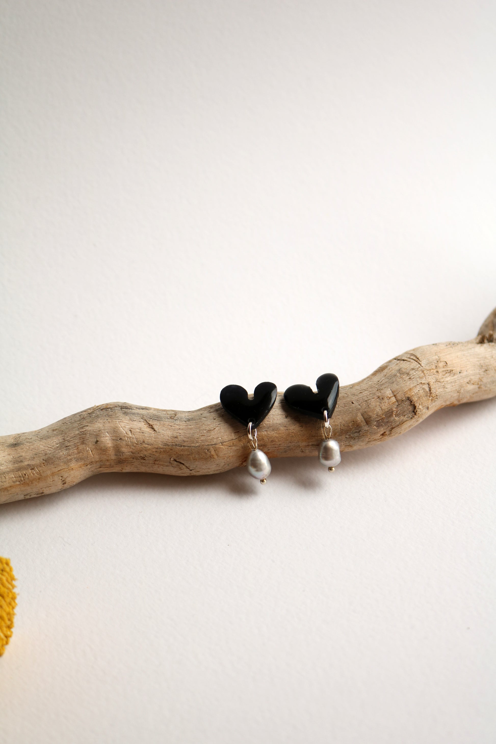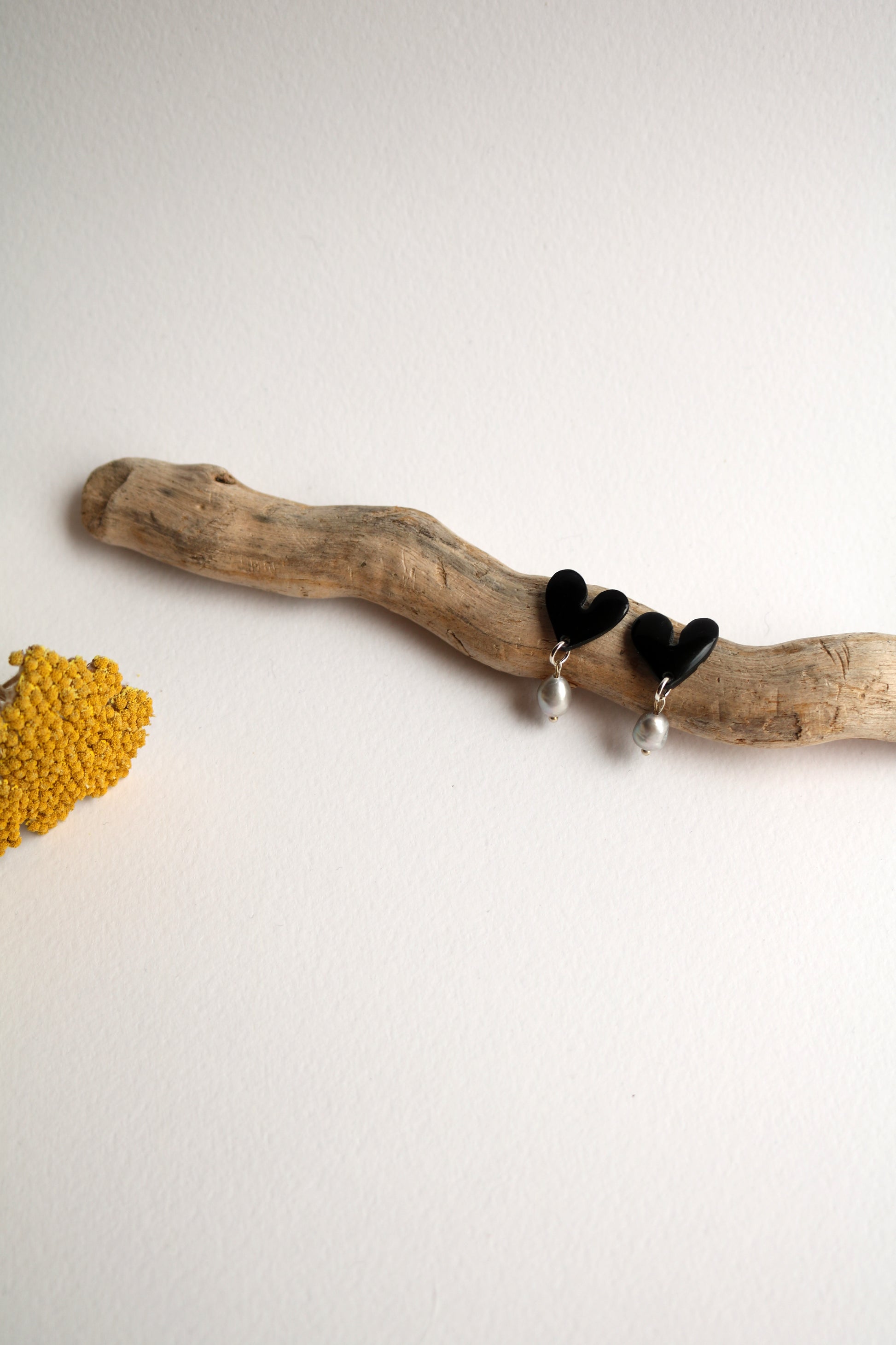Минималистични и елегантни, тези обеци съчетават нежността на естествени речни перли с модерната визия на малки черни сърца. Деликатният контраст между дълбокото черно и меката перлена светлина придава усещане за изтънченост и стил.