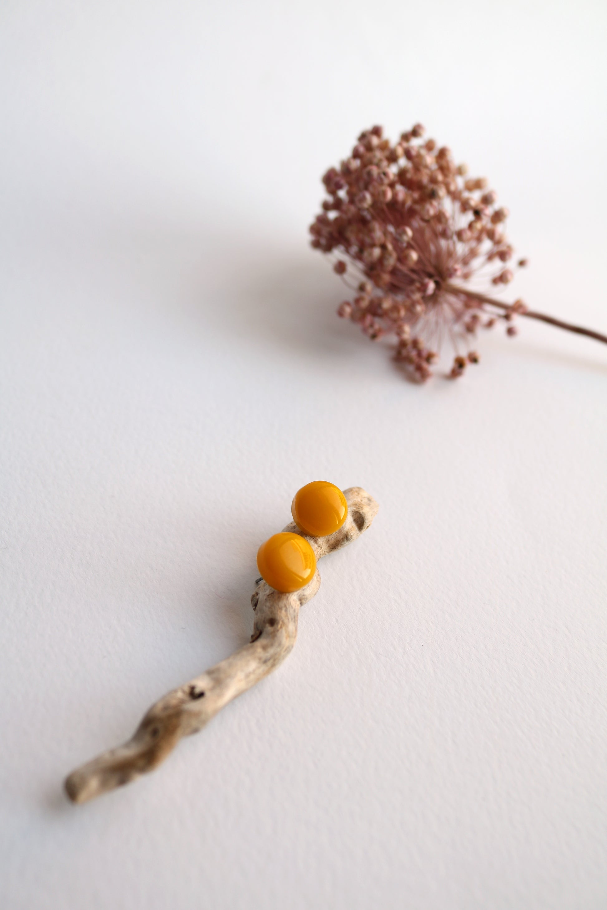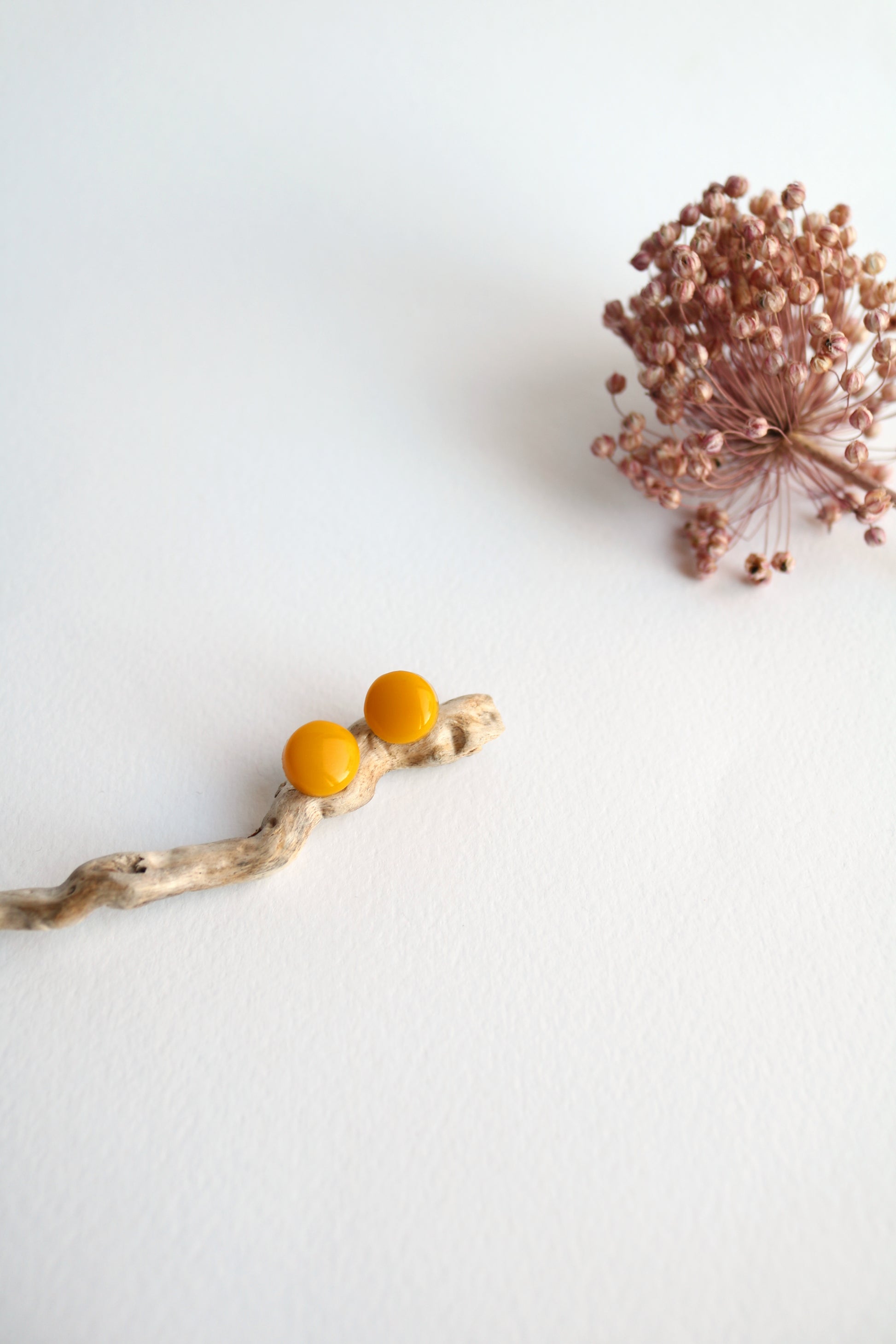 Малки кръгли обеци в свеж жълт цвят, изработени от епоксидна смола. Щифтовете са от неръждаема стомана. Леки, блестящи и удобни за всекидневно носене.