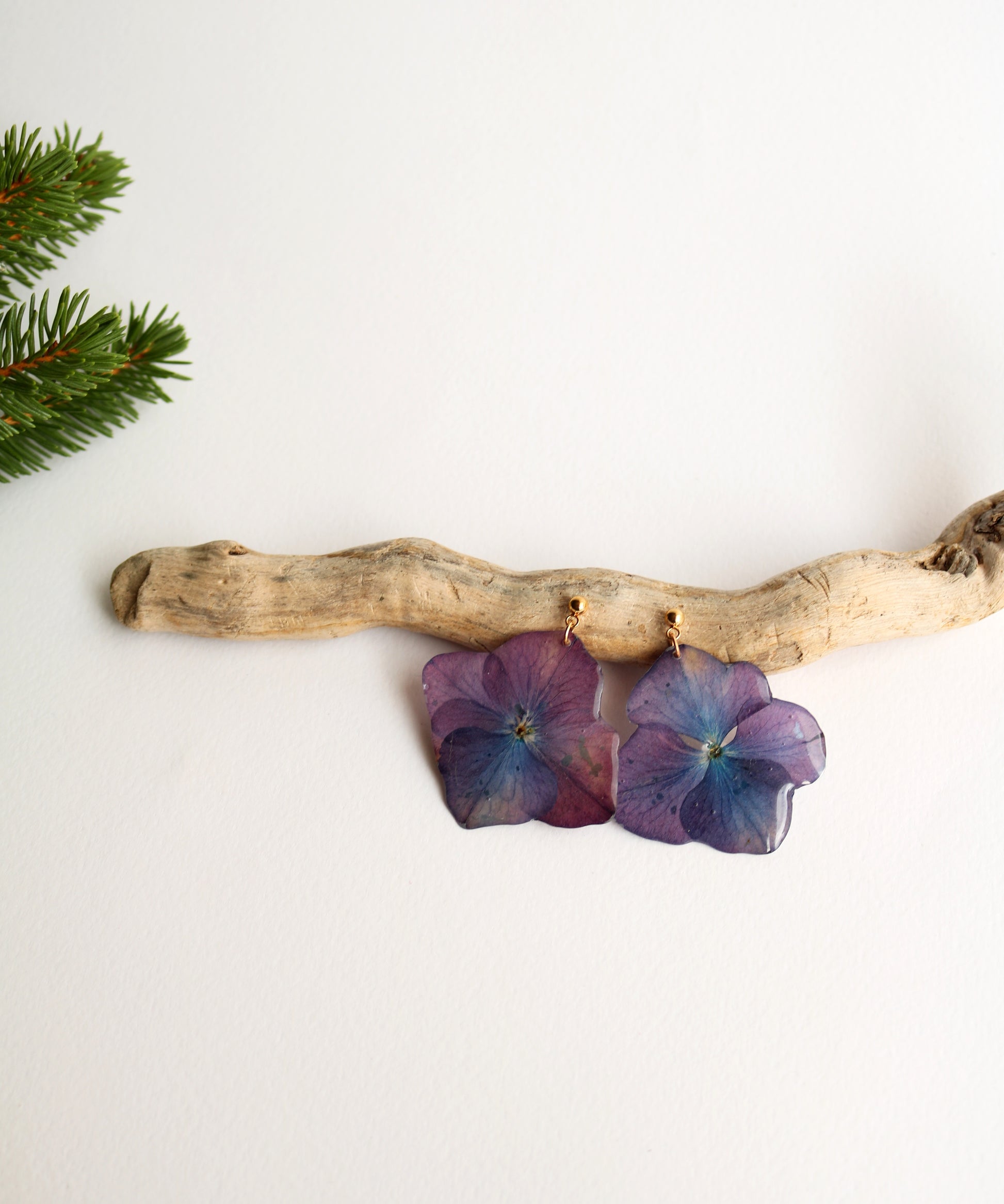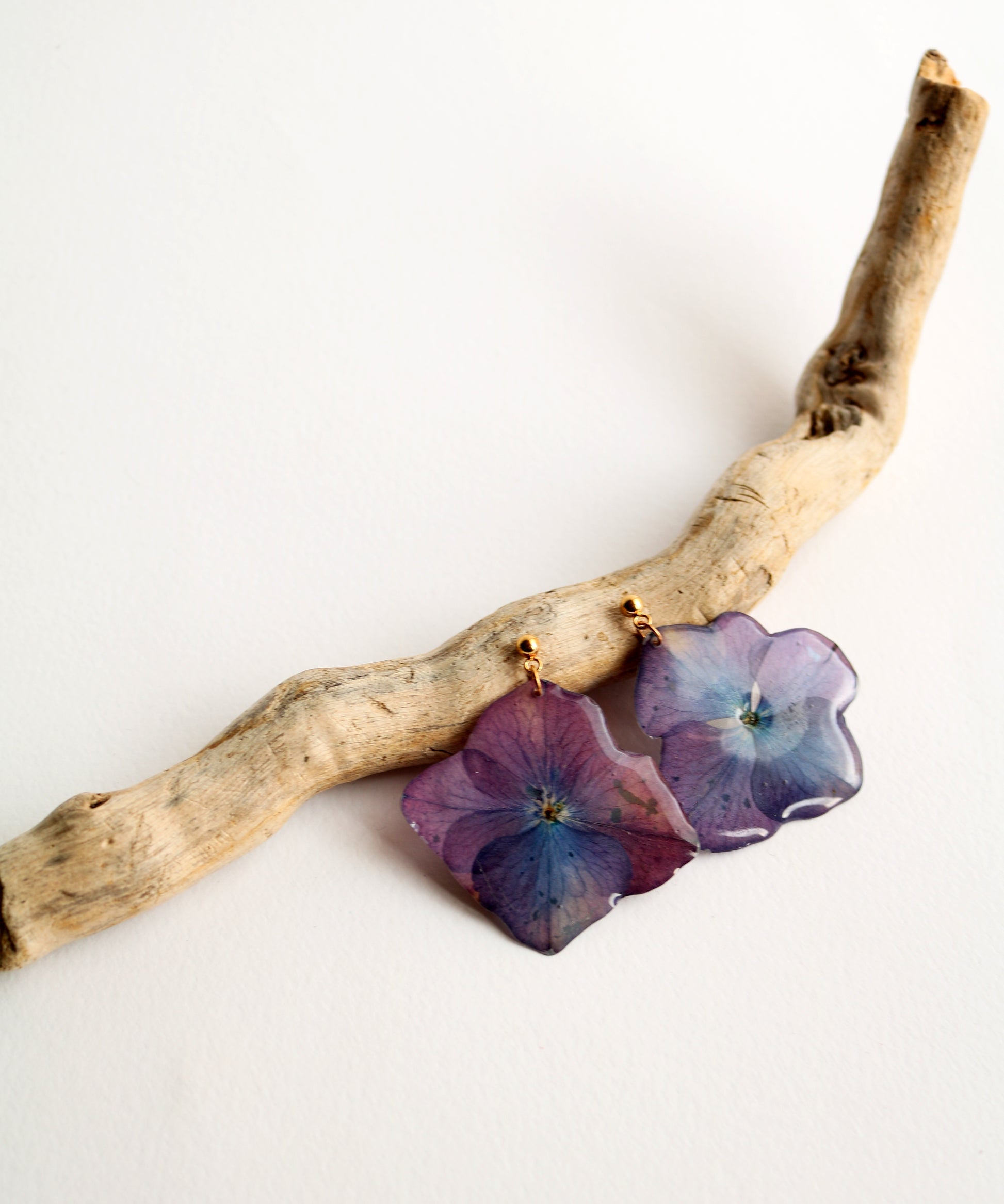 Обеци с истински цветове на хортензия, запазени в прозрачна епоксидна смола, които улавят красотата и деликатността на всяко цветче. Вълшебният лилав оттенък придава романтично и магическо усещане.