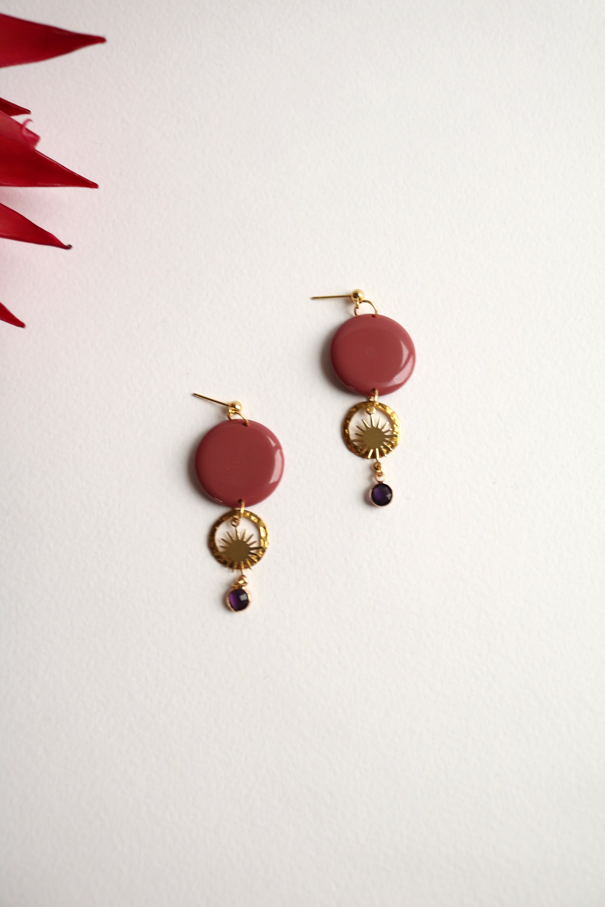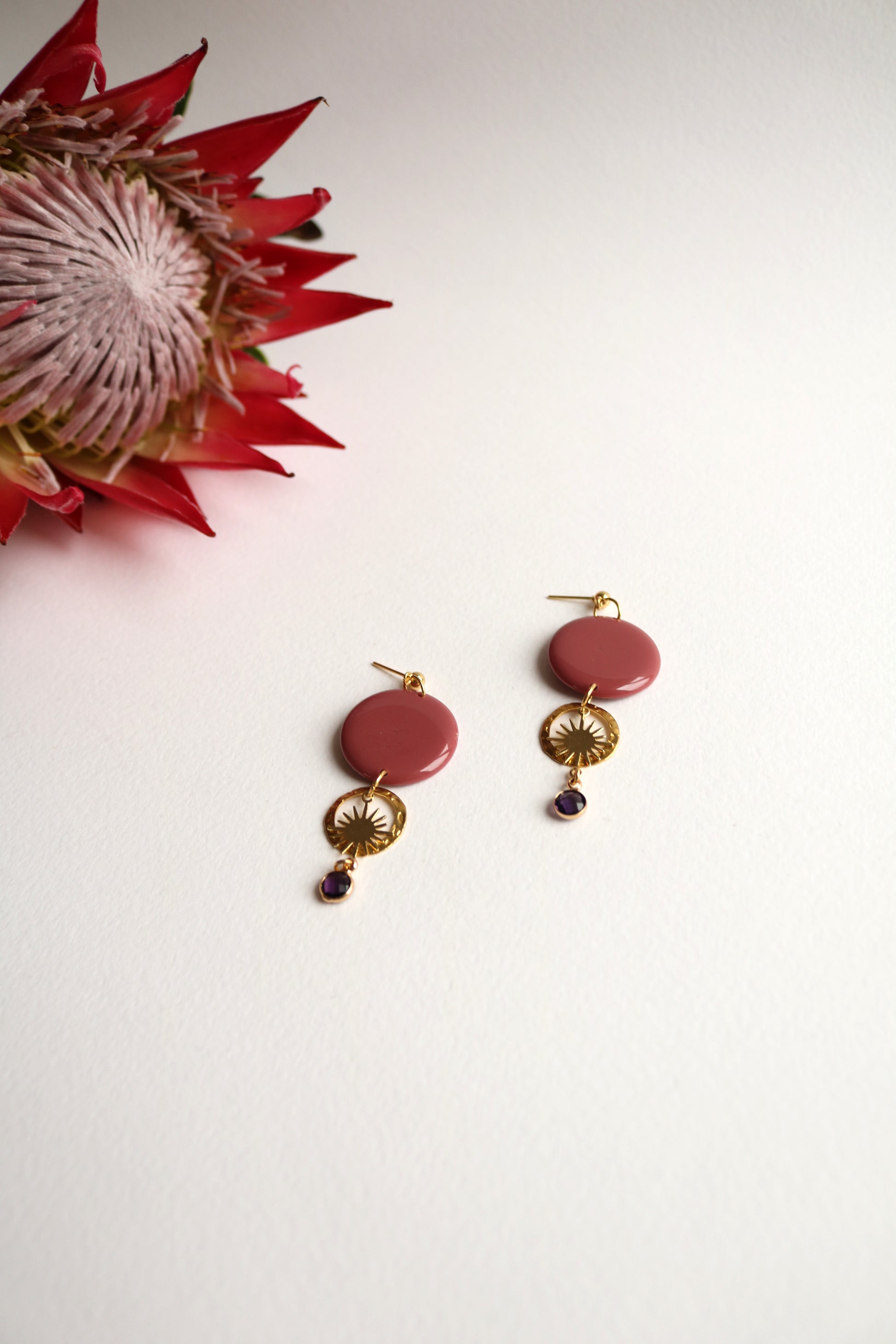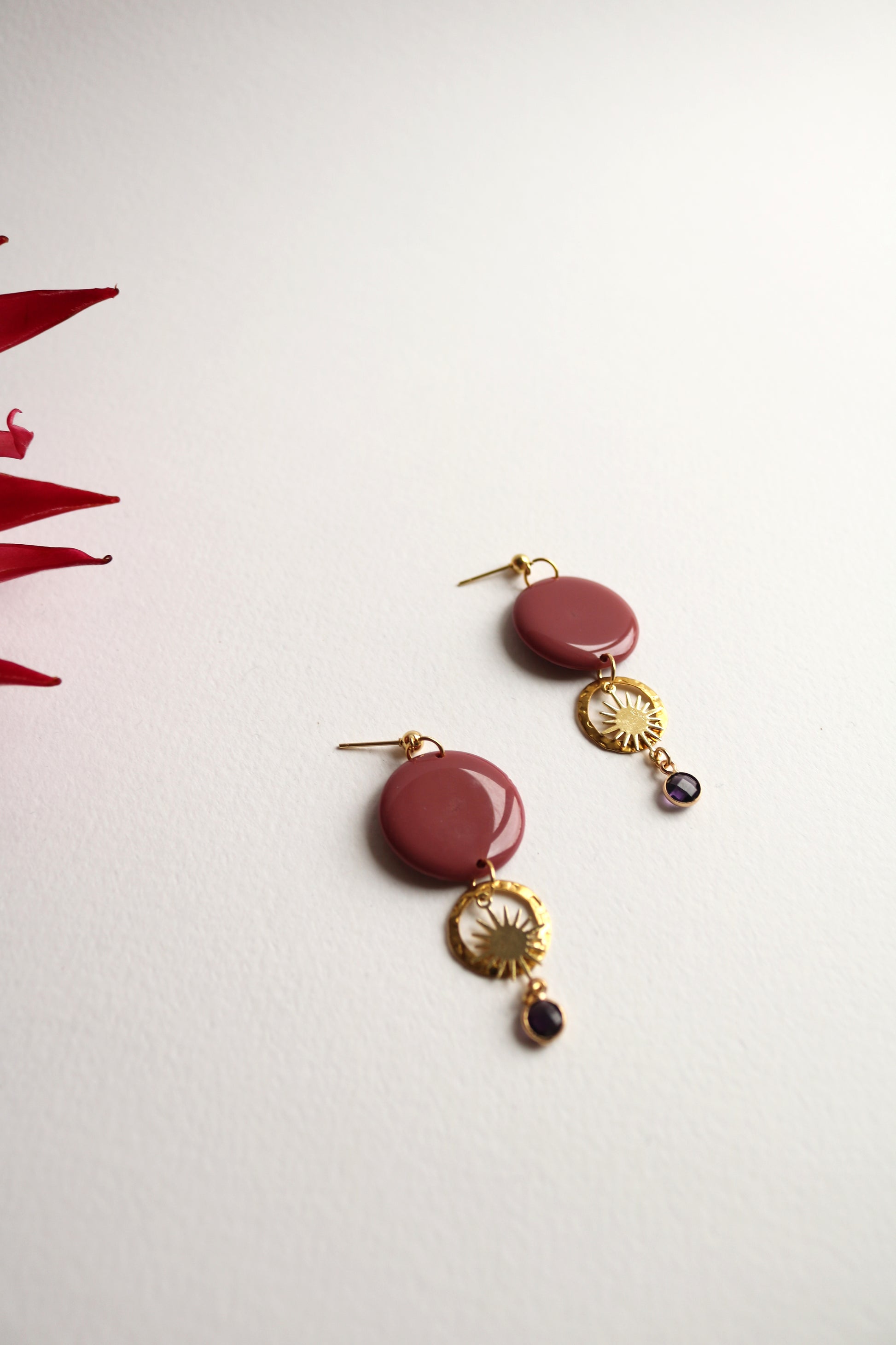 Епоксидни обеци в нежно розово, украсени със златни елементи, миниатюрно слънце и малко лилаво камъче. Комбинацията от топли и наситени тонове създава елегантен акцент, подходящ както за ежедневието, така и за специални поводи.