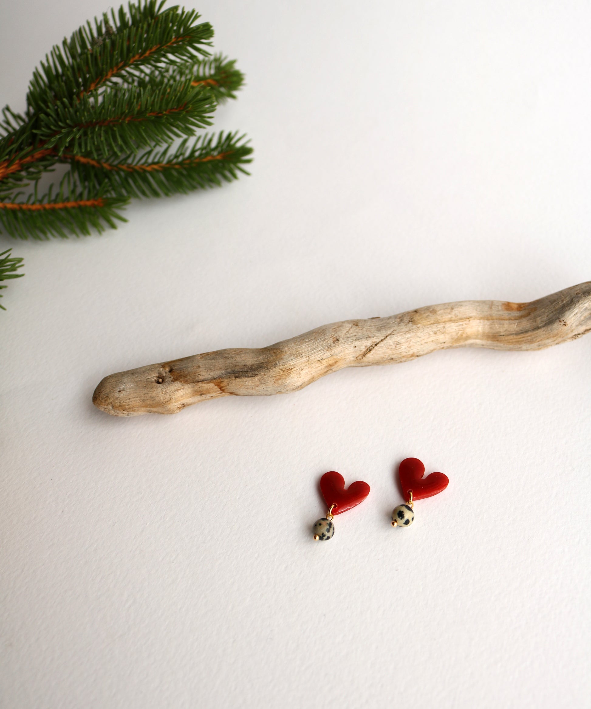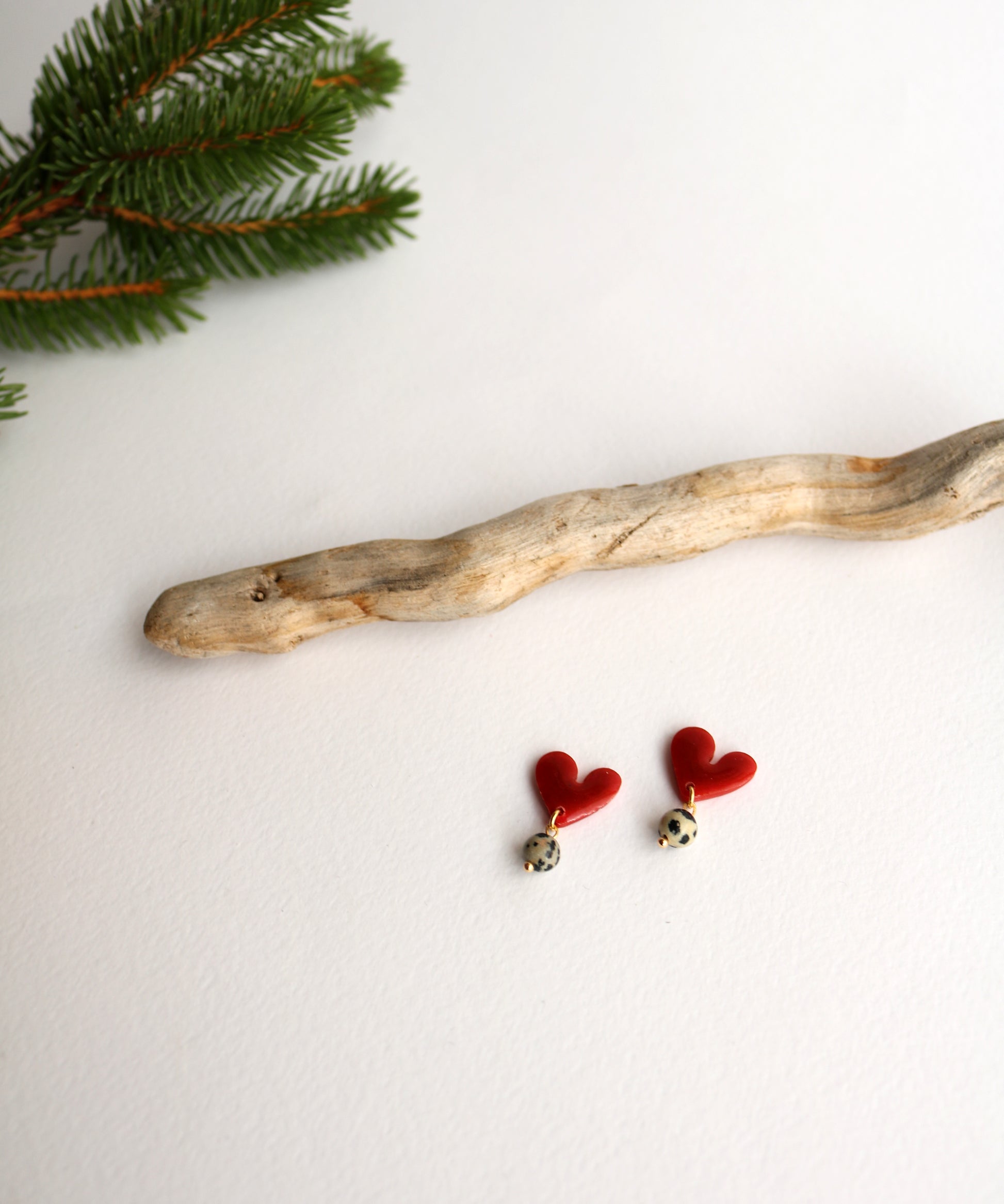 Малки обеци със сърца, изработени от смола и естествен яспис. Лек дизайн с щифтове от силикон, които са удобни и хипоалергенни, подходящи за всекидневно носене. Ясписът носи усещане за баланс, спокойствие и вътрешна сила, като подпомага яснота на мисълта и устойчивост в ежедневието.