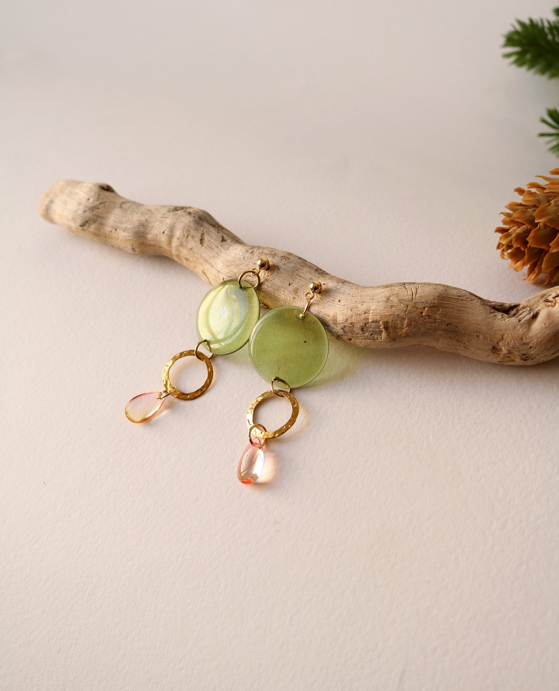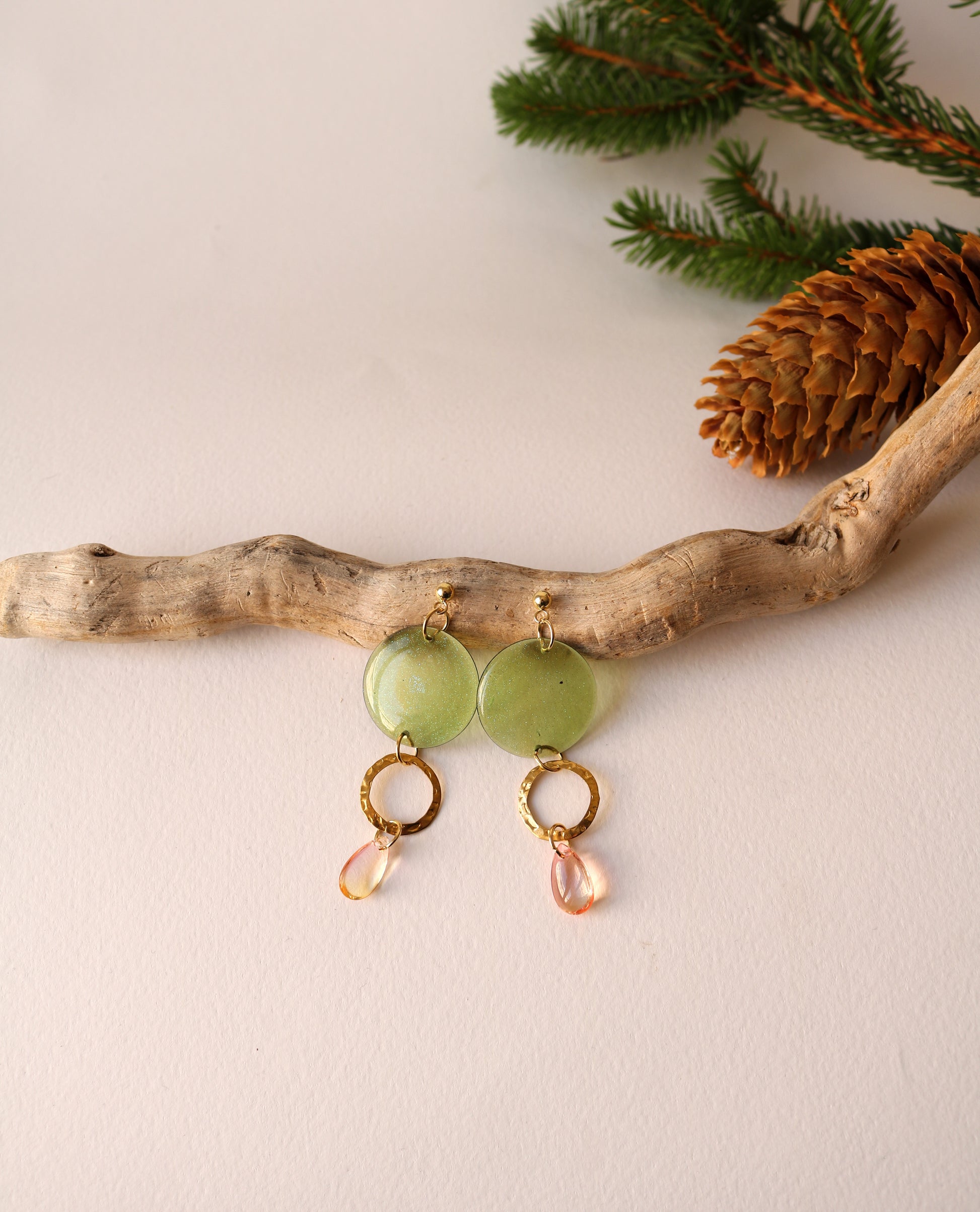Ръчно изработени обеци в светло зелено с нежни висящи капки от стъкло.