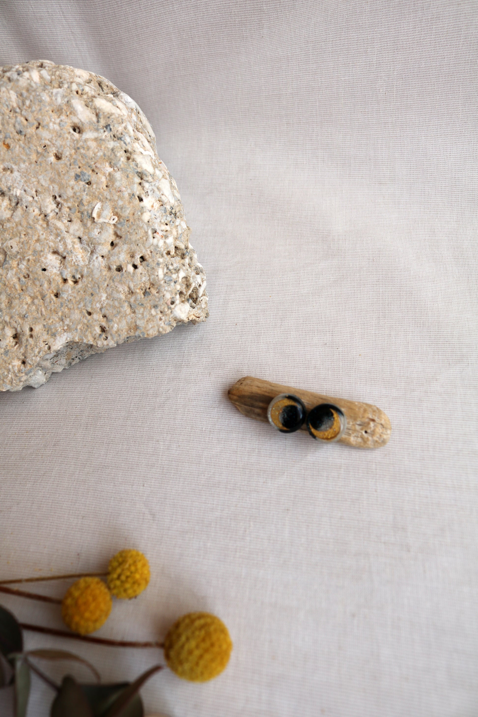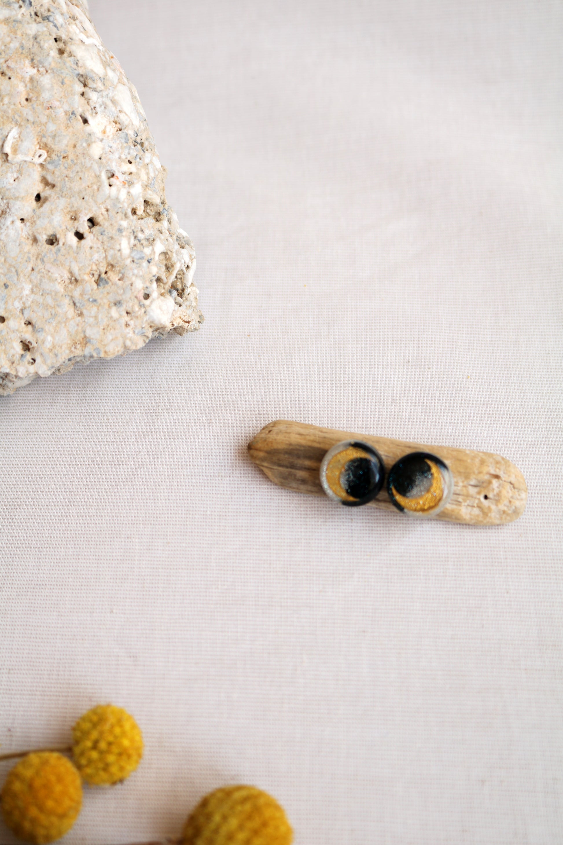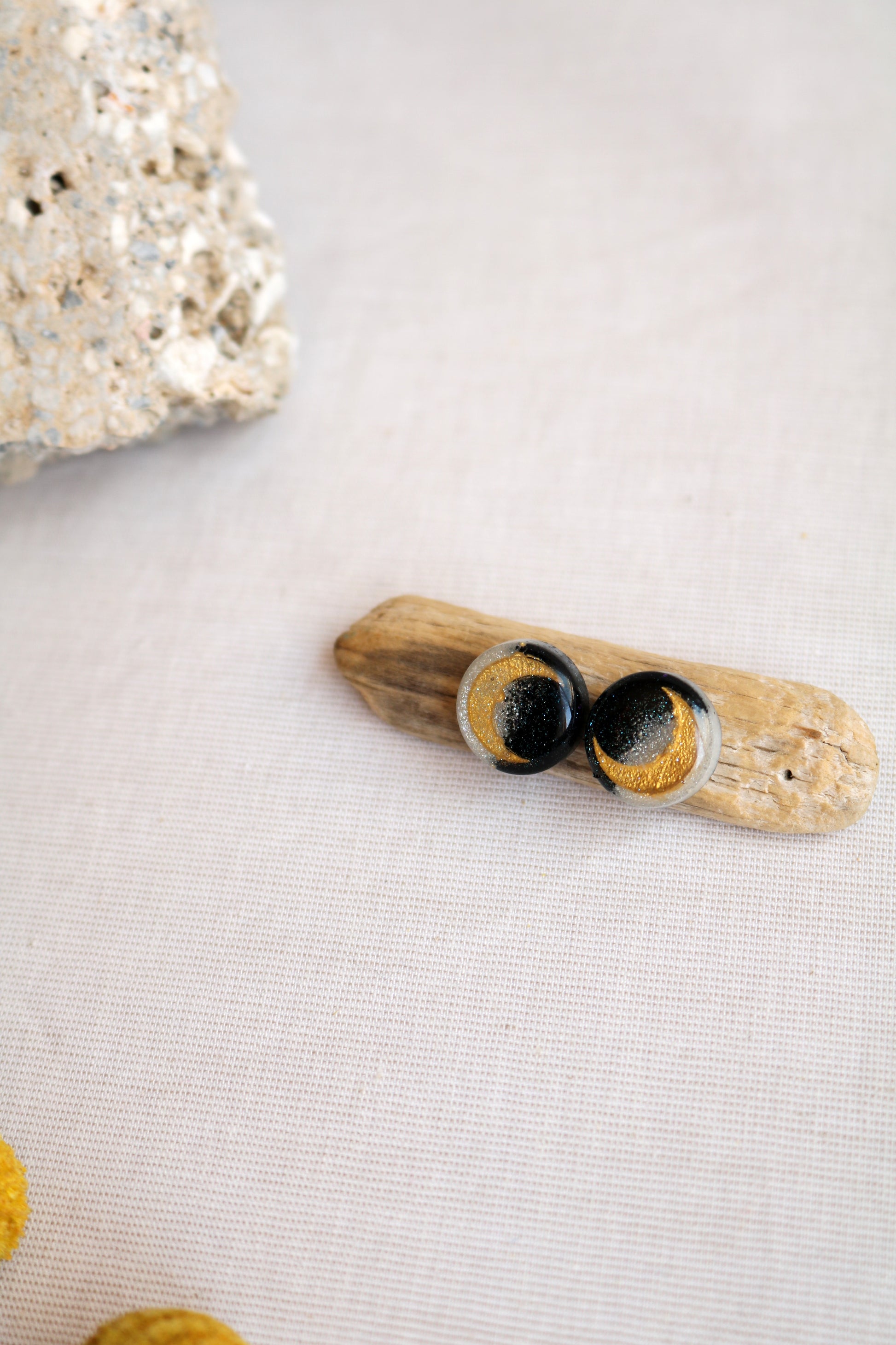 Малки обеци, изработени от епоксидна смола. Вълшебен полумесец в златист цвят. Щифтове от неръждаема стомана.