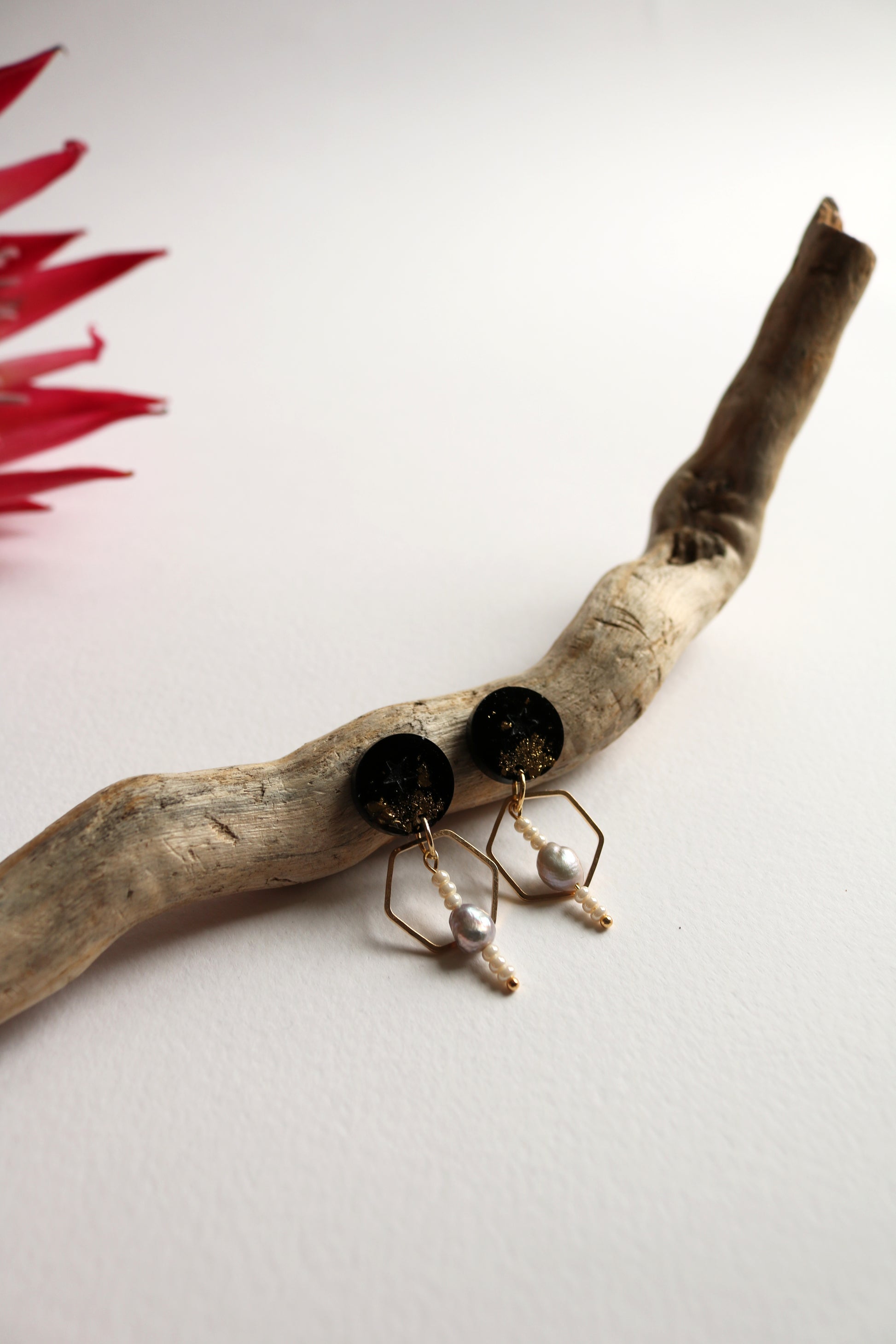 Кръгли обеци с деликатни речни перли и стъклени мъниста. Леките и елегантни орнаменти съчетават тъмна романтика и нежност. Изработени от епоксидна смола. Щифтове от неръждаема стомана.