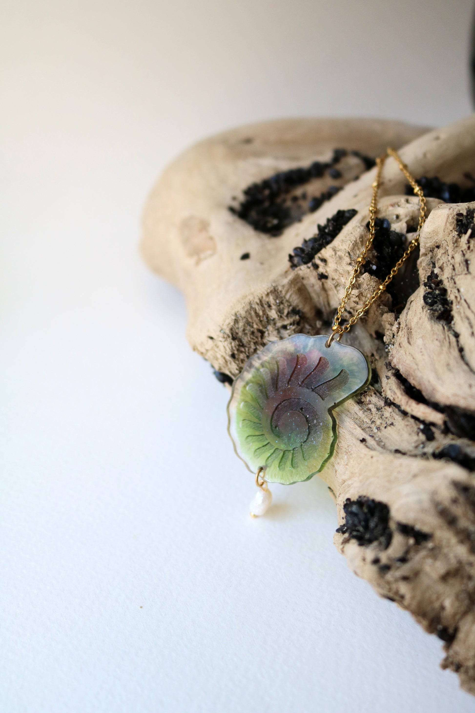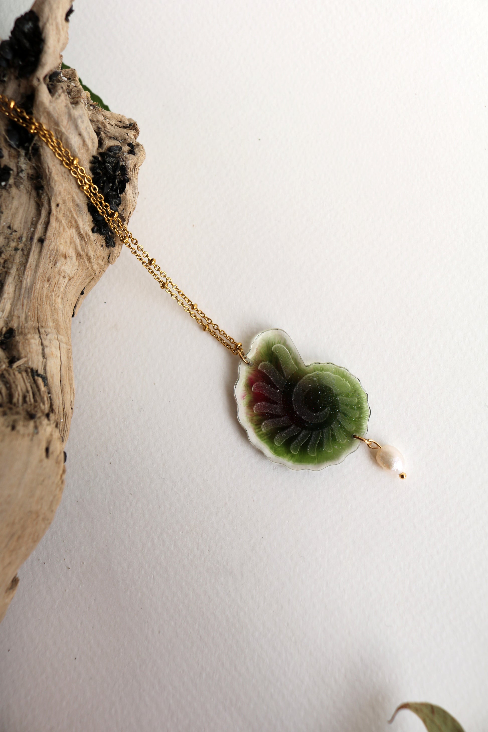 Ръчно изработено колие с зелена спирала. Комбинация между речна перла, смола и верижка със златен цвят.