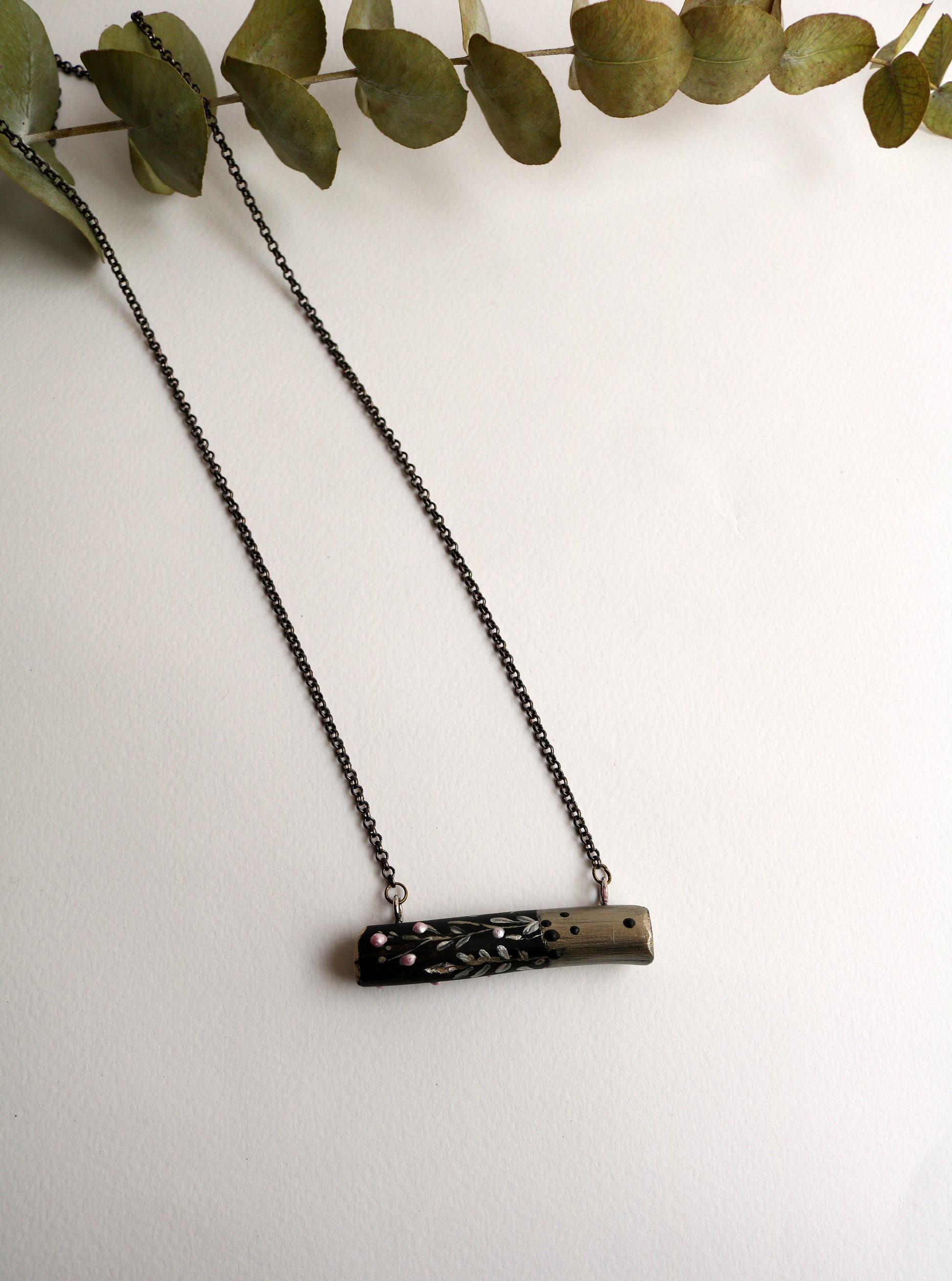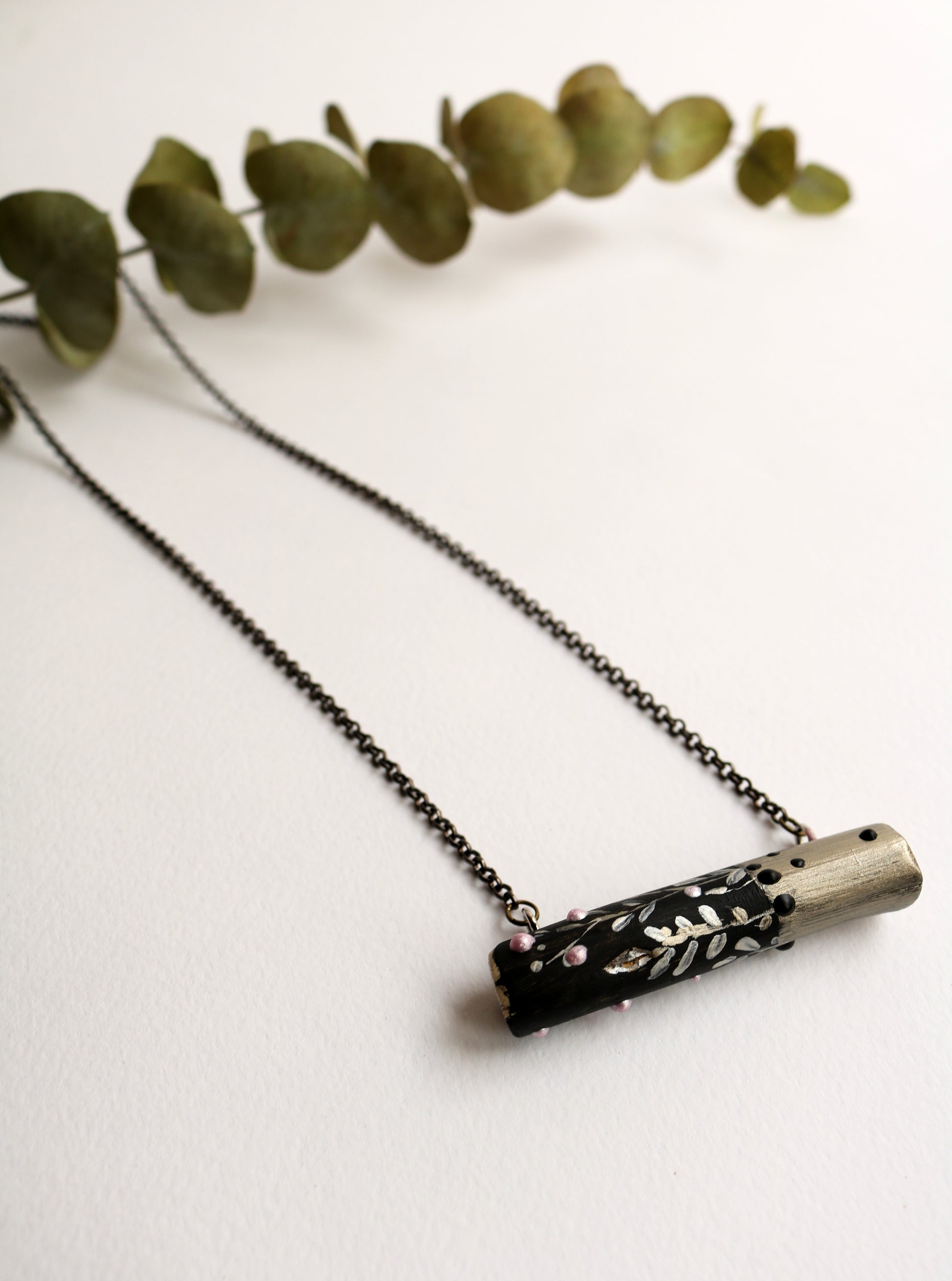 Всяка пръчка е изработена и ръчно изрисувана от талантливата Милена Неделчева. Деликатният дизайн комбинира сребристи точки и малки цветя, носещи нежност, магия и естествен чар. Лекият и изящен гердан е перфектен акцент за всеки ден или специален повод. Дължина на верижката 40 см, дължина на пръчката 6 см.