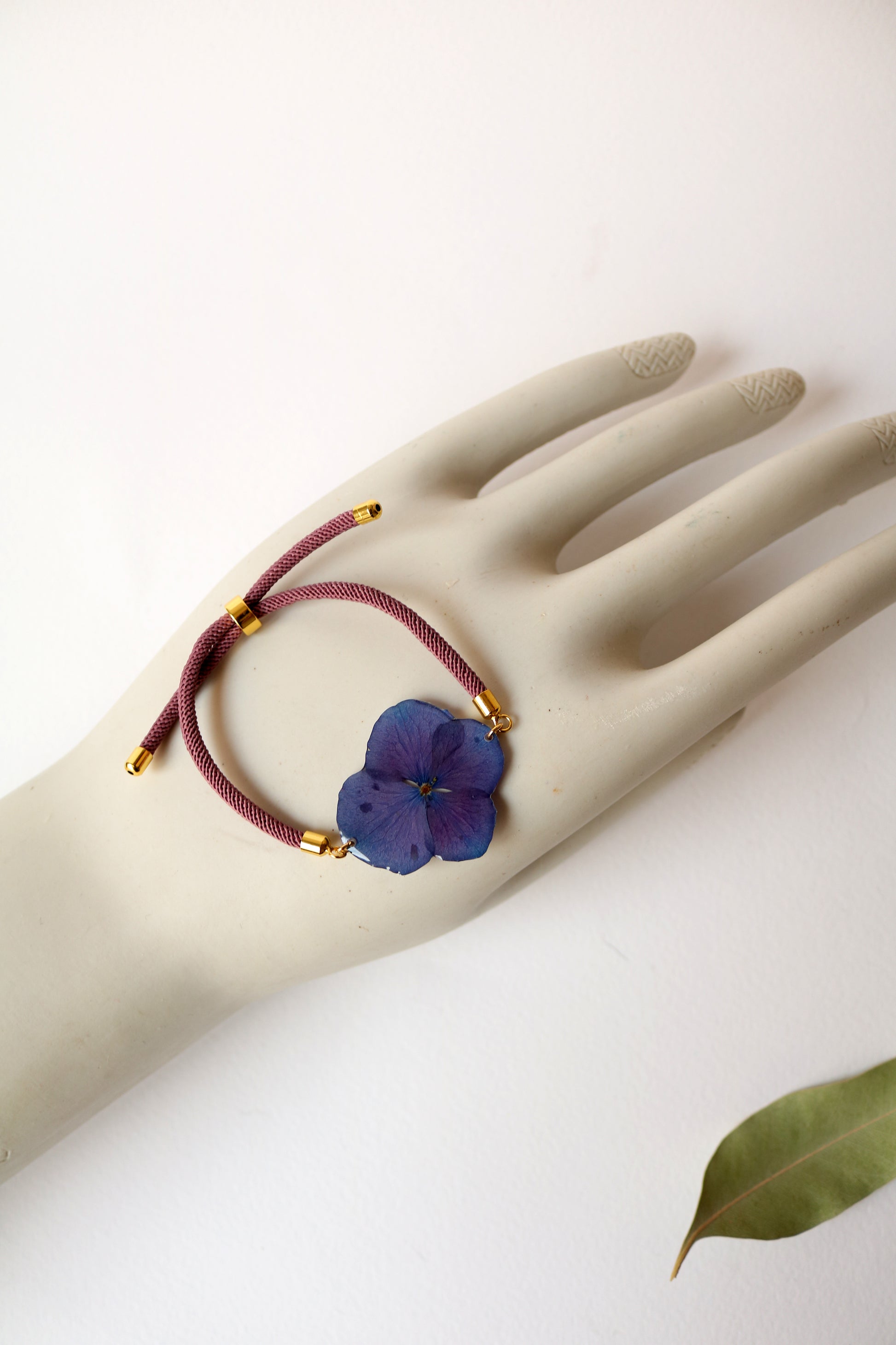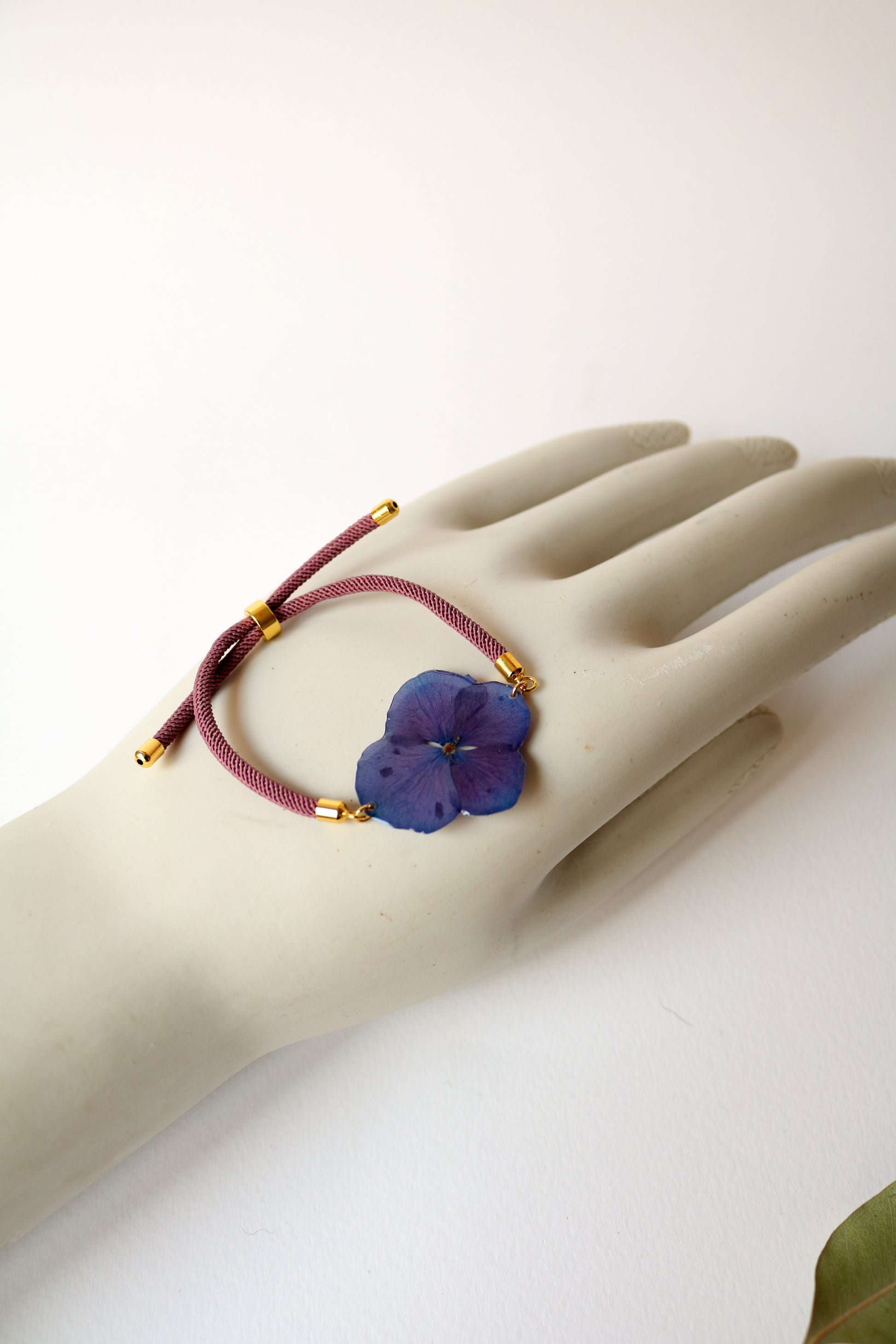Ръчно изработена гривна с истински цветове от хортензия, запечатани в смола. Всяко цвете е внимателно подбрано и обработено, за да запази естествената си красота. Елегантен и уникален аксесоар, идеален за всеки ден или подарък. Истинска прегръдка от природата. Гривната се регулира и е универсален размер.
