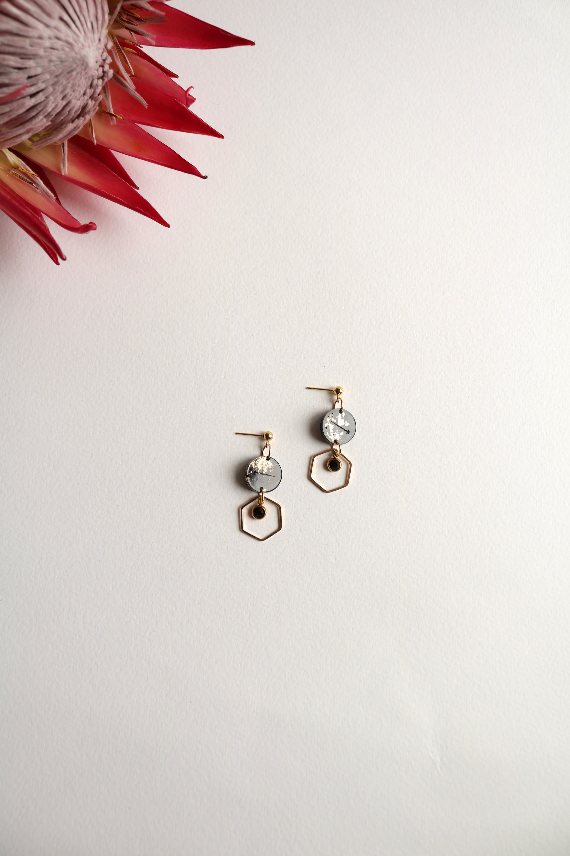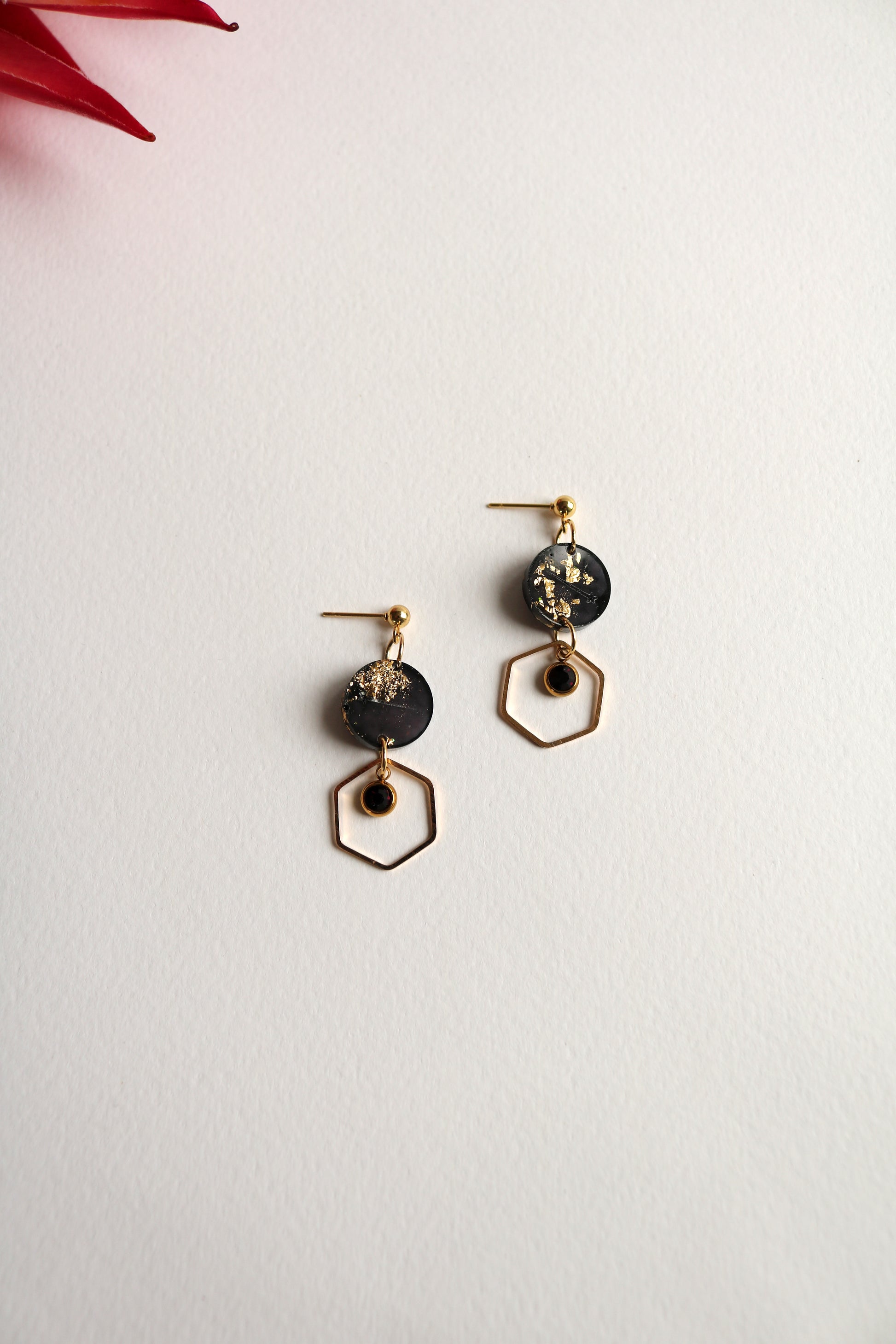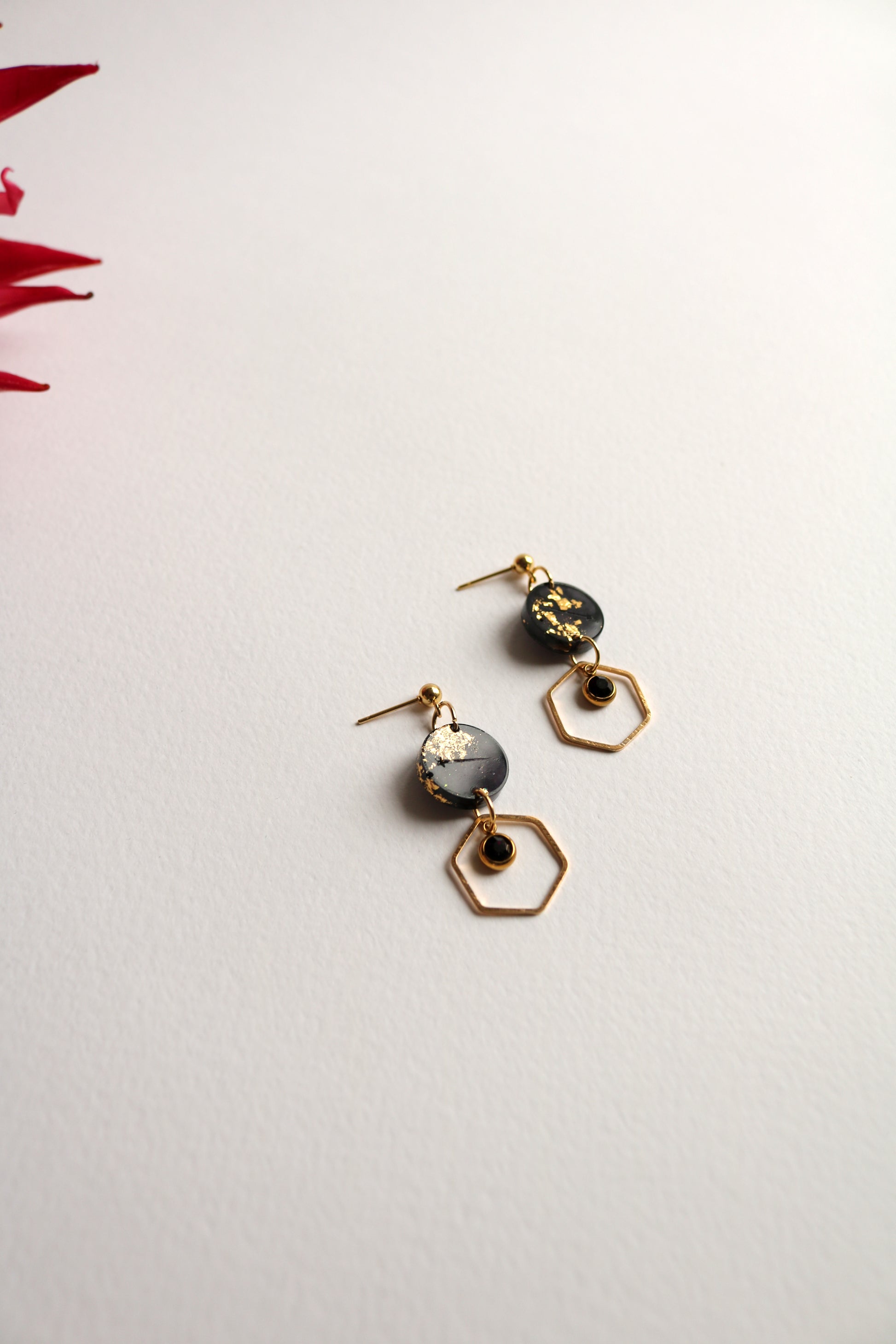 Обеци, изработени от епоксидна смола. В черен цвят със златен елемент. На самите кръгчета има падаща звезда. Елегантни, мистични и готови за есента. Щифтове от неръждаема стомана.
