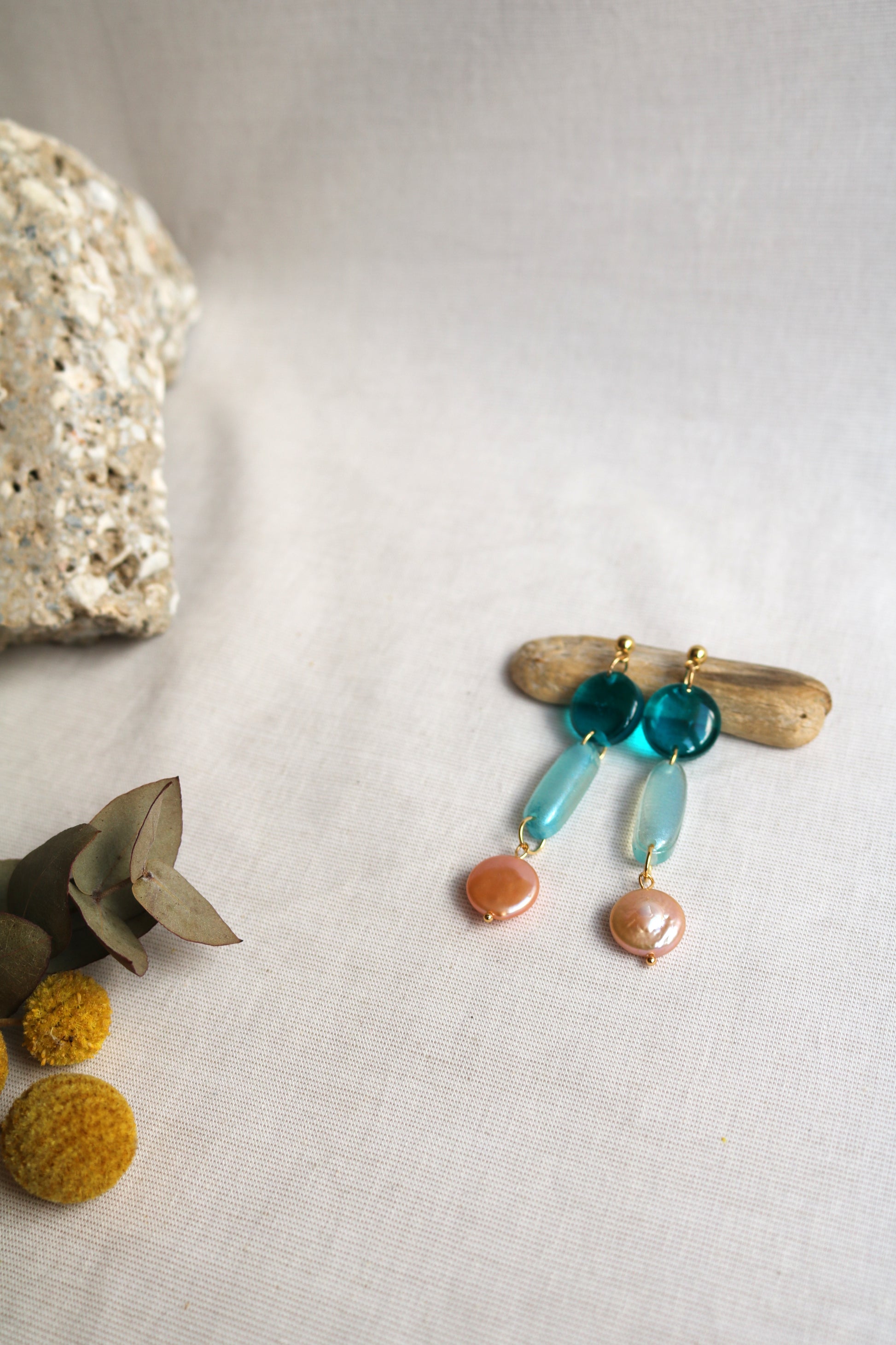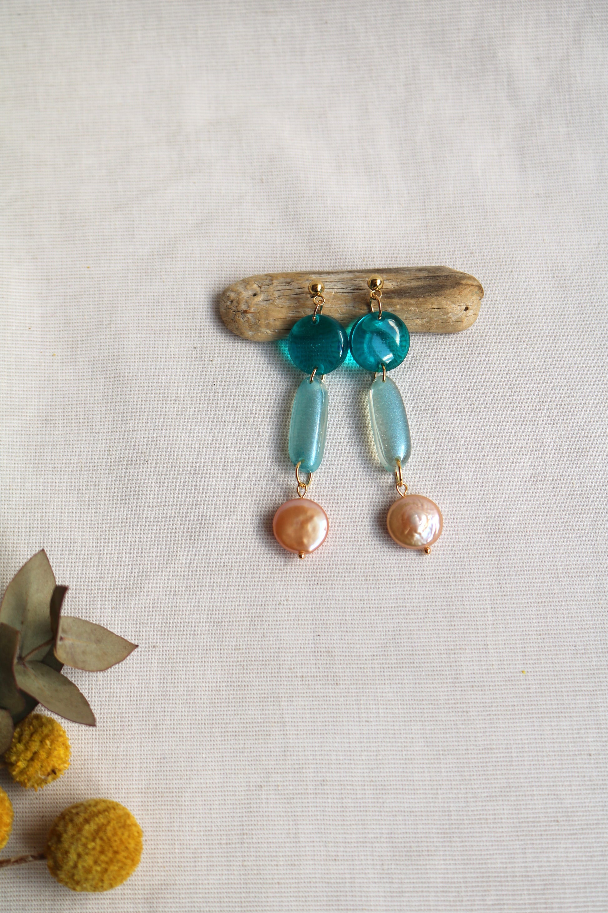Една комбинация от перла и любимото синьо. Висящи обеци, изработени от епоксидна смола, щифтове от неръждаема стомана. С дъх на море.