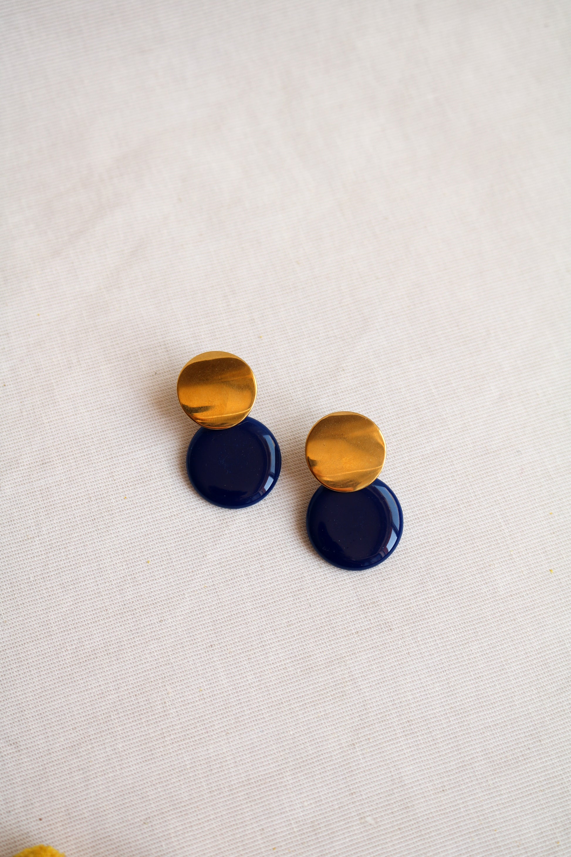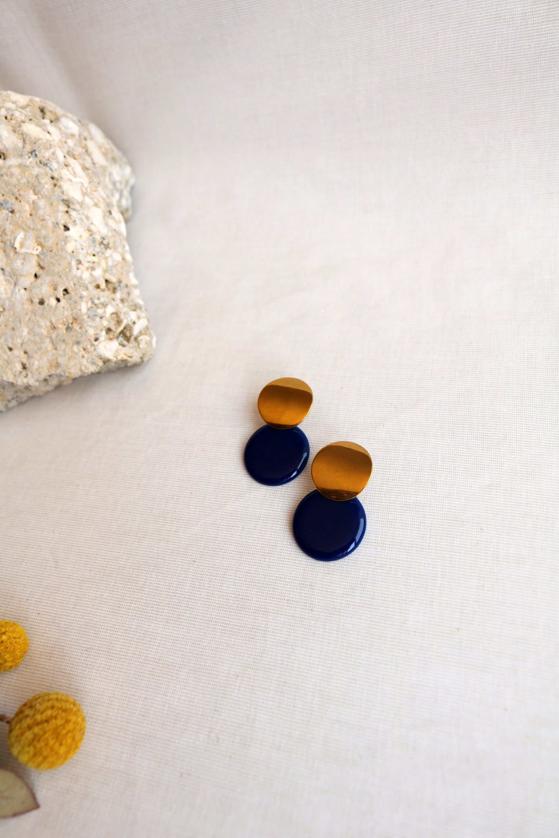 Обеци, изработени от епоксидна смола. Много плътен и дълбок син цвят. Комбинирани с метал в златен цвят. Напомнят за една мистичност.