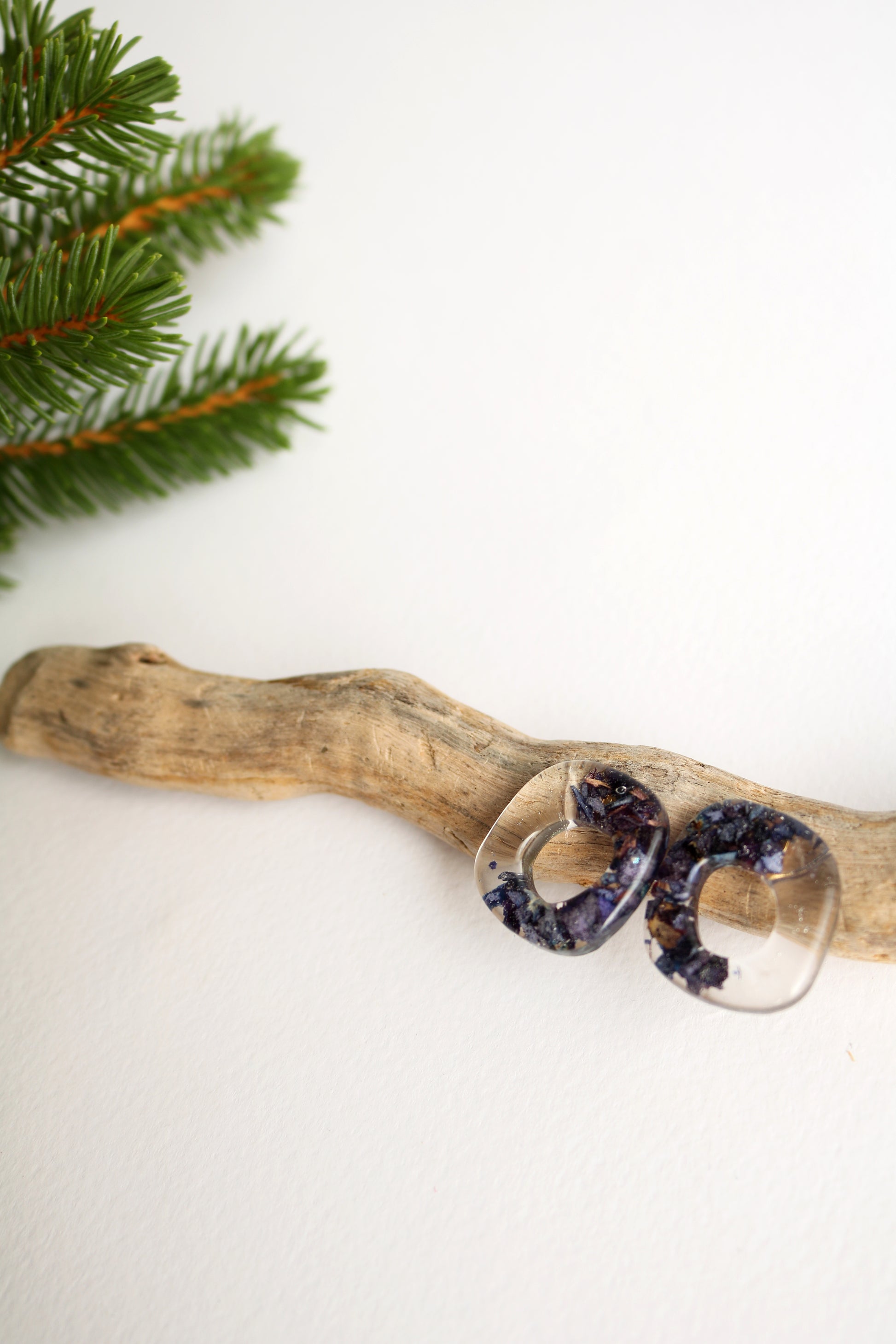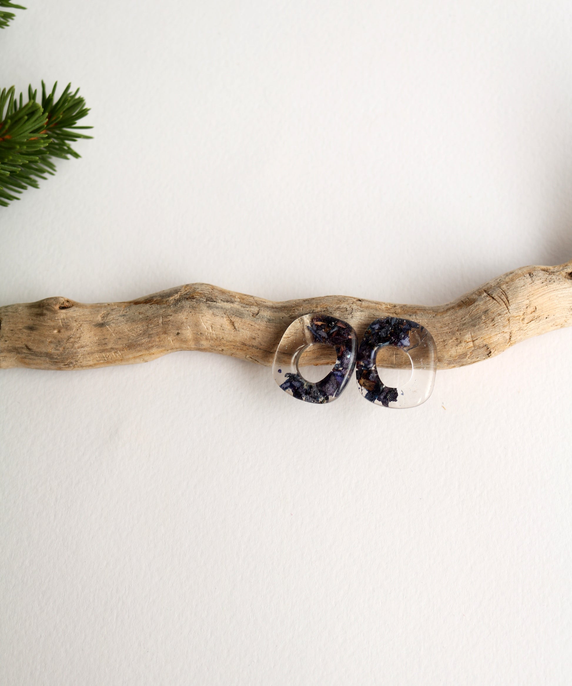 Обеци с неправилна, органична форма. Комбинацията от красотата на естествения цвят и прозрачна епоксидна смола. Всяка обеца носи уникален и естествен чар. Леките и изчистени форми ги правят подходящи за ежедневието или за добавяне на фин, изискан акцент към по-специален аутфит.