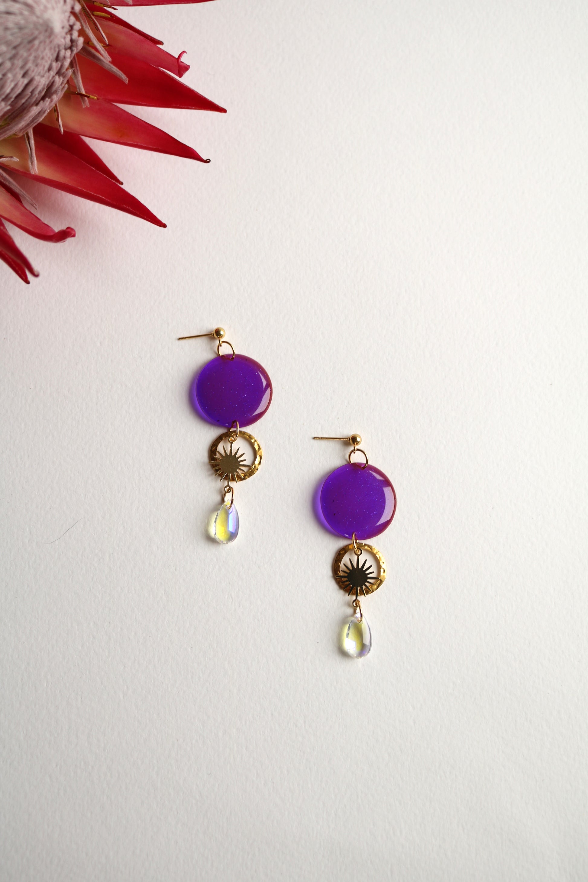 Ръчно изработени обеци от епоксидна смола. Съчетаващи виолетов цвят и златния кръг, те създават усещане за баланс, спокойствие и стил. Слънцето и капката са нежно допълнение и идеалният завършек.