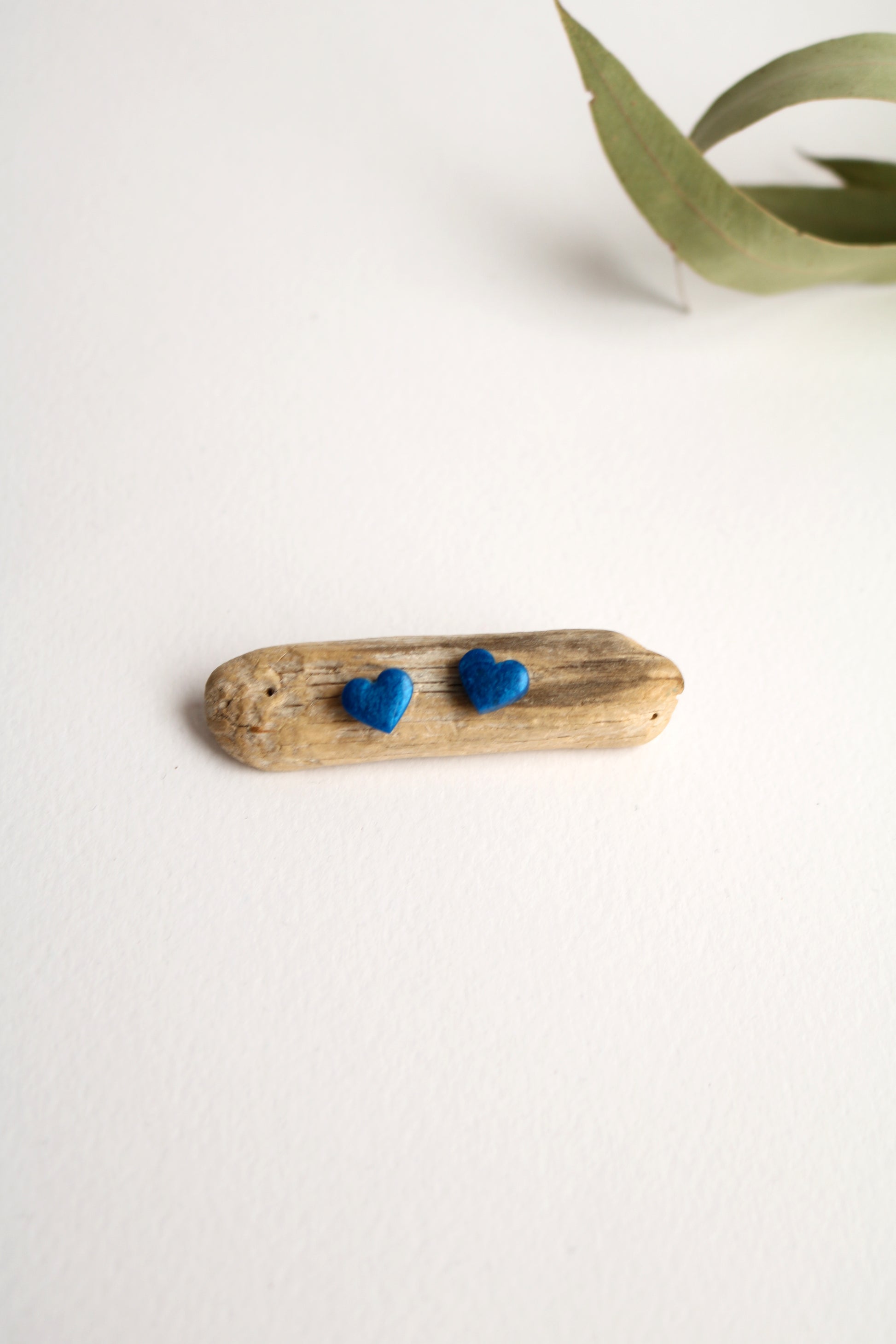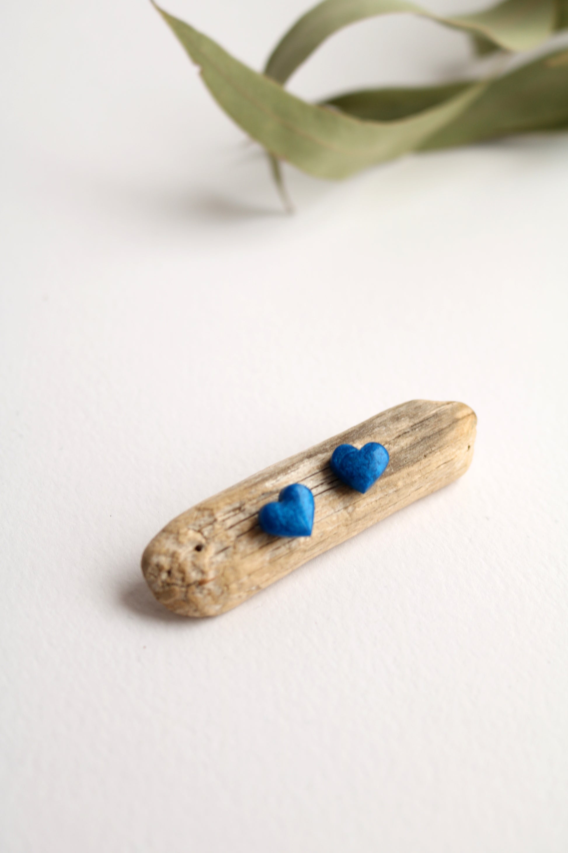 Ръчно изработени обеци от епоксидна смола във формата на сърца. Нежни, малки и много удобни. Красив син цвят, който придава акцент на всяко облекло. Щифтове от неръждаема стомана.