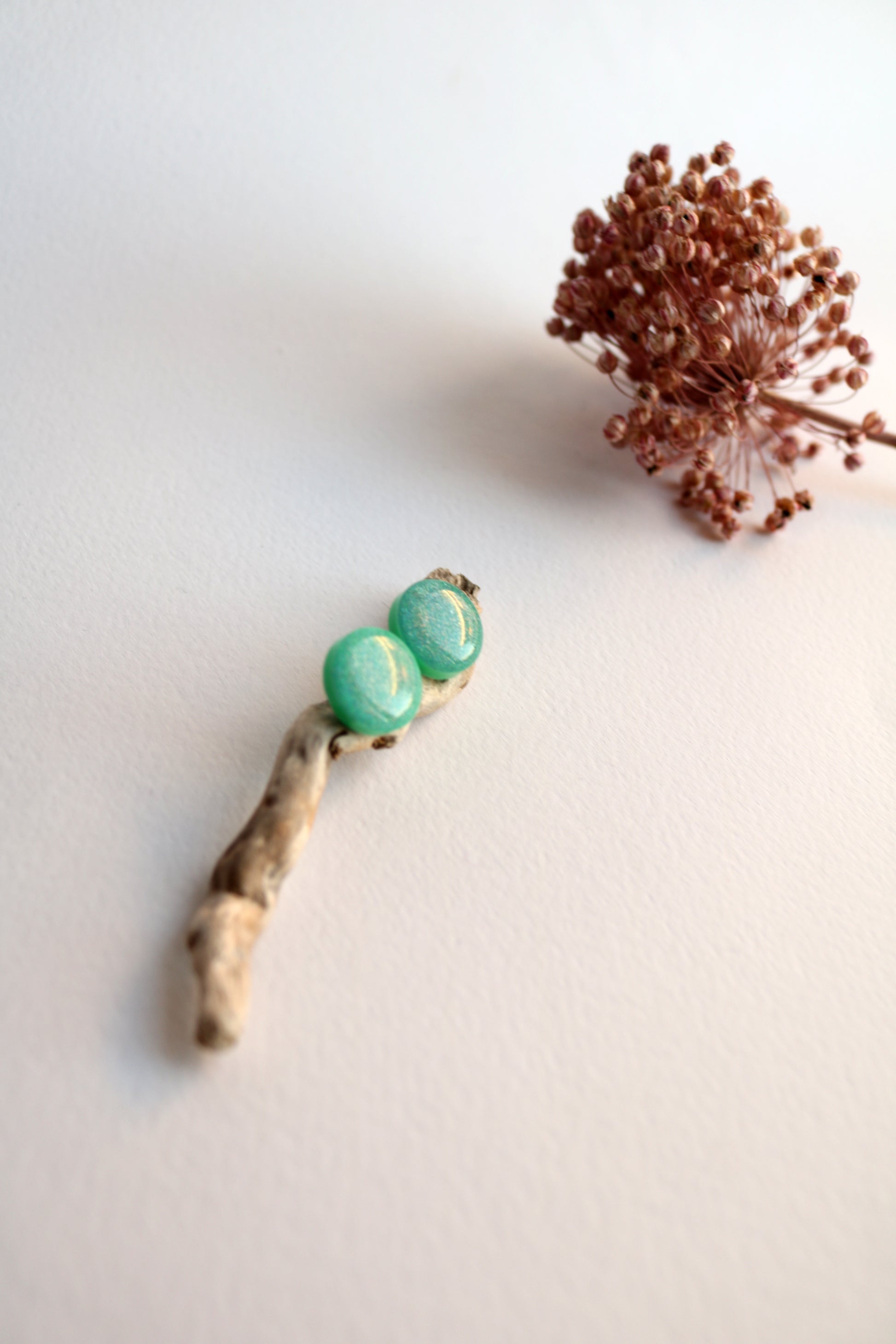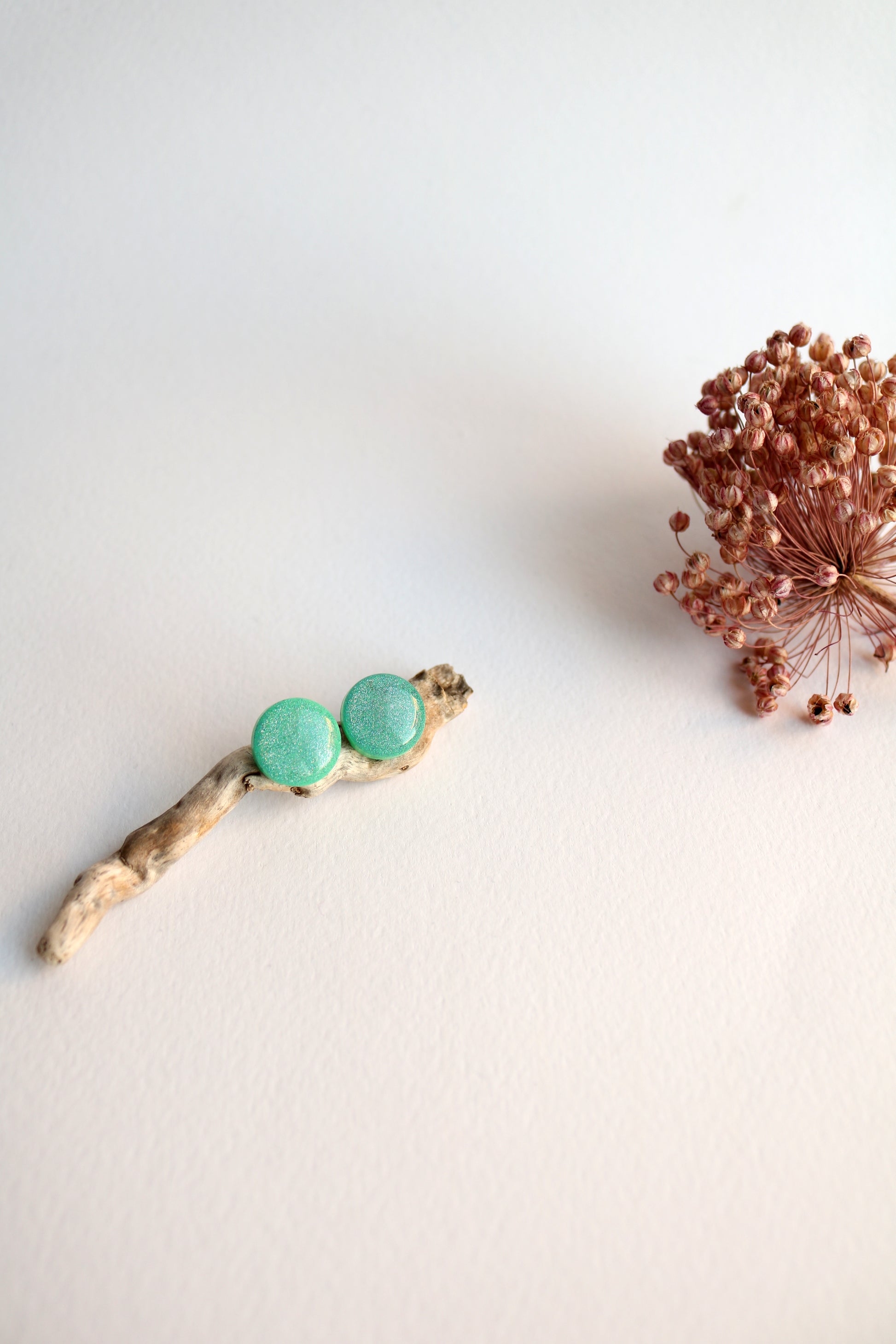 Елегантни обеци от епоксидна смола в наситен син цвят с лек брокатен блясък. Гладки и лъскави, те отразяват светлината по нежен начин. Леки и удобни за носене, с щифтове от неръждаема стомана.