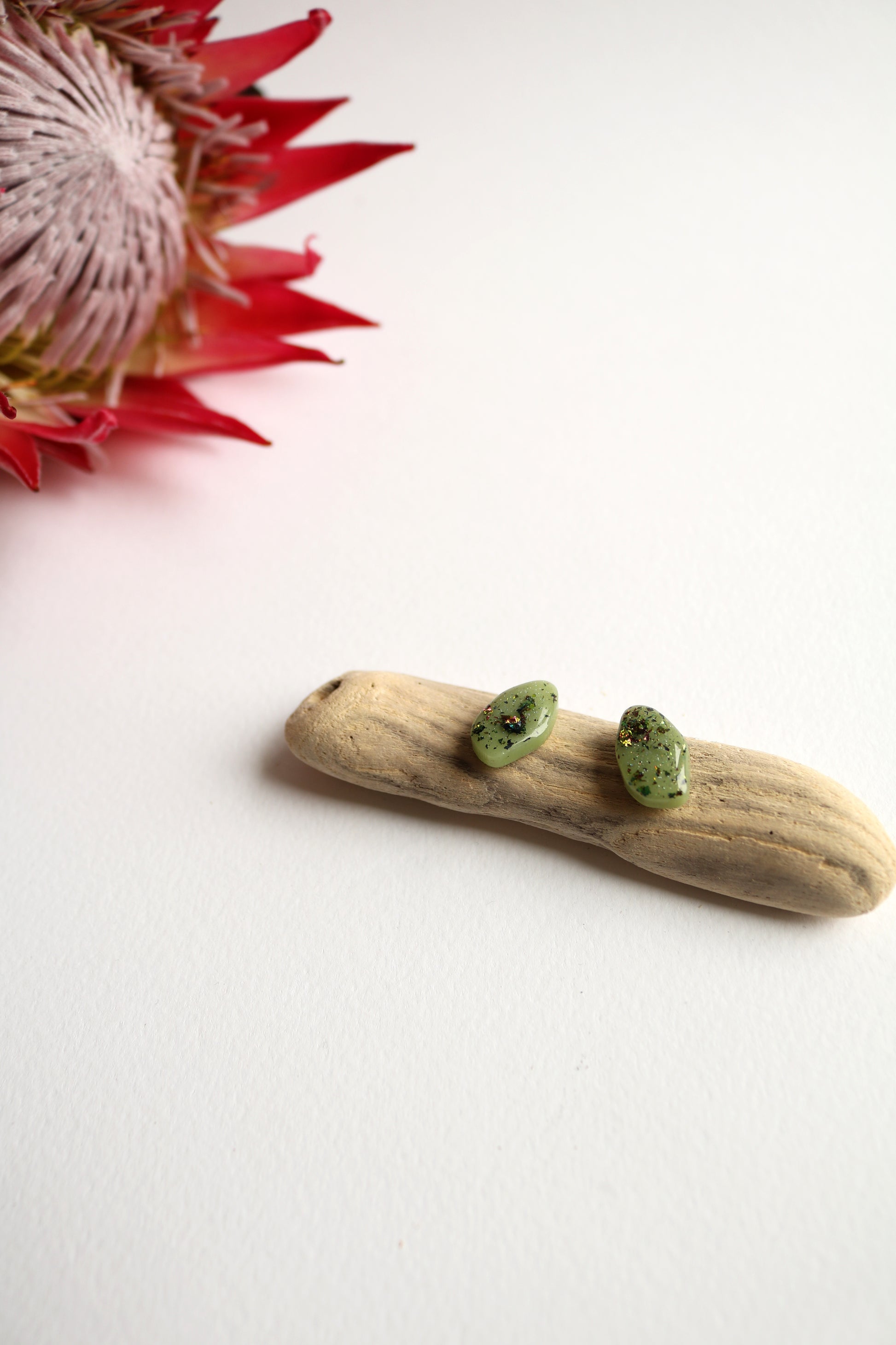 Малки обеци, изработени от епоксидна смола. Много ми напомнят на морските камъчета. Интересна форма, неправилна в нежно зелен цвят. Щифтове от неръждаема стомана.