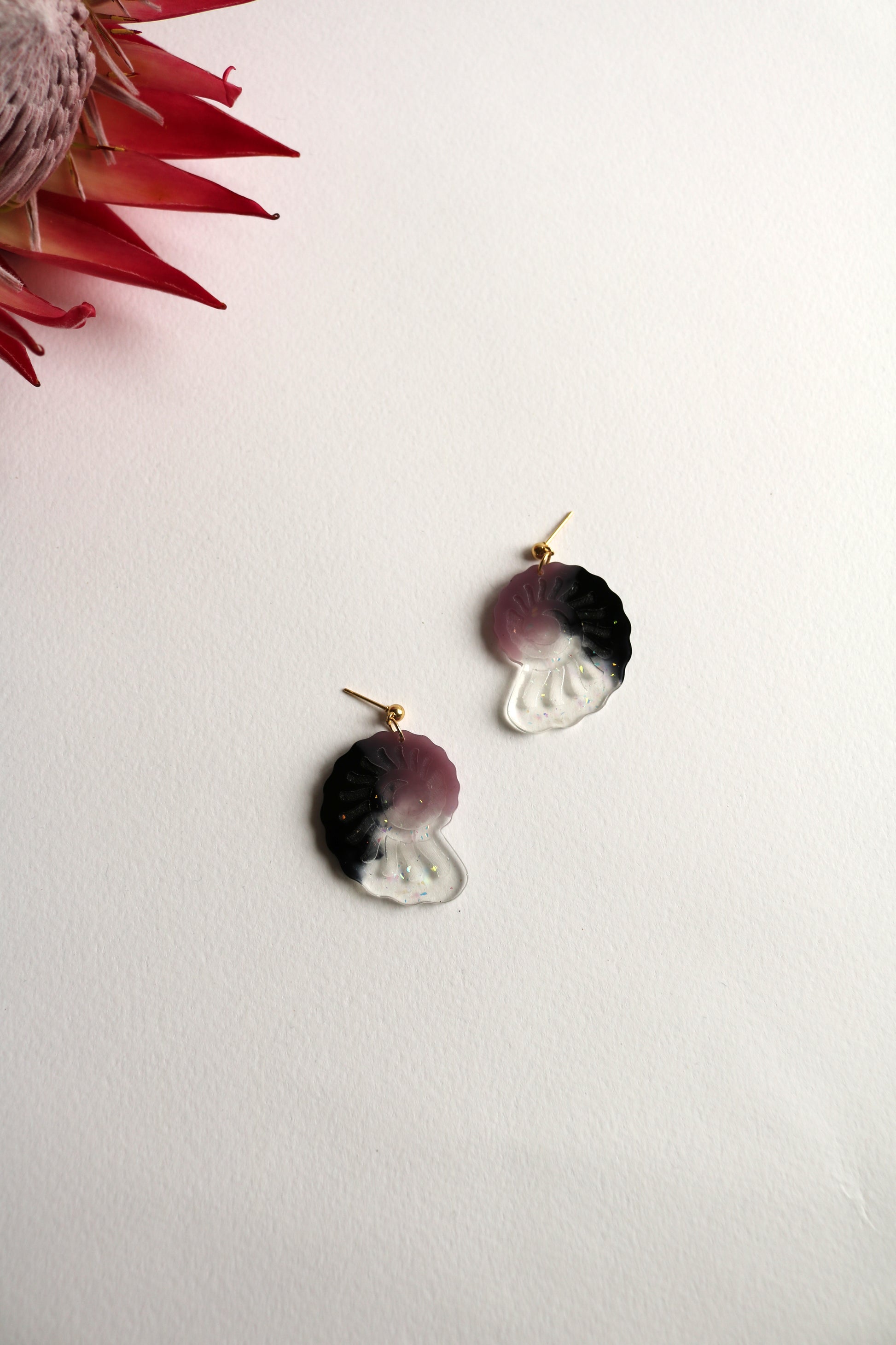 Обеци, изработени от епоксидна смола във формата на раковини. Ефирни и детайлни, те съчетават естествената красота на морските елементи с тъмна и магическа нотка. Щифтове от неръждаема стомана.