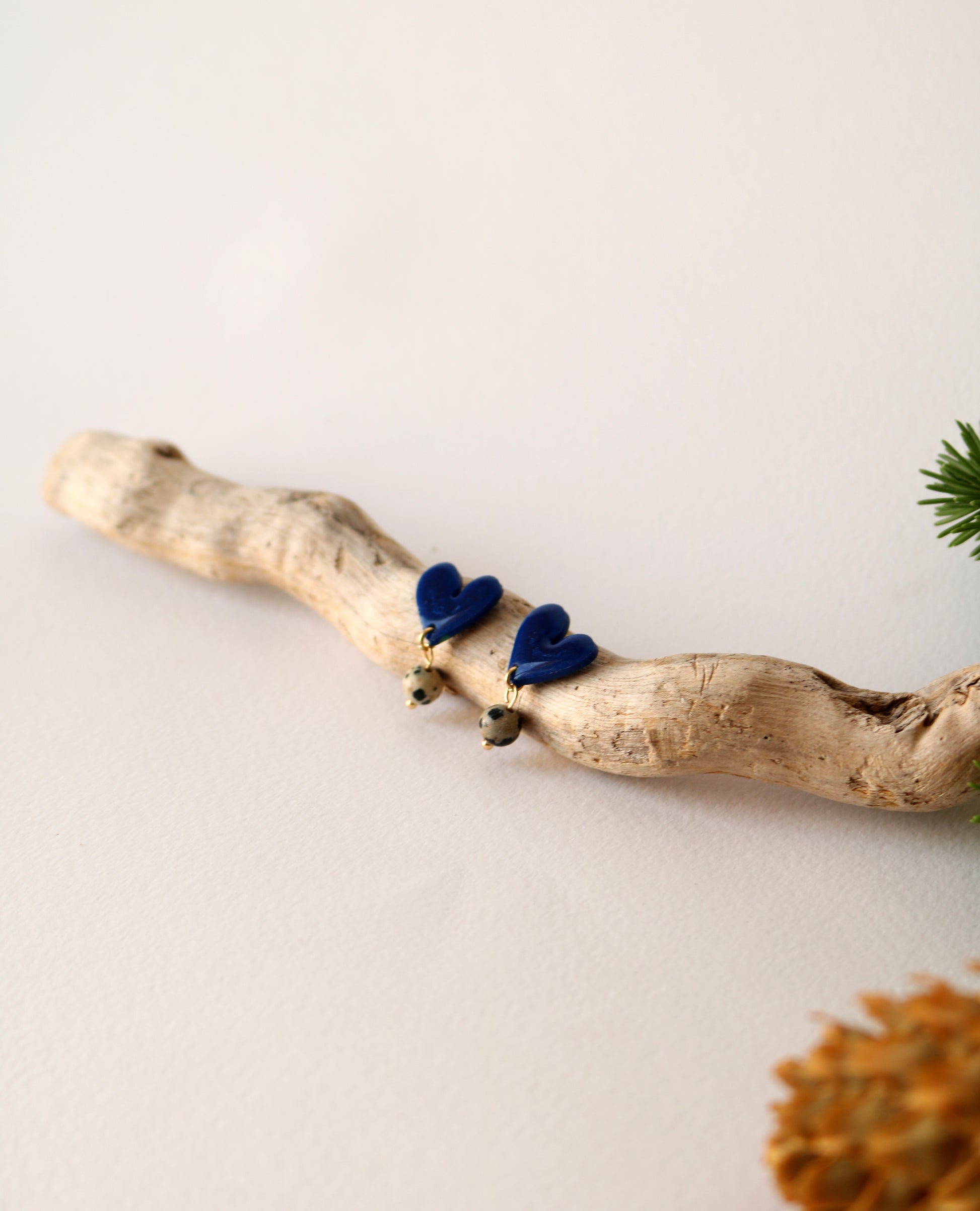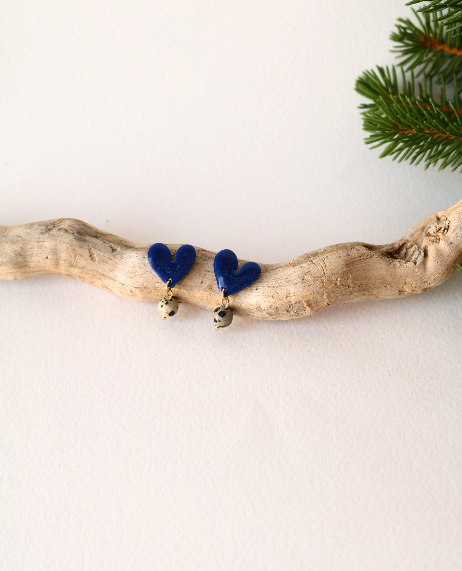 Сини сърца от смола, завършени с камъчета далматински яспис – символ на баланс и спокойствие.Уникални, леки и ръчно изработени с много внимание. Силиконови щифтове – леки, хипоалергенни и изключително удобни за целодневно носене. Не съдържат метал и не предизвикват раздразнение.