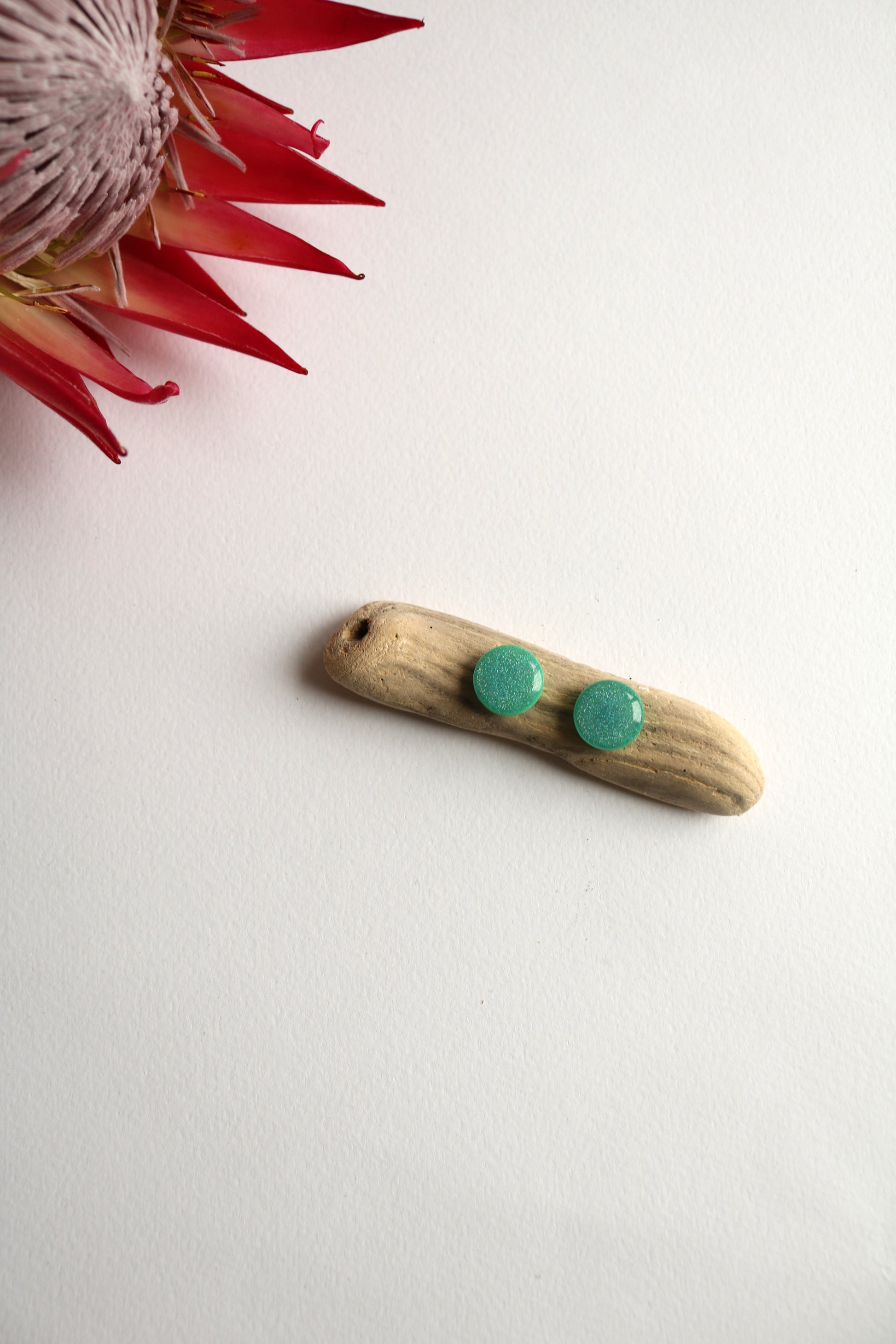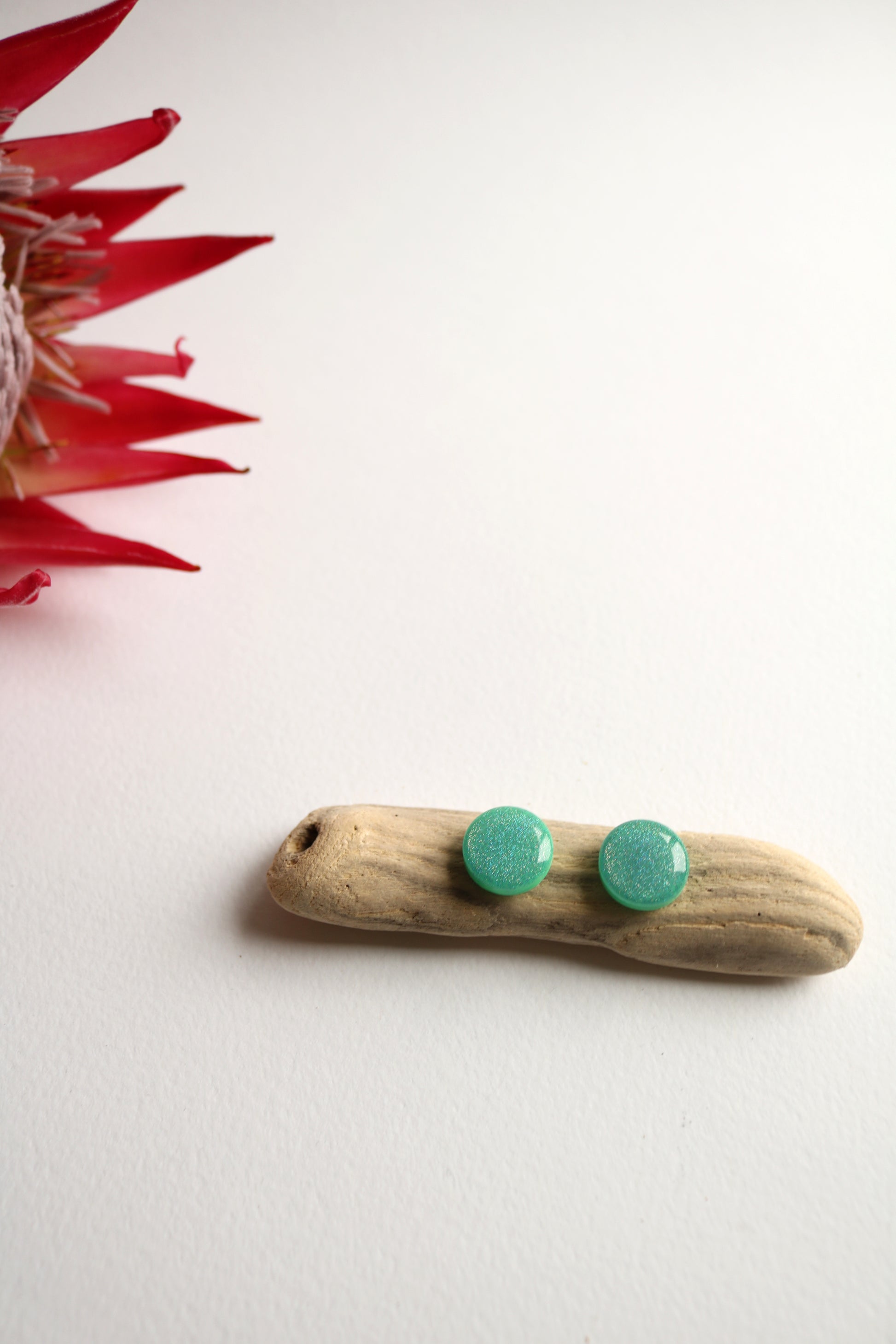 Малки обеци, изработени от епоксидна смола. Красив син цвят и нежен брокат. Щифтове от неръждаема стомана.