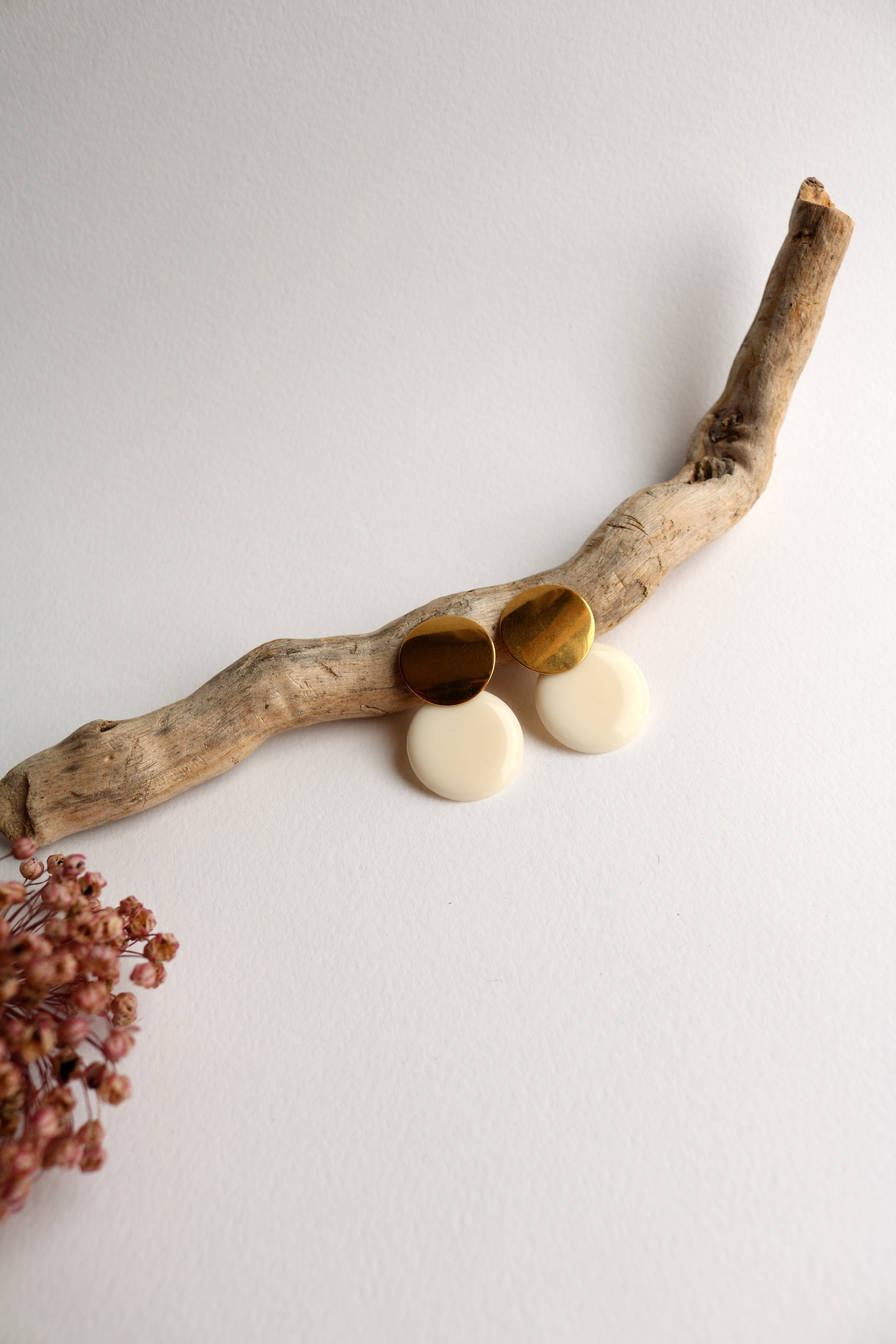 Обеци, изработени от епоксидна смола. Нежно бяло в комбинация с метал в златен цвят. Елегантни и много леки.